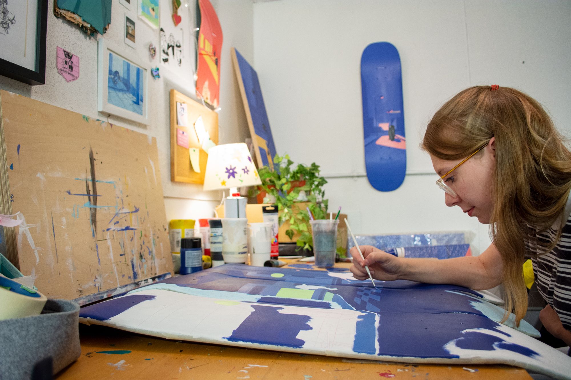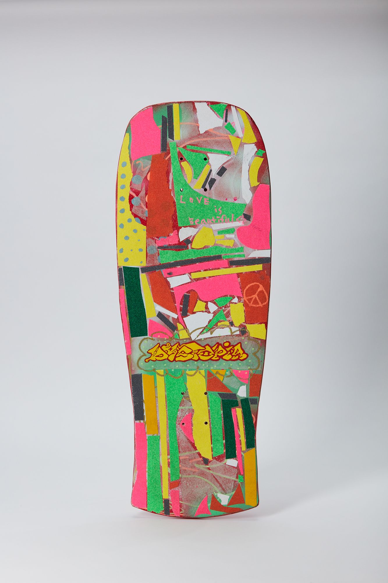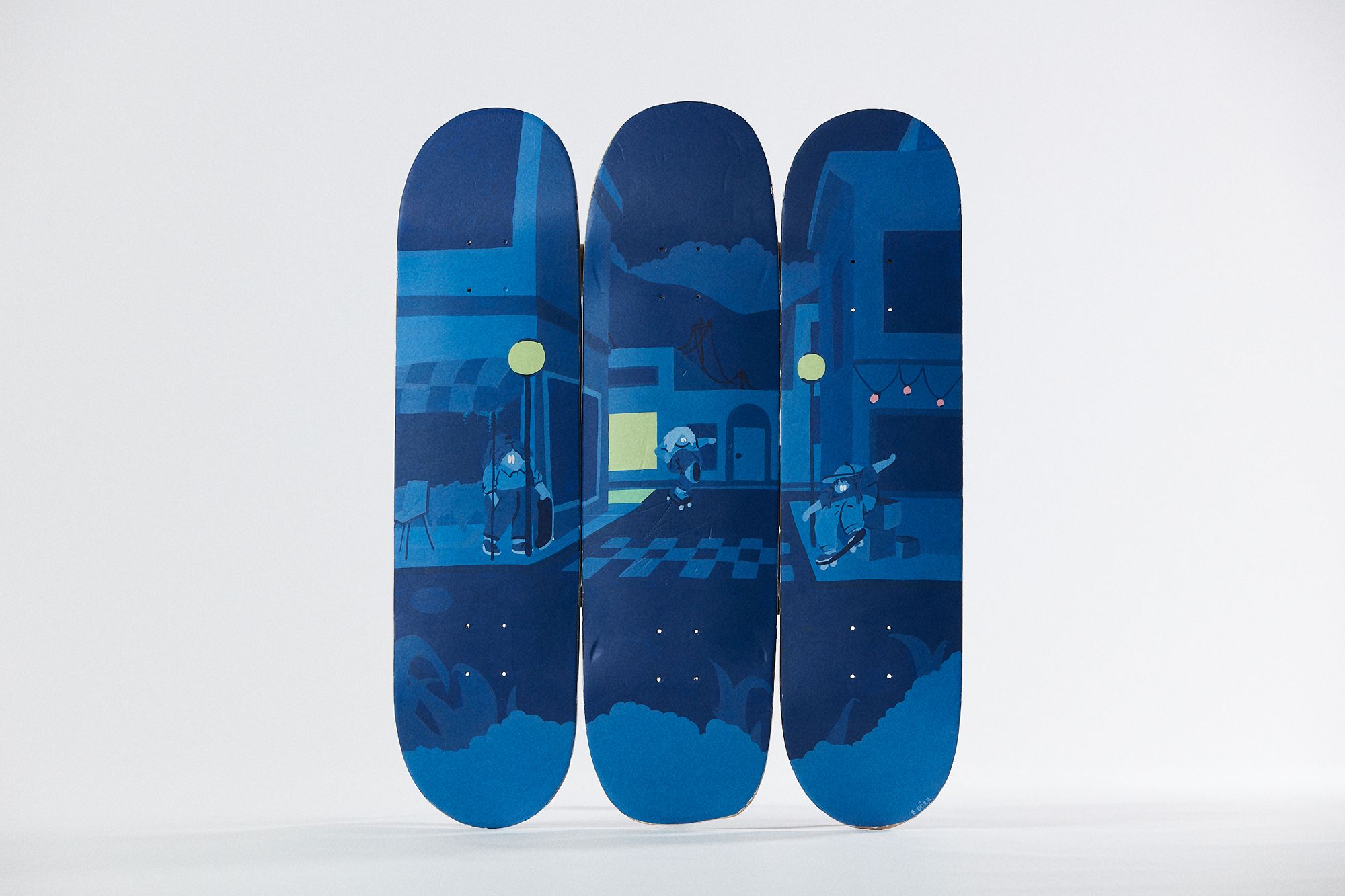 A proporre la loro forma di espressione creativa ci sono anche gli artisti londinesi Alex Jenkins ed Eloise Dörr. Illustratore e fumettista, Alex Jenkins esplora spesso argomenti critici filtrati attraverso una lente colorata e satirica. Per questo progetto, ha dato vita a uno dei suoi personaggi attraverso una scultura in fibra di vetro alta quasi due metri. Eloise Dörr è una skateboarder e artista il cui lavoro spesso presenta personaggi dello skateboarding - a volte grandi, a volte piccoli, e talvolta una via di mezzo. Per il suo progetto ha scelto di creare un dipinto su un trittico di skateboard.