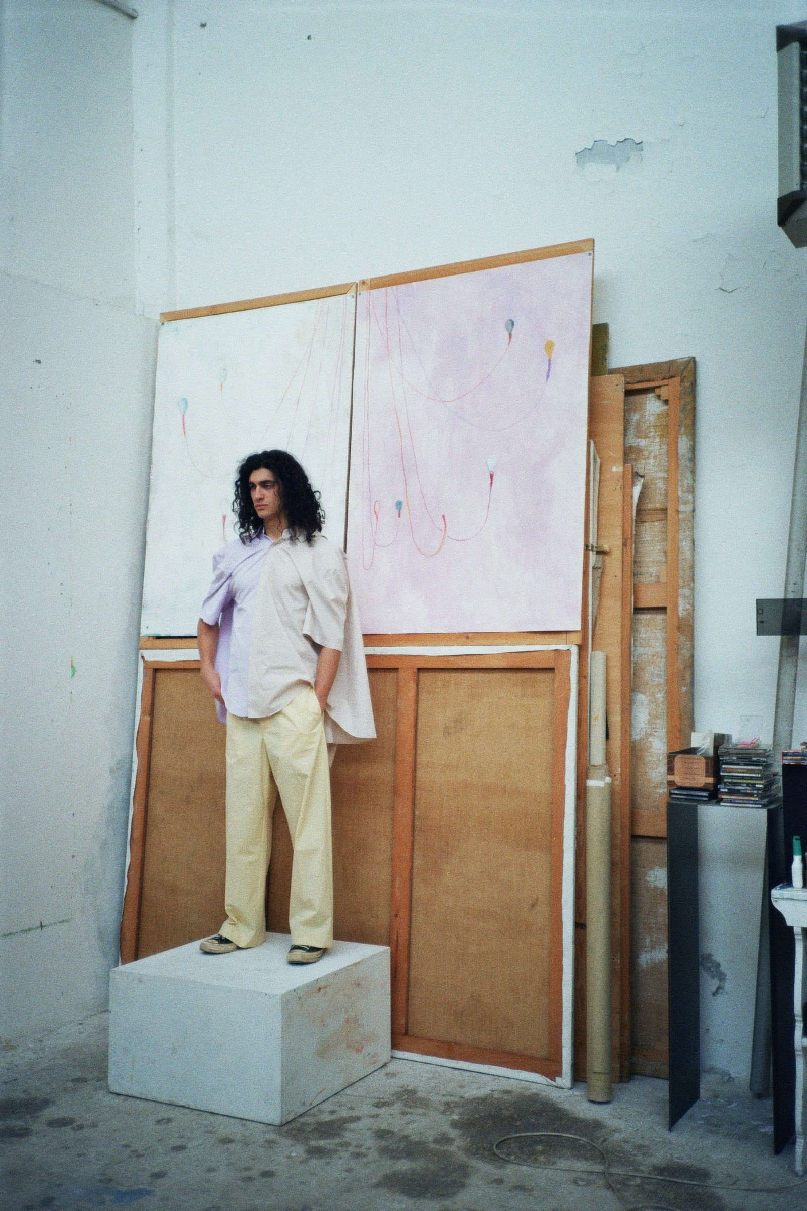 Le forme degli abiti della collezione riecheggiano nei dipinti di Vitali, che li indossa, rendendo ancora più potente la triangolazione fra la personalità dell’artista, design dei vestiti e dipinti. Il desiderio dietro questo progetto è quello di evidenziare l’identità di stimoli creativi che animano le due diverse discipline creative e sottolineare le sinergie possibili fra i loro diversi output.