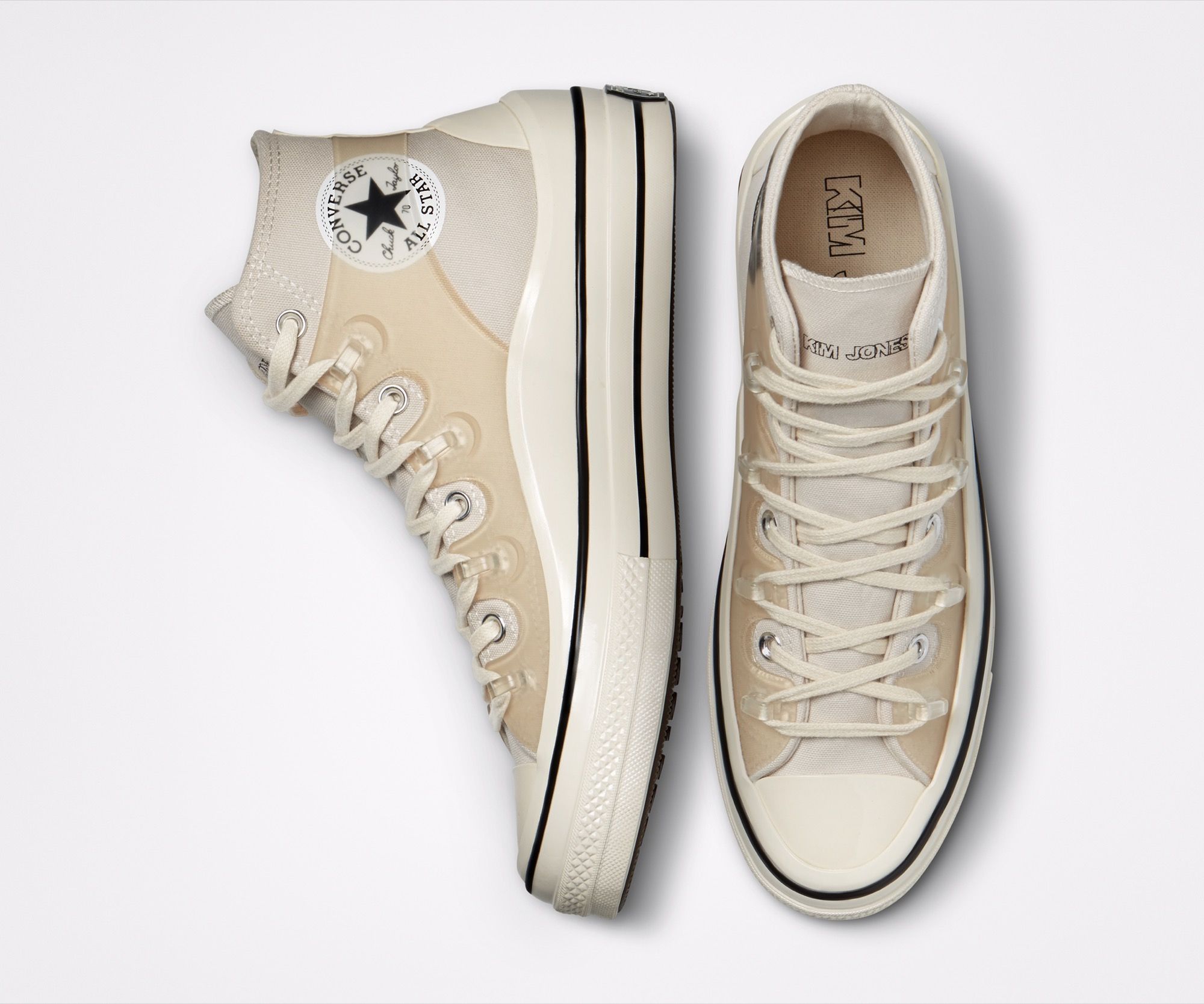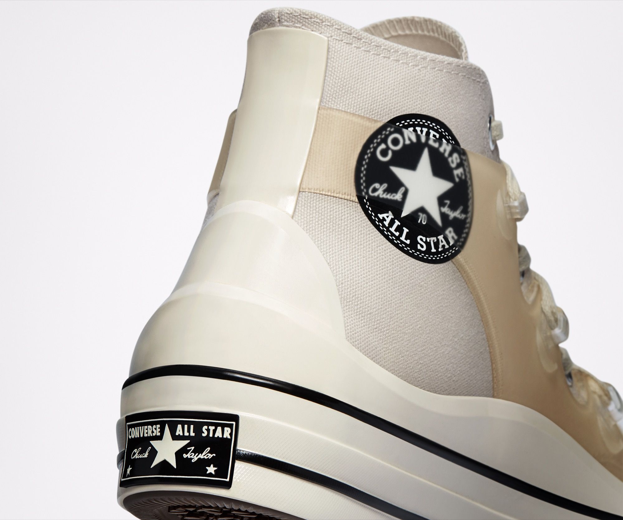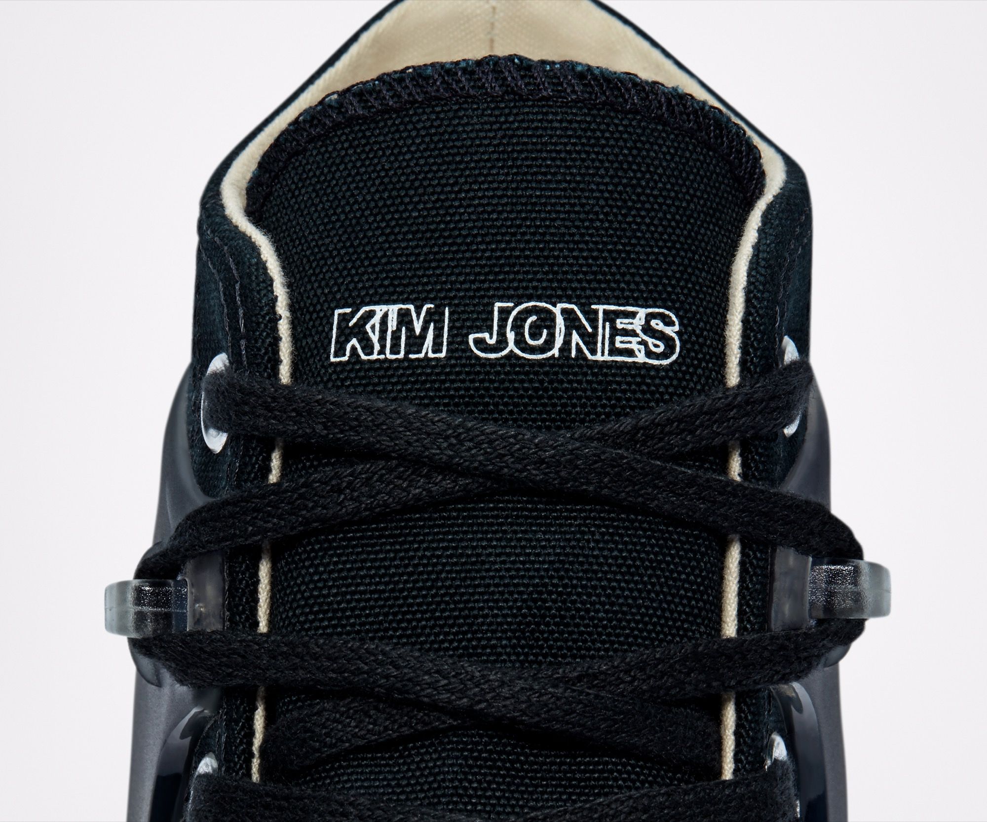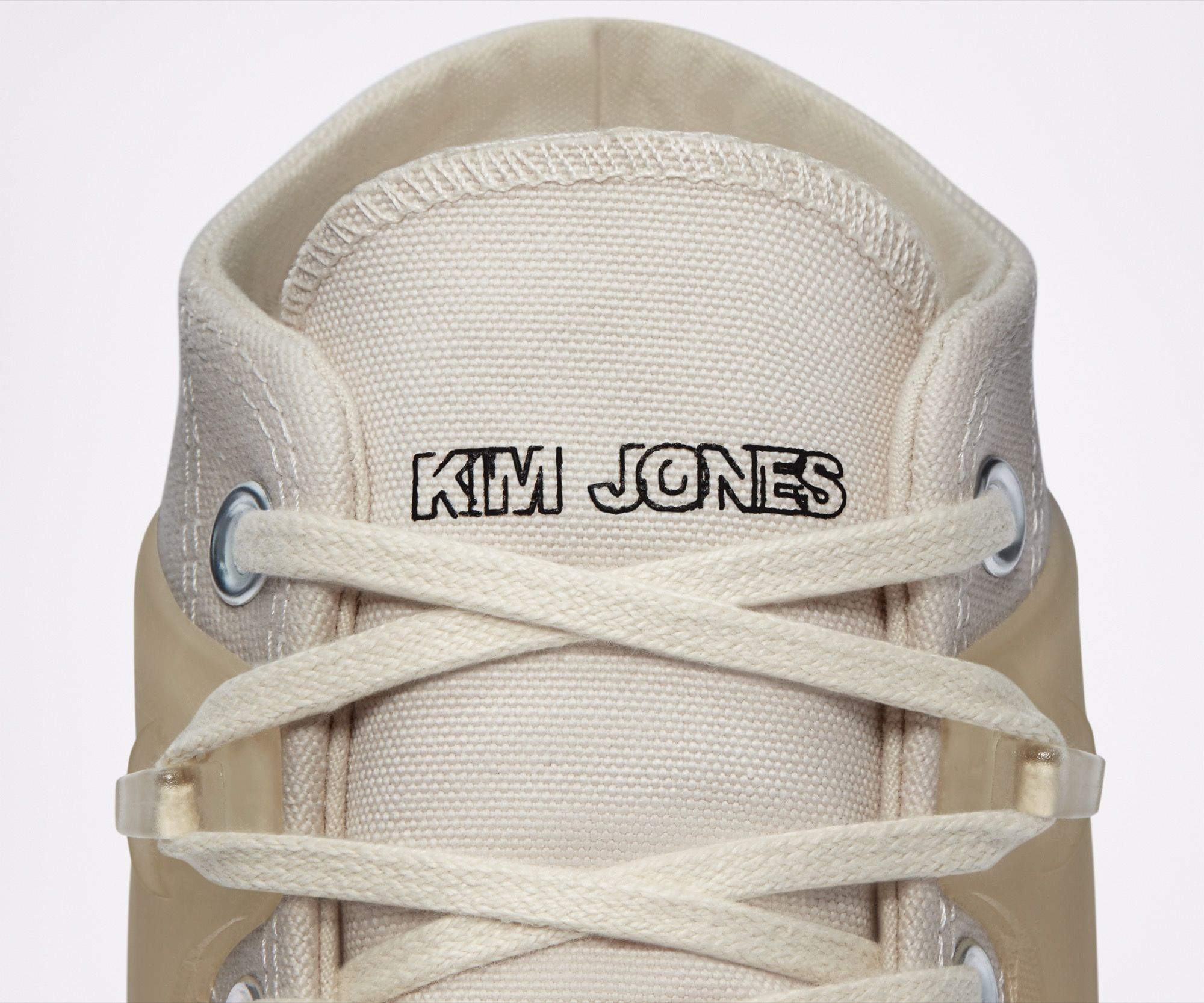 "L'approccio al design della scarpa è stato molto diretto: l'idea era prendere una scarpa molto classica e racchiuderla in qualcosa che la proteggesse", ha dichiarato infatti Jones. La Chuck 70 firmata Jones è caratterizzata da una midsole in gomma curva e allungata, che diventa protagonista per tutta la lunghezza della scarpa, che è proposta nella classica versione in tela. La tomaia è arricchita inoltre da una sorta di "gabbia" trasparente in TPU che si estende dai lacci fino al tallone, evocando proprio quell'idea di protezione descritta da Jones.