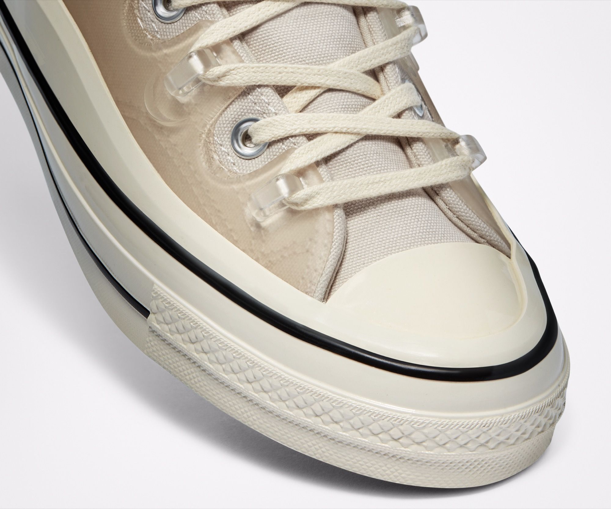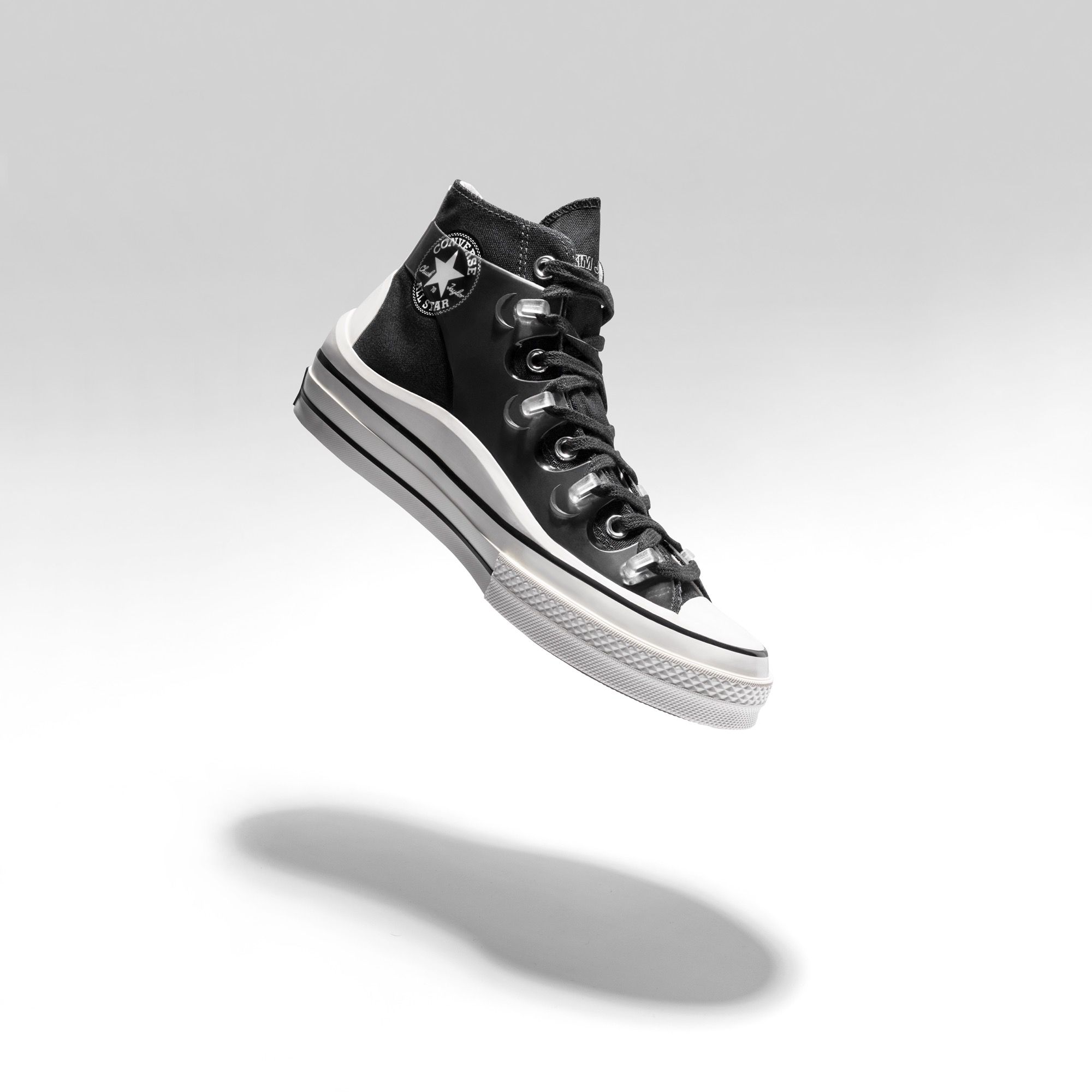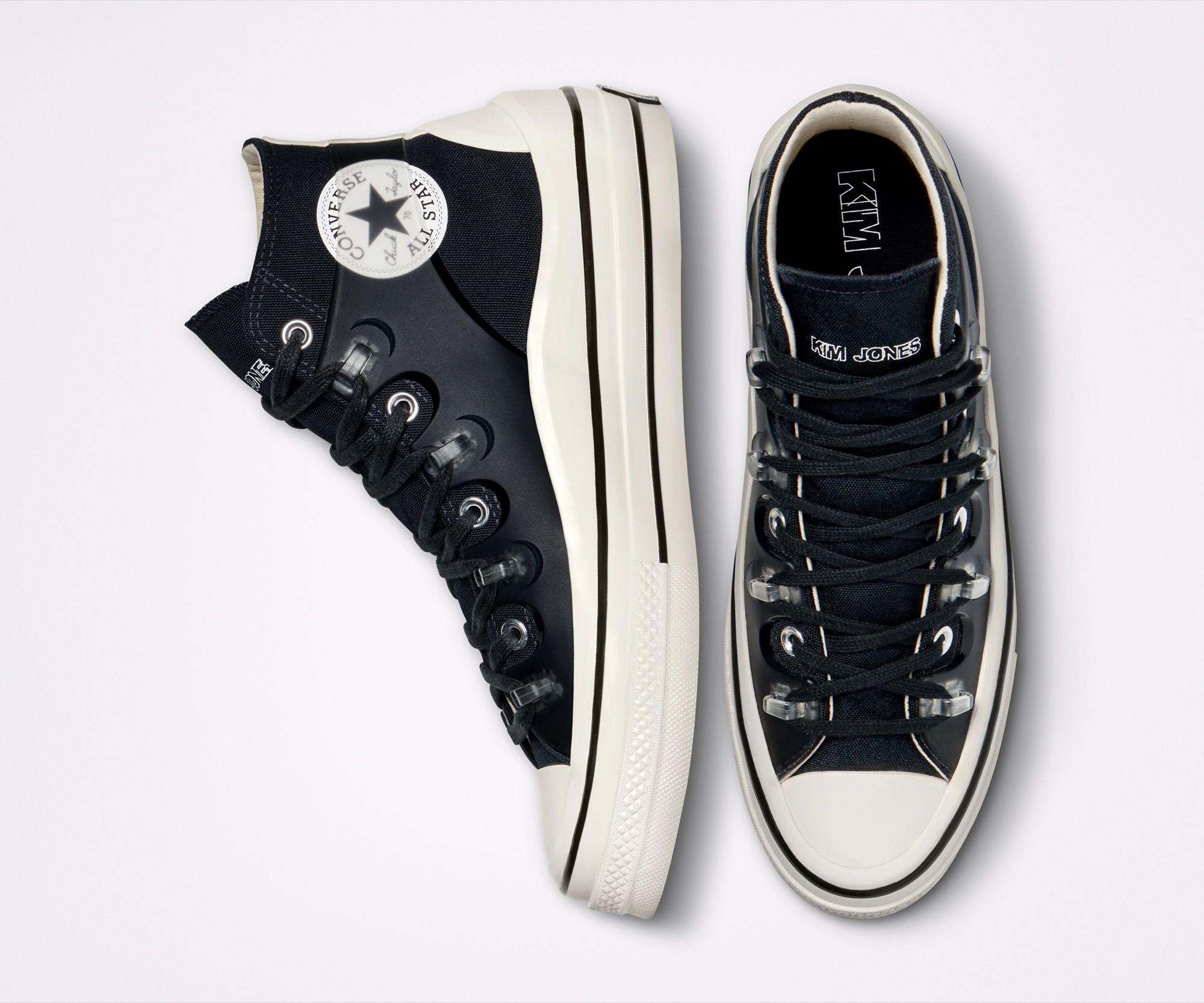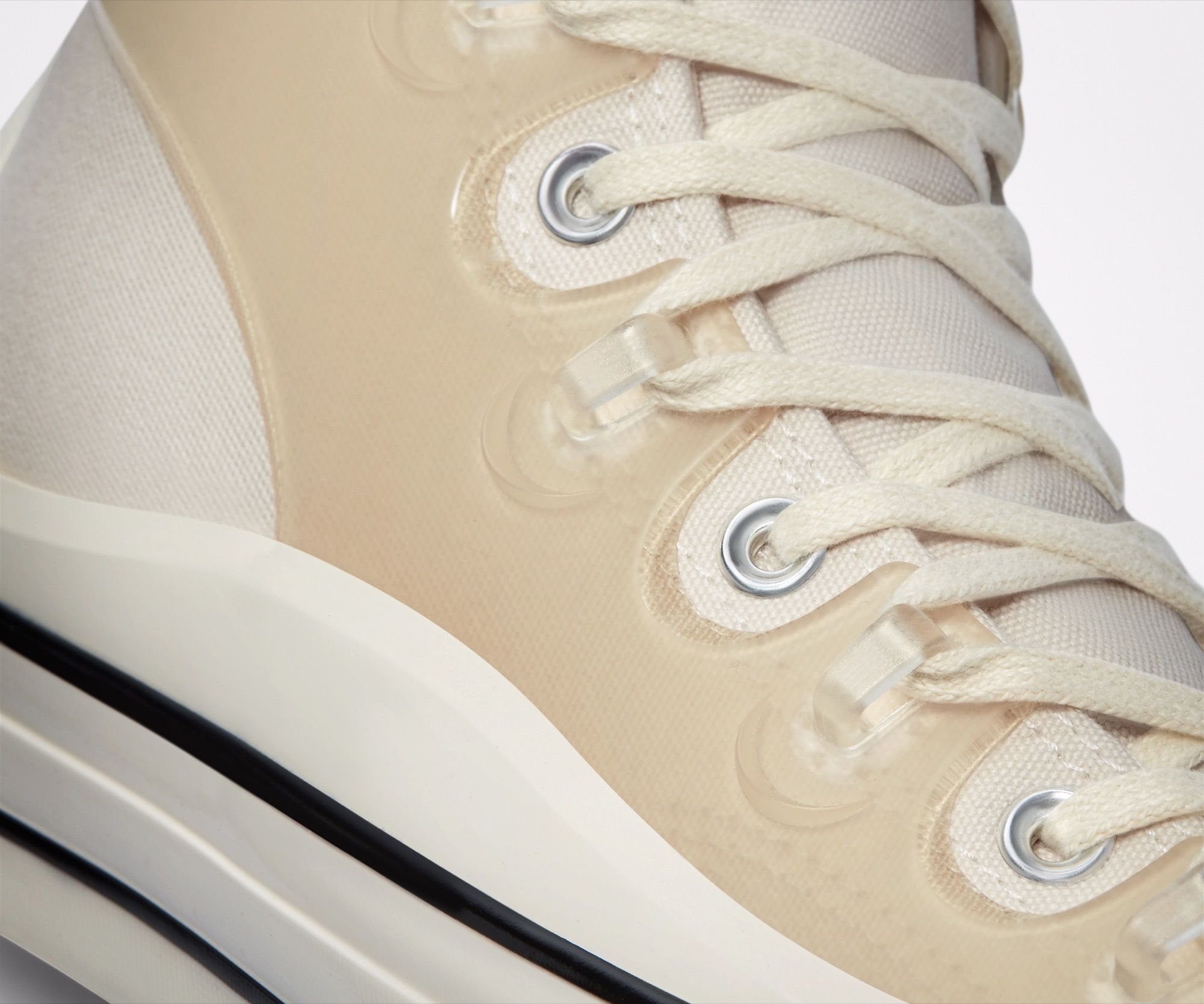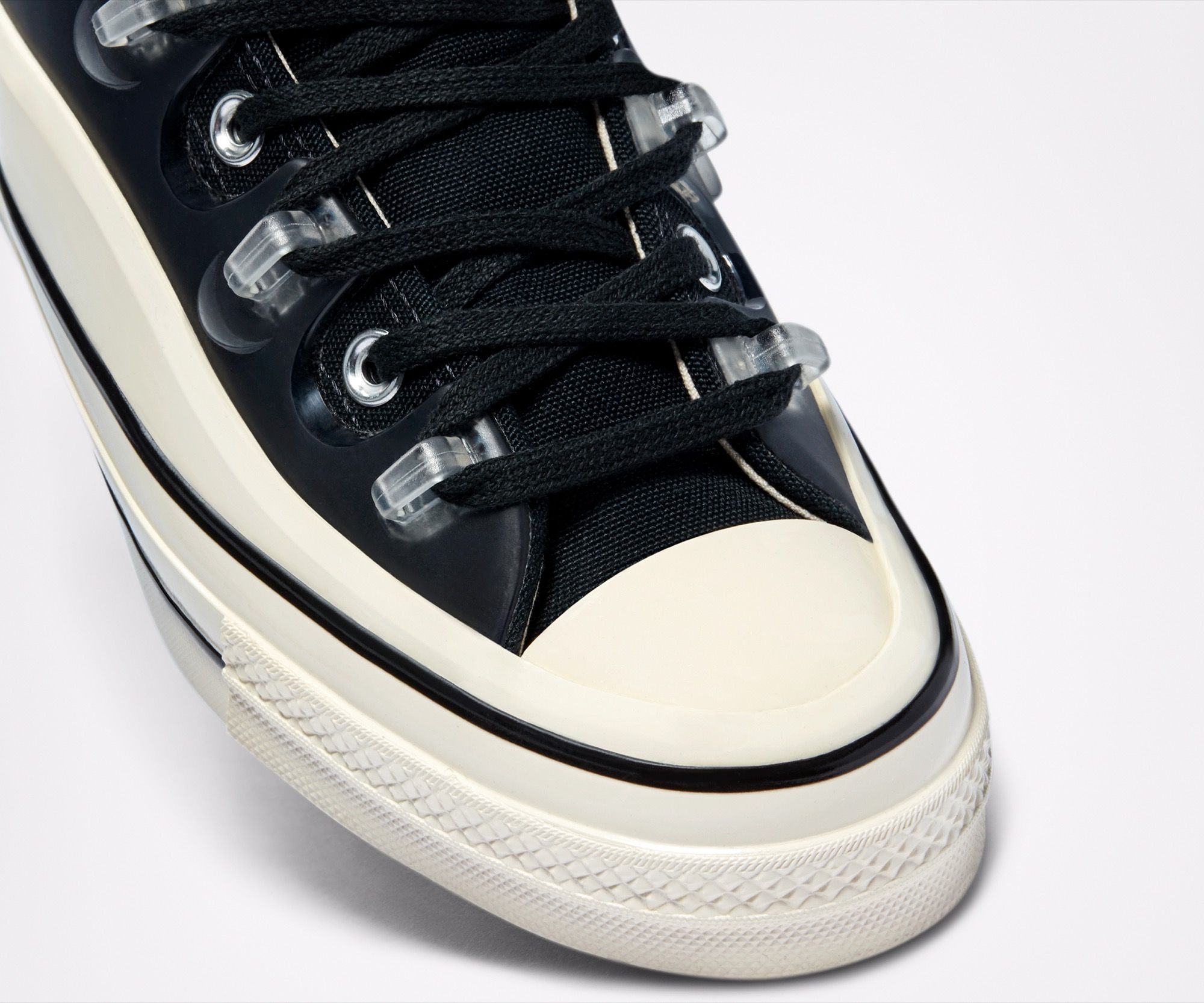 "L'approccio al design della scarpa è stato molto diretto: l'idea era prendere una scarpa molto classica e racchiuderla in qualcosa che la proteggesse", ha dichiarato infatti Jones. La Chuck 70 firmata Jones è caratterizzata da una midsole in gomma curva e allungata, che diventa protagonista per tutta la lunghezza della scarpa, che è proposta nella classica versione in tela. La tomaia è arricchita inoltre da una sorta di "gabbia" trasparente in TPU che si estende dai lacci fino al tallone, evocando proprio quell'idea di protezione descritta da Jones.
