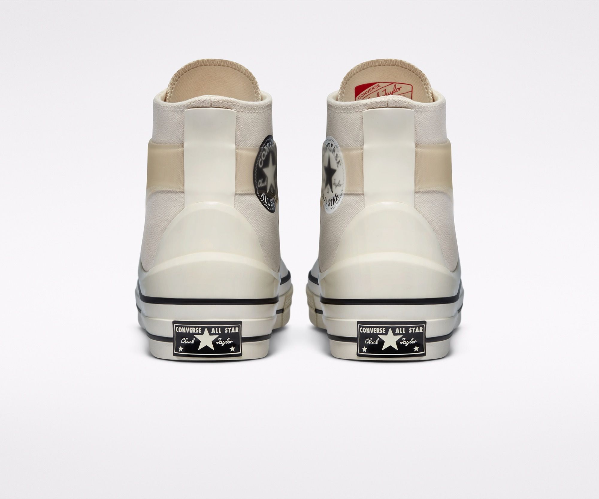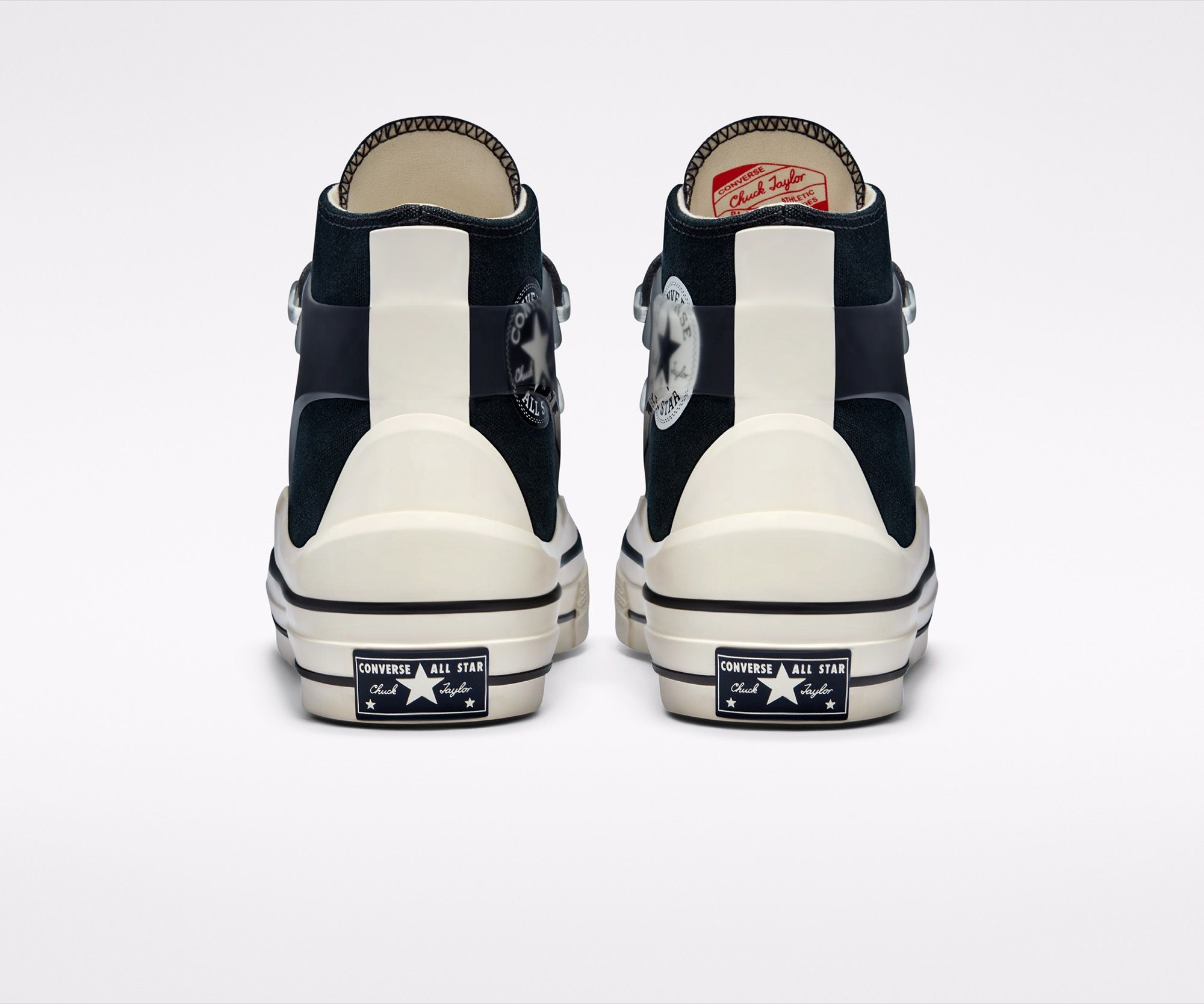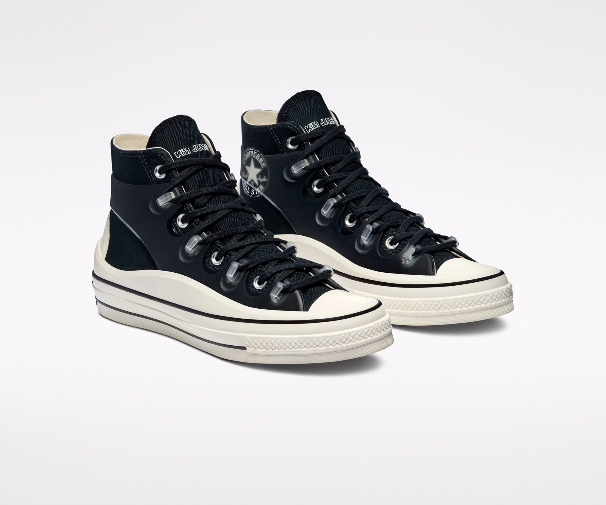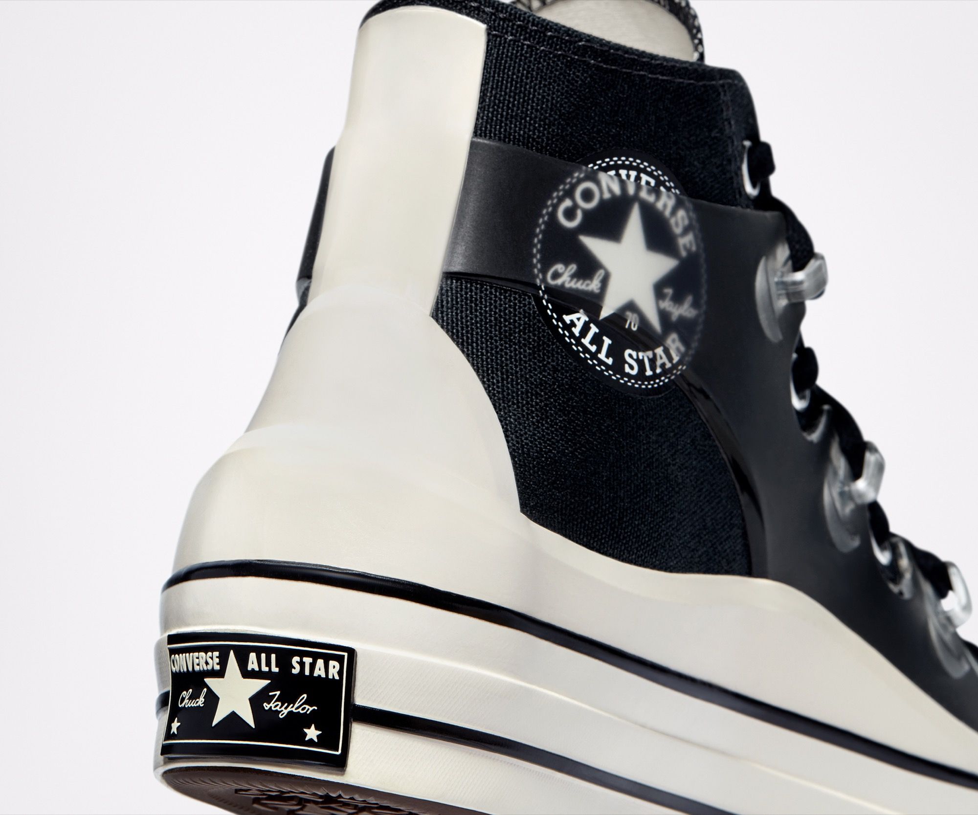 "L'approccio al design della scarpa è stato molto diretto: l'idea era prendere una scarpa molto classica e racchiuderla in qualcosa che la proteggesse", ha dichiarato infatti Jones. La Chuck 70 firmata Jones è caratterizzata da una midsole in gomma curva e allungata, che diventa protagonista per tutta la lunghezza della scarpa, che è proposta nella classica versione in tela. La tomaia è arricchita inoltre da una sorta di "gabbia" trasparente in TPU che si estende dai lacci fino al tallone, evocando proprio quell'idea di protezione descritta da Jones.