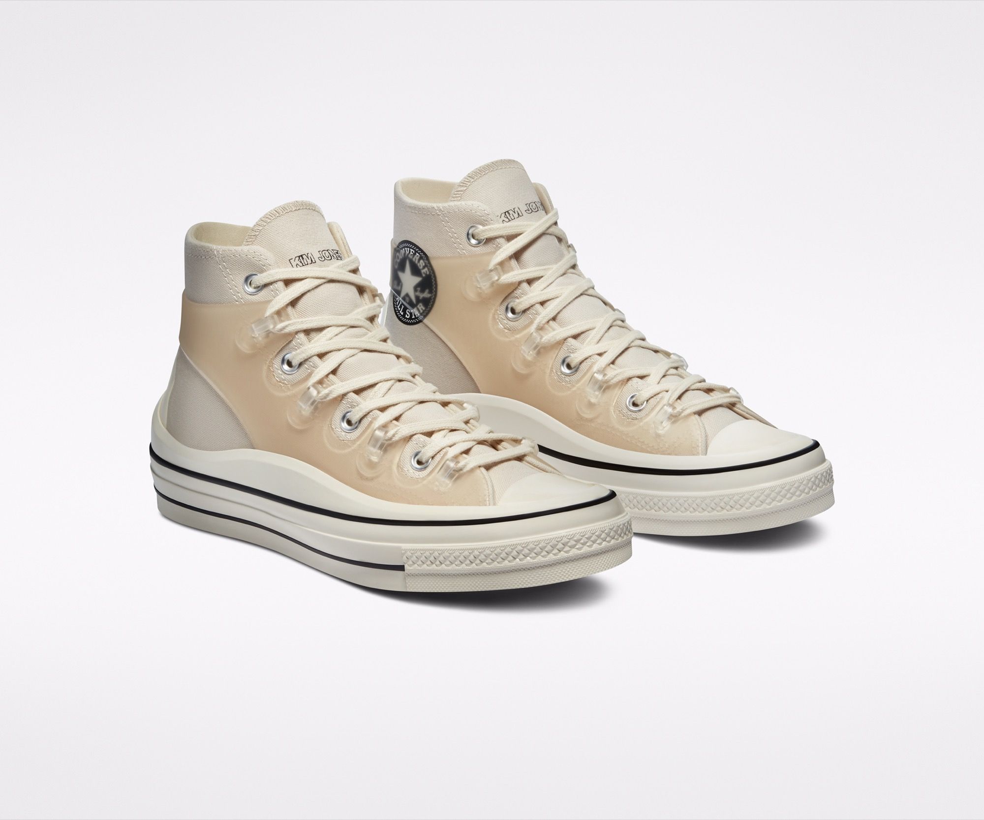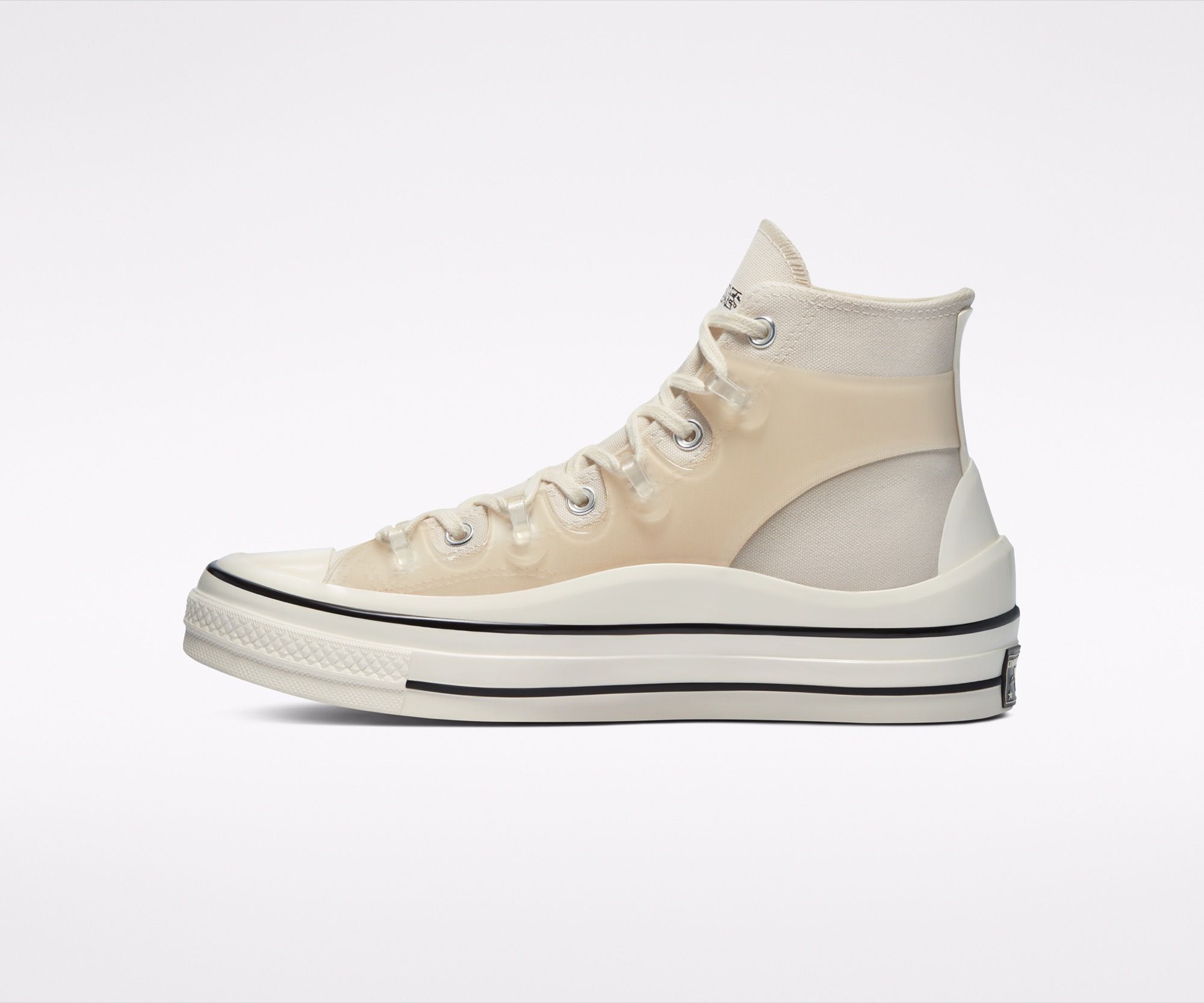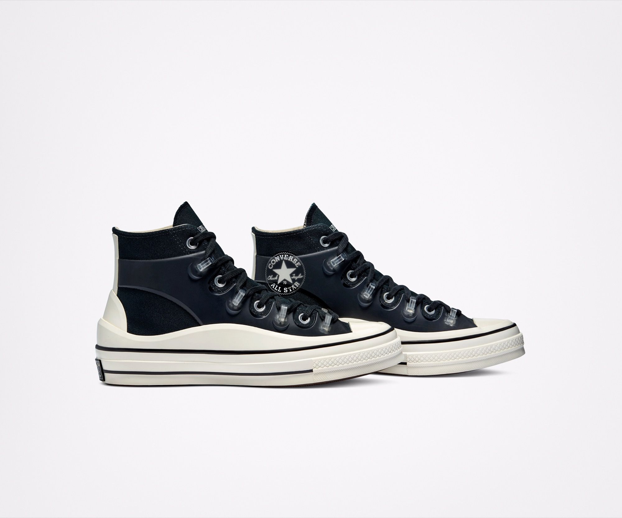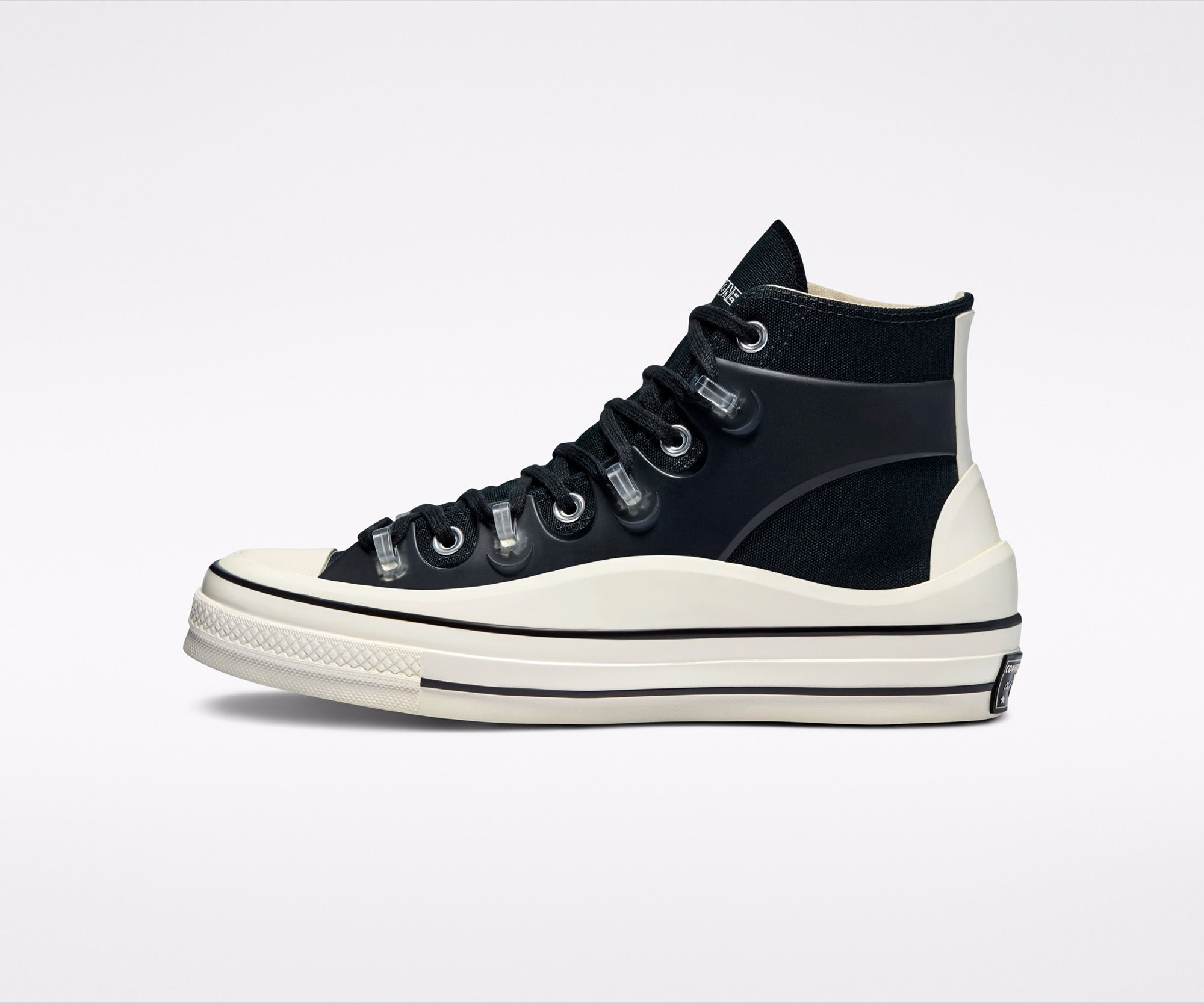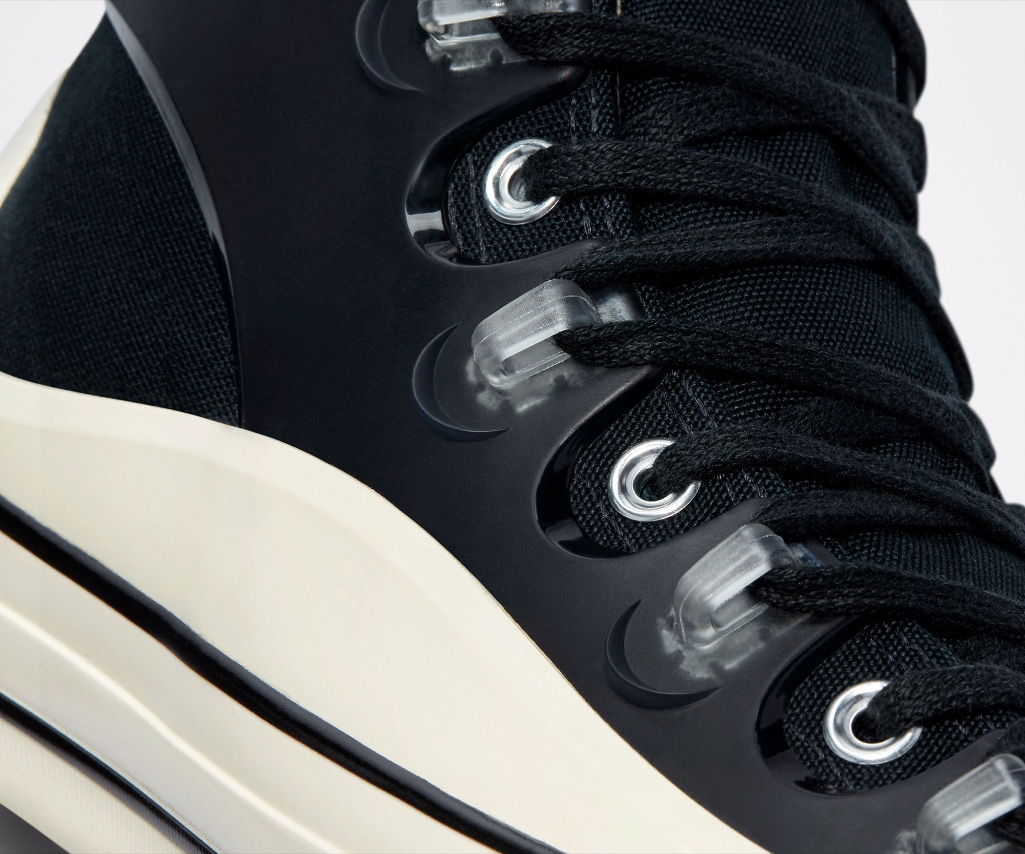 "L'approccio al design della scarpa è stato molto diretto: l'idea era prendere una scarpa molto classica e racchiuderla in qualcosa che la proteggesse", ha dichiarato infatti Jones. La Chuck 70 firmata Jones è caratterizzata da una midsole in gomma curva e allungata, che diventa protagonista per tutta la lunghezza della scarpa, che è proposta nella classica versione in tela. La tomaia è arricchita inoltre da una sorta di "gabbia" trasparente in TPU che si estende dai lacci fino al tallone, evocando proprio quell'idea di protezione descritta da Jones.