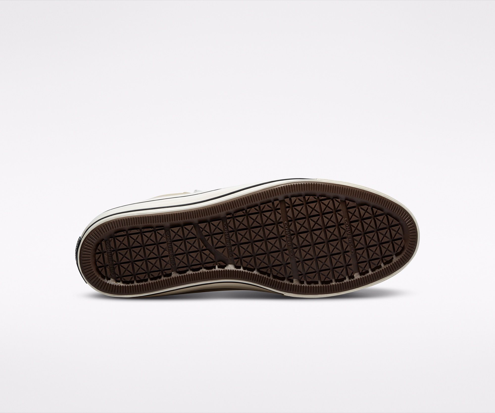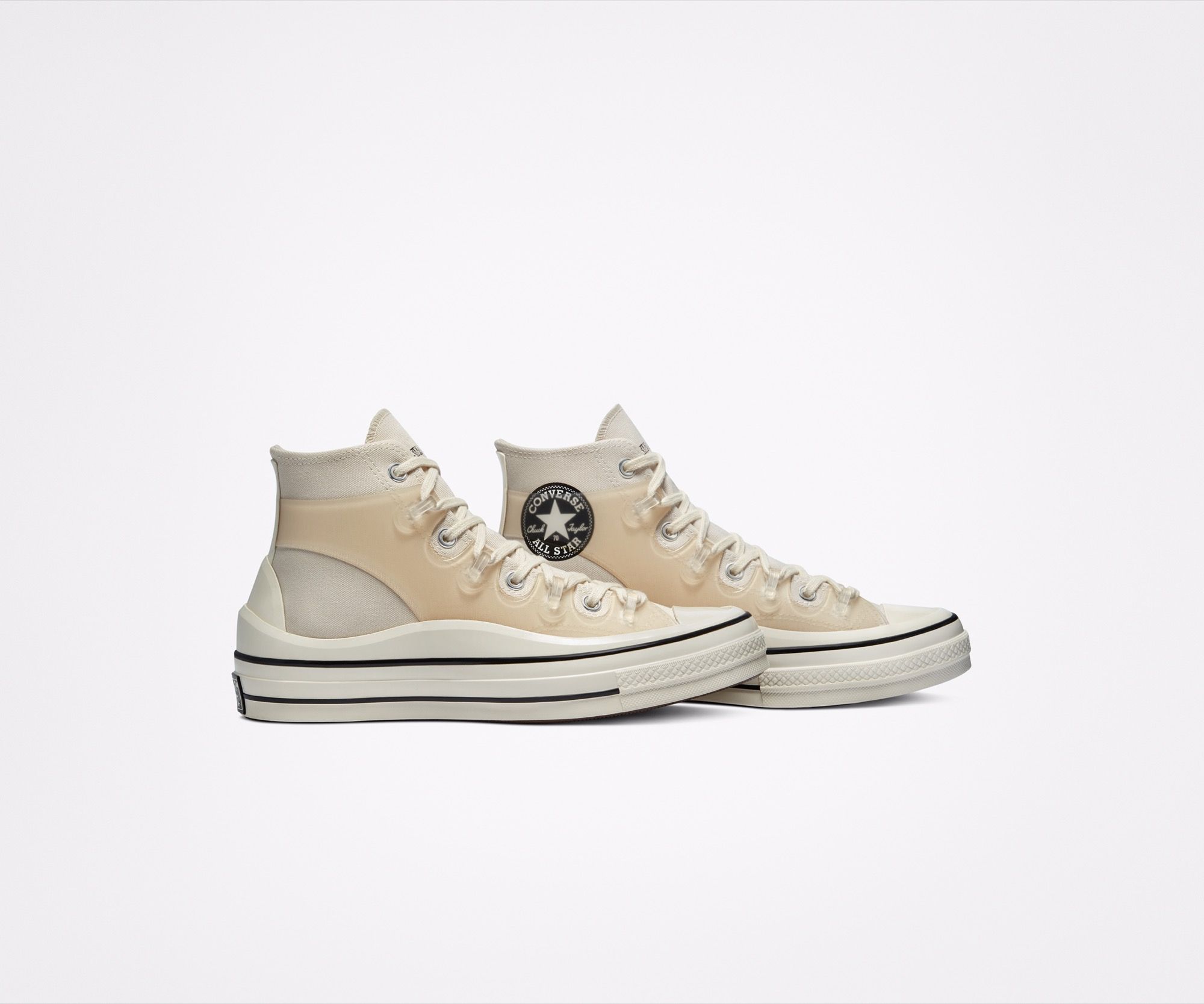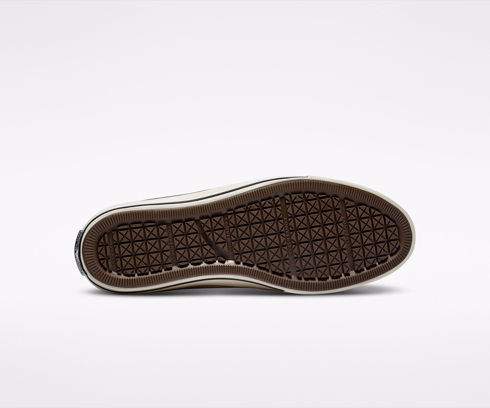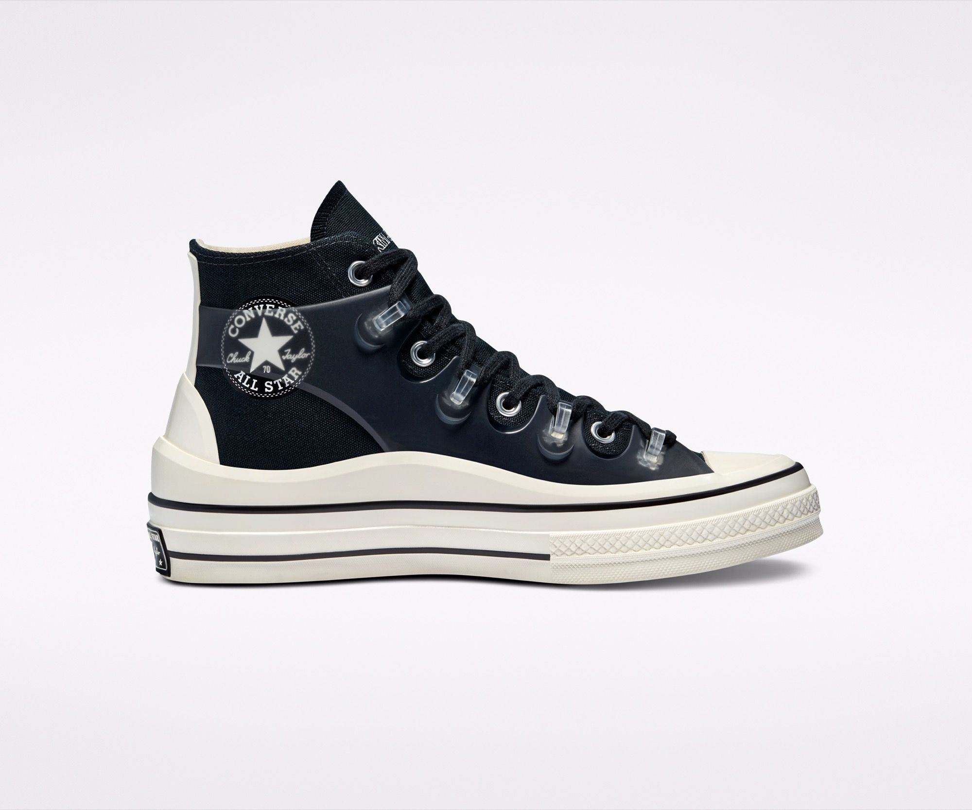 "L'approccio al design della scarpa è stato molto diretto: l'idea era prendere una scarpa molto classica e racchiuderla in qualcosa che la proteggesse", ha dichiarato infatti Jones. La Chuck 70 firmata Jones è caratterizzata da una midsole in gomma curva e allungata, che diventa protagonista per tutta la lunghezza della scarpa, che è proposta nella classica versione in tela. La tomaia è arricchita inoltre da una sorta di "gabbia" trasparente in TPU che si estende dai lacci fino al tallone, evocando proprio quell'idea di protezione descritta da Jones.