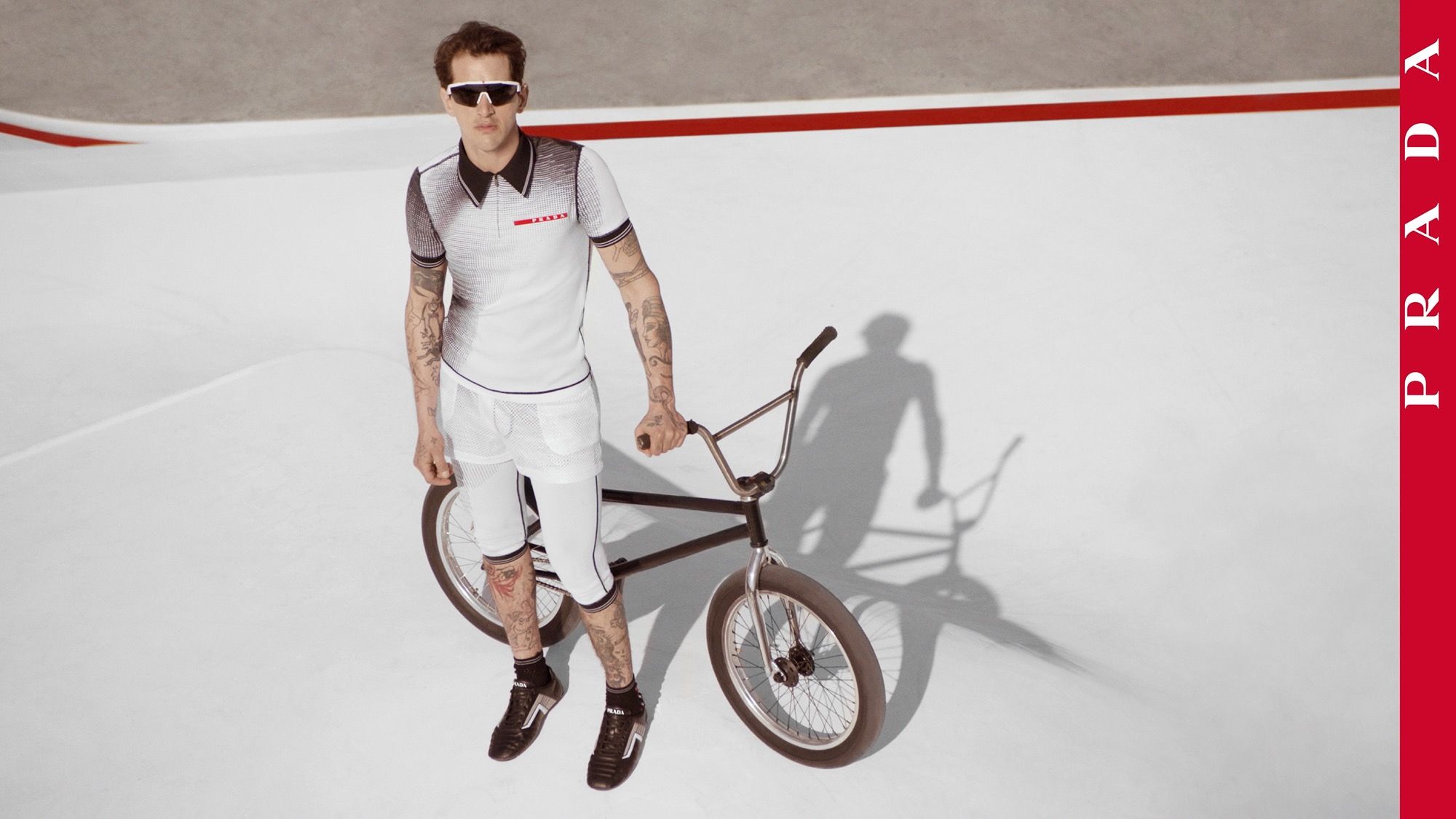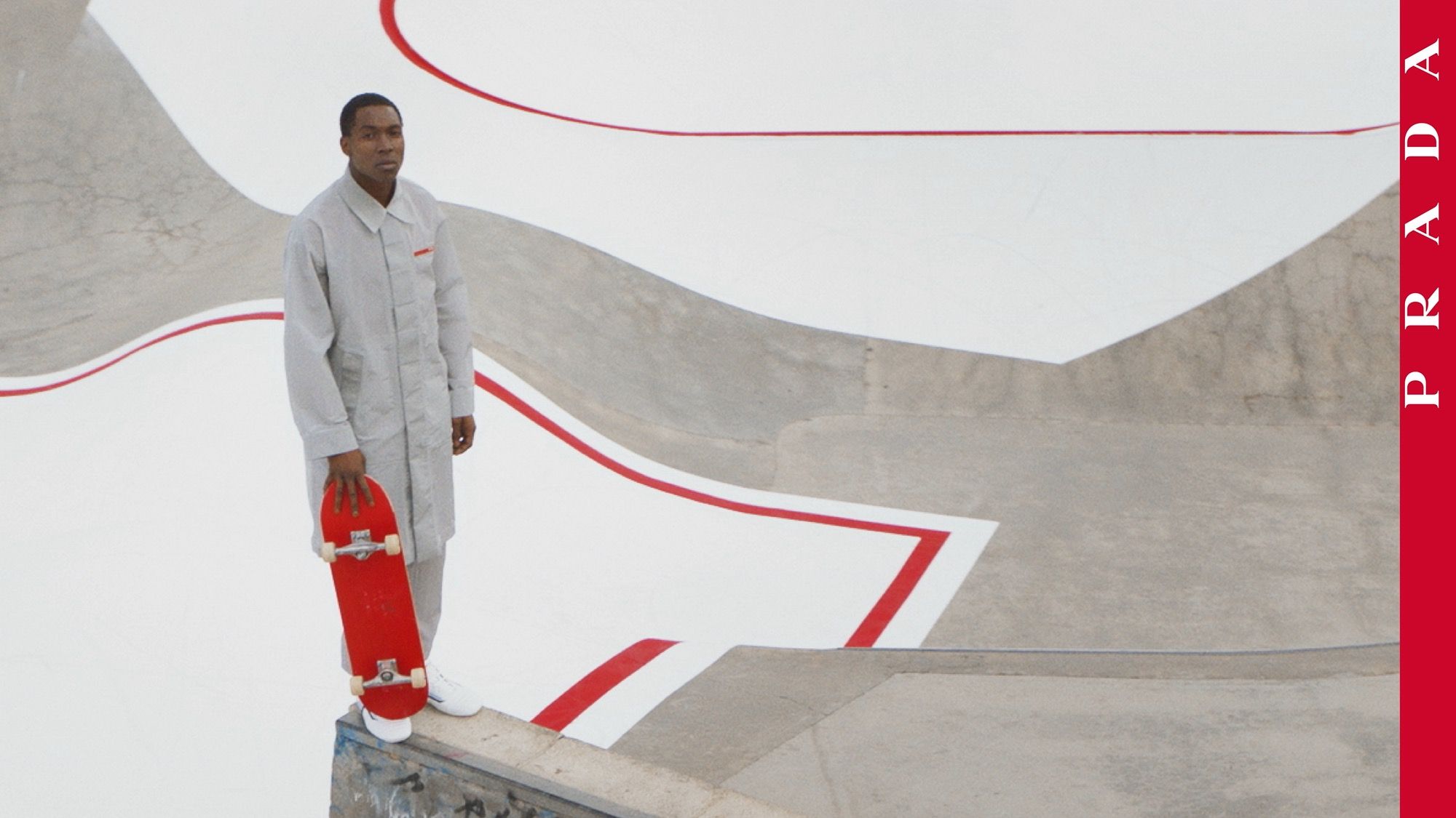 I volti scelti per interpretare la nuova collezione di Prada Linea Rossa vantano un legame diretto con il mondo dello skate o della BMX. Troviamo infatti Cai Xu Kun, cantautore e produttore discografico cinese di fama mondiale, le cui molteplici abilità includono anche il pattinaggio in linea; Briana King, skateboarder, modella e community organizer, nota per il suo ruolo nell’organizzazione e partecipazione ai raduni di skateboard femminile e queer in tutto il mondo; Rachelle Vinberg, attrice e skateboarder divenuta molto nota con il film Skate Kitchen; Austin Augie, fotografo e pluripremiato professionista di BMX, con oltre mezzo milione di iscritti al suo canale YouTube; e infine, Le’Andre Sanders, talentoso skateboarder originario di Los Angeles. Ognuno di questi personaggi si muove negli spazi immediatamente riconoscibili dei campi sportivi, riconfigurati e reinventati attraverso l’iconica linea rossa.