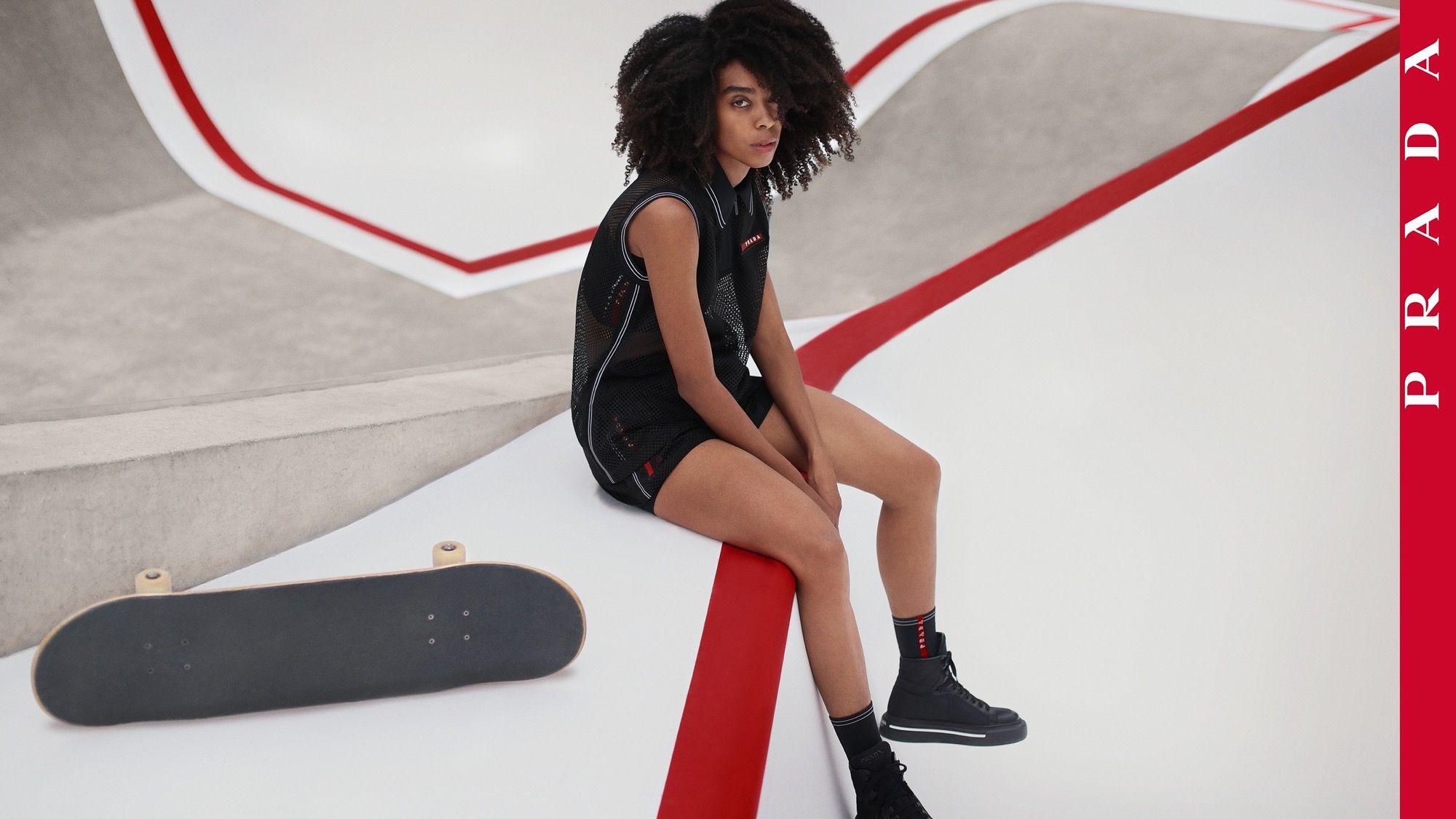 Per la proposta dedicata alla stagione SS21, ora svelata in una campagna pubblicitaria scattata da Martine Syms, Prada Linea Rossa torna ad insistere su quell'elemento originario, reinventando quella linea rossa, proponendola come demarcazione degli spazi destinati allo sport, un segno universale riconosciuto dalle comunità di tutto il mondo. La linea rossa contraddistingue e accomuna i diversi skate park di Los Angeles e Shanghai, che diventano i protagonisti degli scatti.