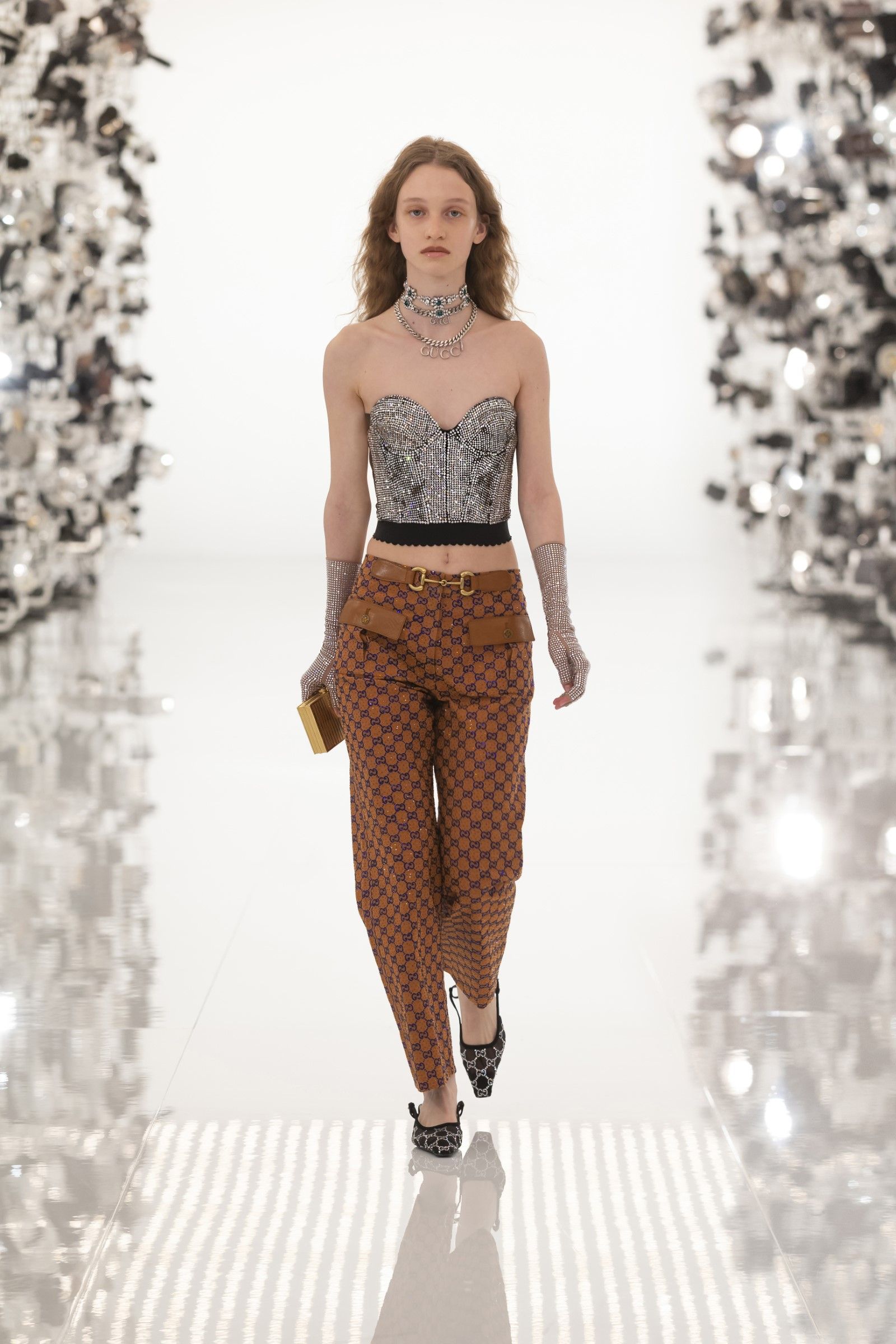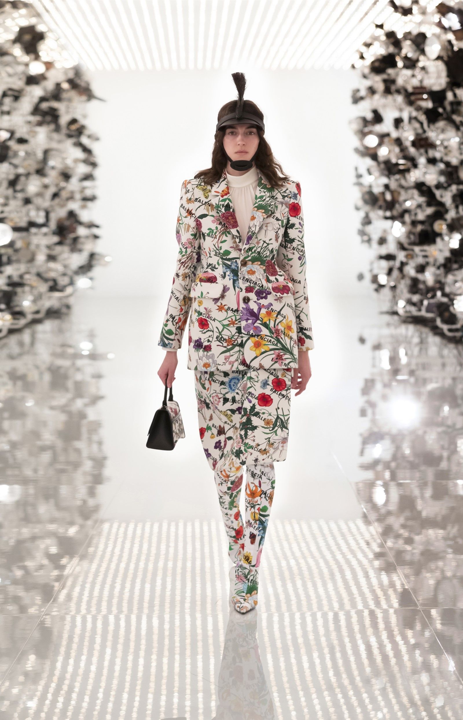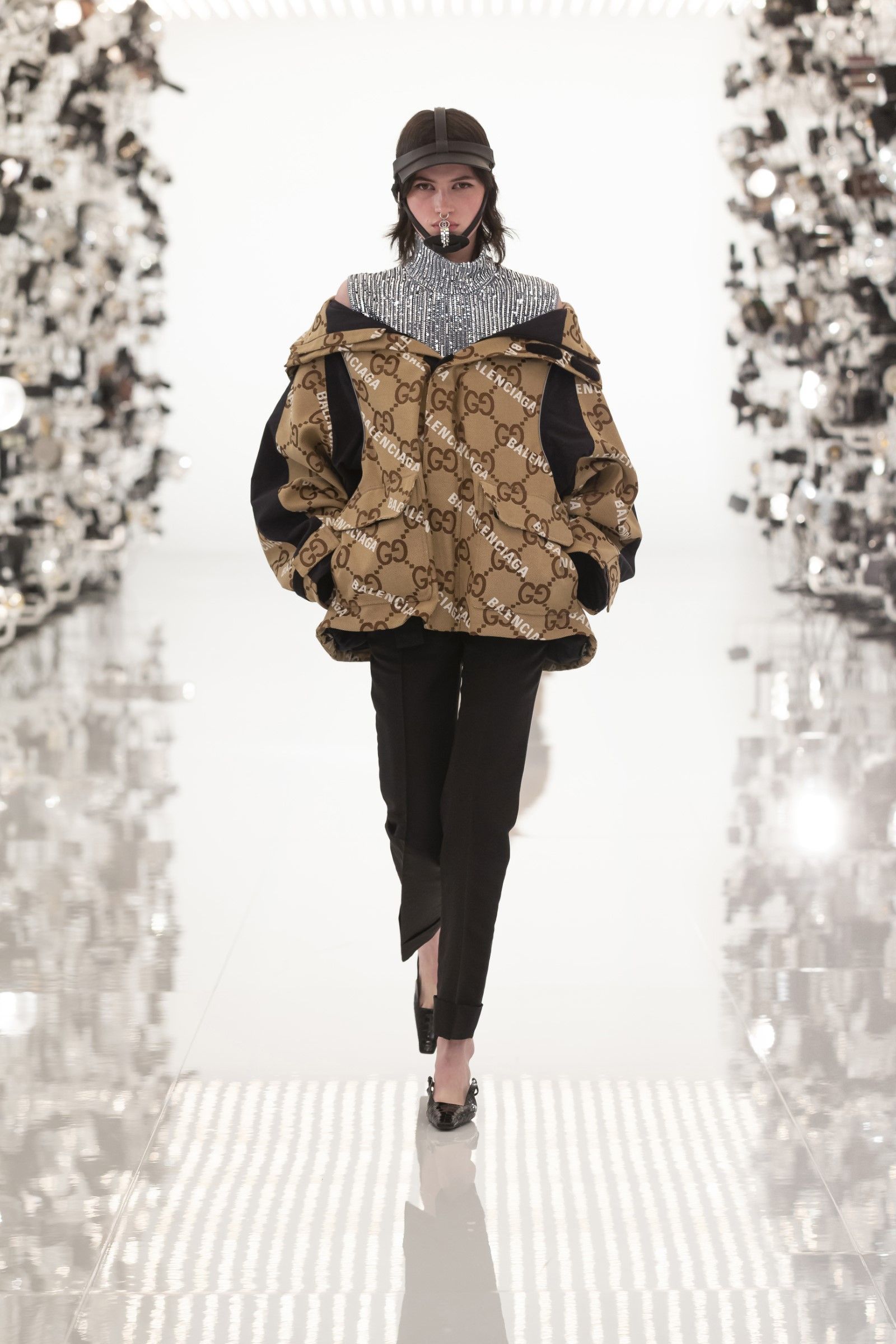 Per i 100 anni del brand, Alessandro Michele ha "hackerato" l'estetica di Demna Gvasalia per una serie di look e accessori che fondono le silhouette di Balenciaga con i classici tessuti di Gucci. Gli item più notevoli sono la borsa Jackie di Gucci e la borsa Hourglass di Balenciaga ricoperte da una versione co-branded dell’All-Over Logo Pattern di Balenciaga. Lo stesso pattern è replicato anche su vari abiti, il più notevole dei quali è un tailleur interamente ricoperto di paillettes. L’influenza di Demna, però, si è estesa anche ad altri look e silhouette dal taglio boxy della collezione ma anche ad accessori come gli occhiali da sole e collane ma anche gli stivali presenti in molti dei look.