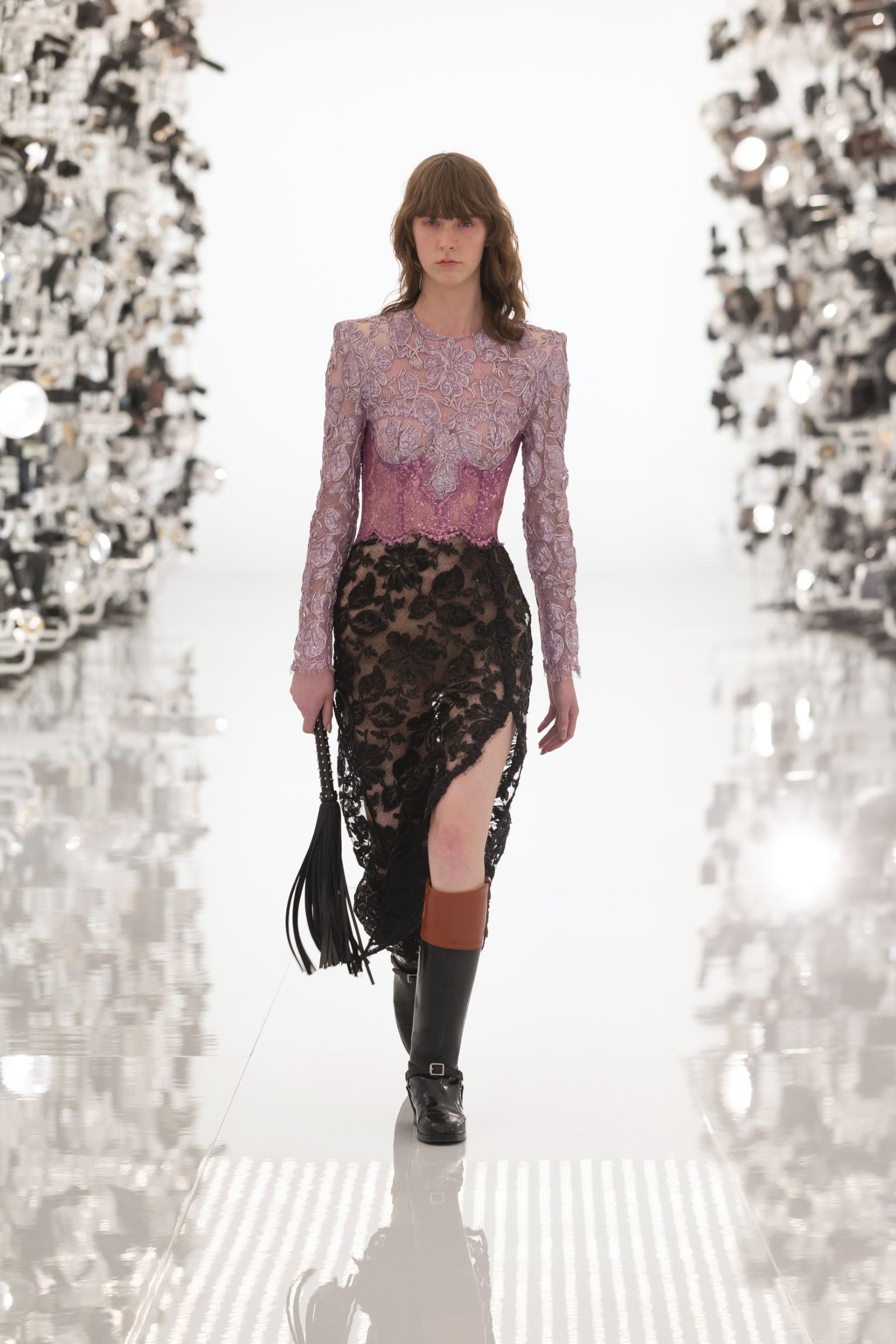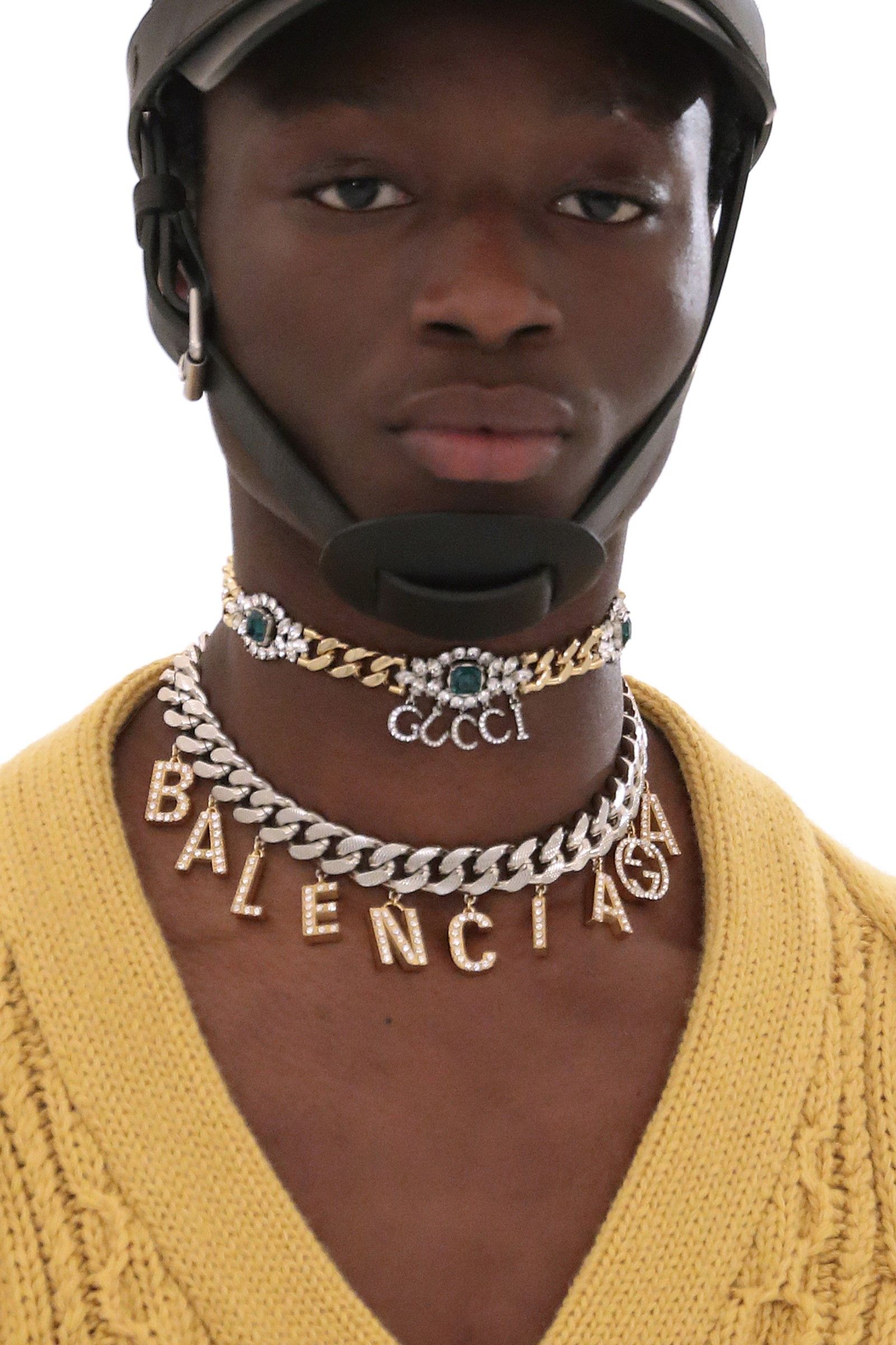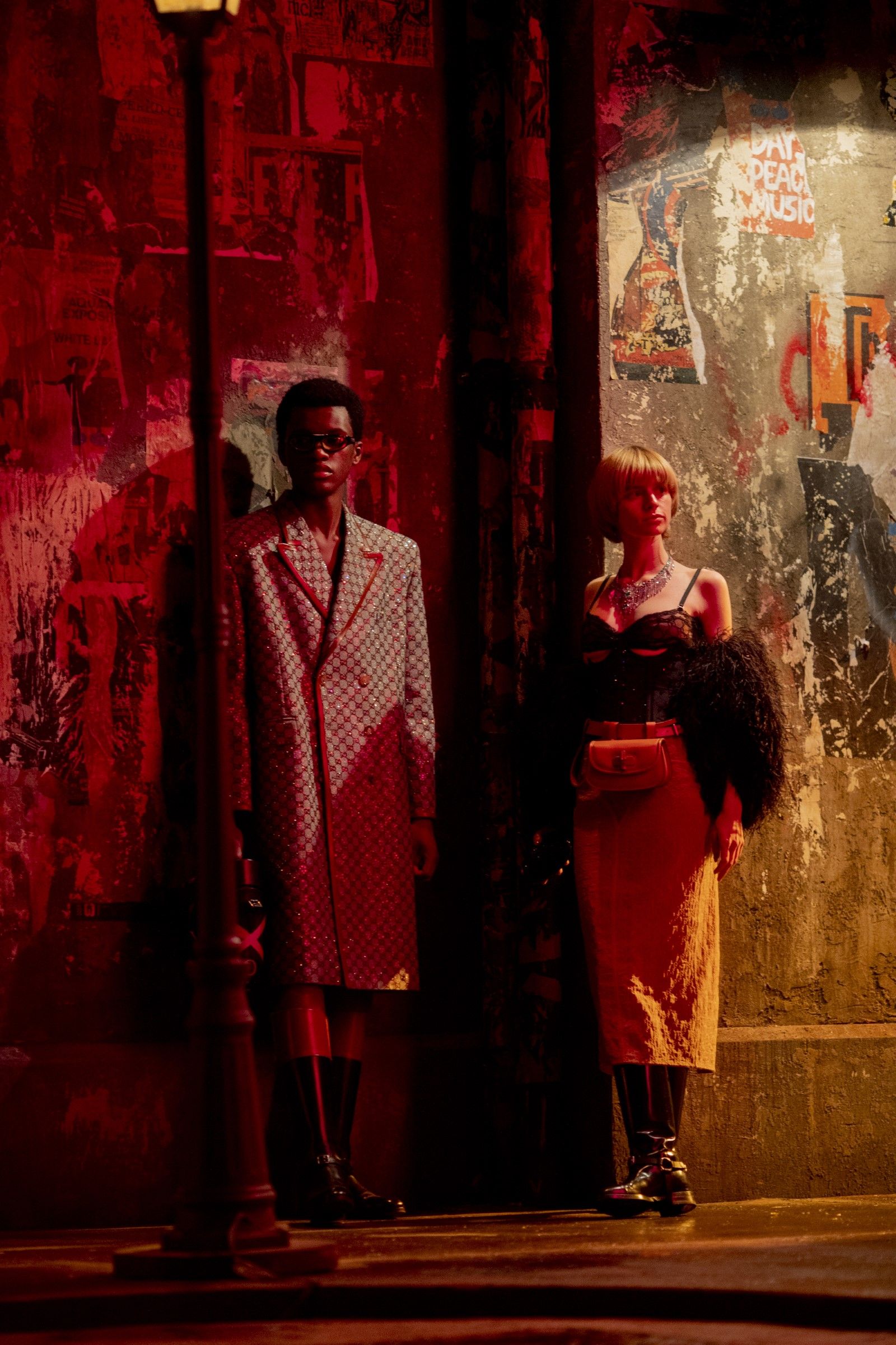 Per i 100 anni del brand, Alessandro Michele ha "hackerato" l'estetica di Demna Gvasalia per una serie di look e accessori che fondono le silhouette di Balenciaga con i classici tessuti di Gucci. Gli item più notevoli sono la borsa Jackie di Gucci e la borsa Hourglass di Balenciaga ricoperte da una versione co-branded dell’All-Over Logo Pattern di Balenciaga. Lo stesso pattern è replicato anche su vari abiti, il più notevole dei quali è un tailleur interamente ricoperto di paillettes. L’influenza di Demna, però, si è estesa anche ad altri look e silhouette dal taglio boxy della collezione ma anche ad accessori come gli occhiali da sole e collane ma anche gli stivali presenti in molti dei look.