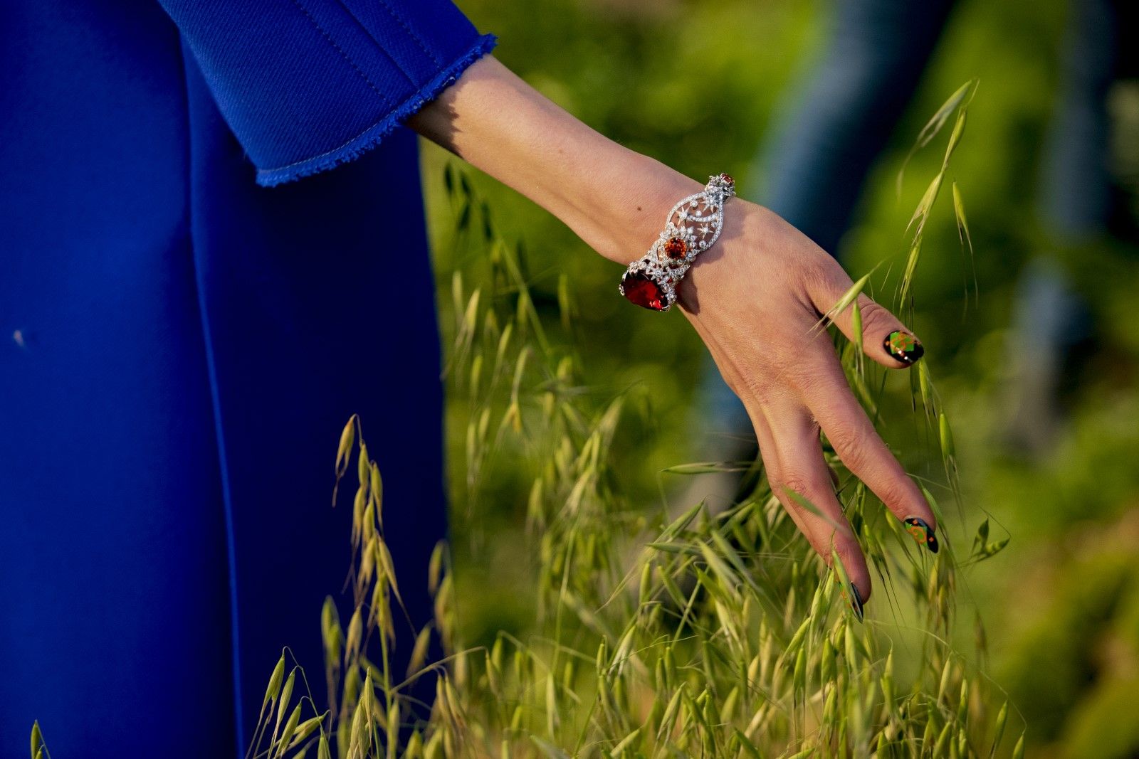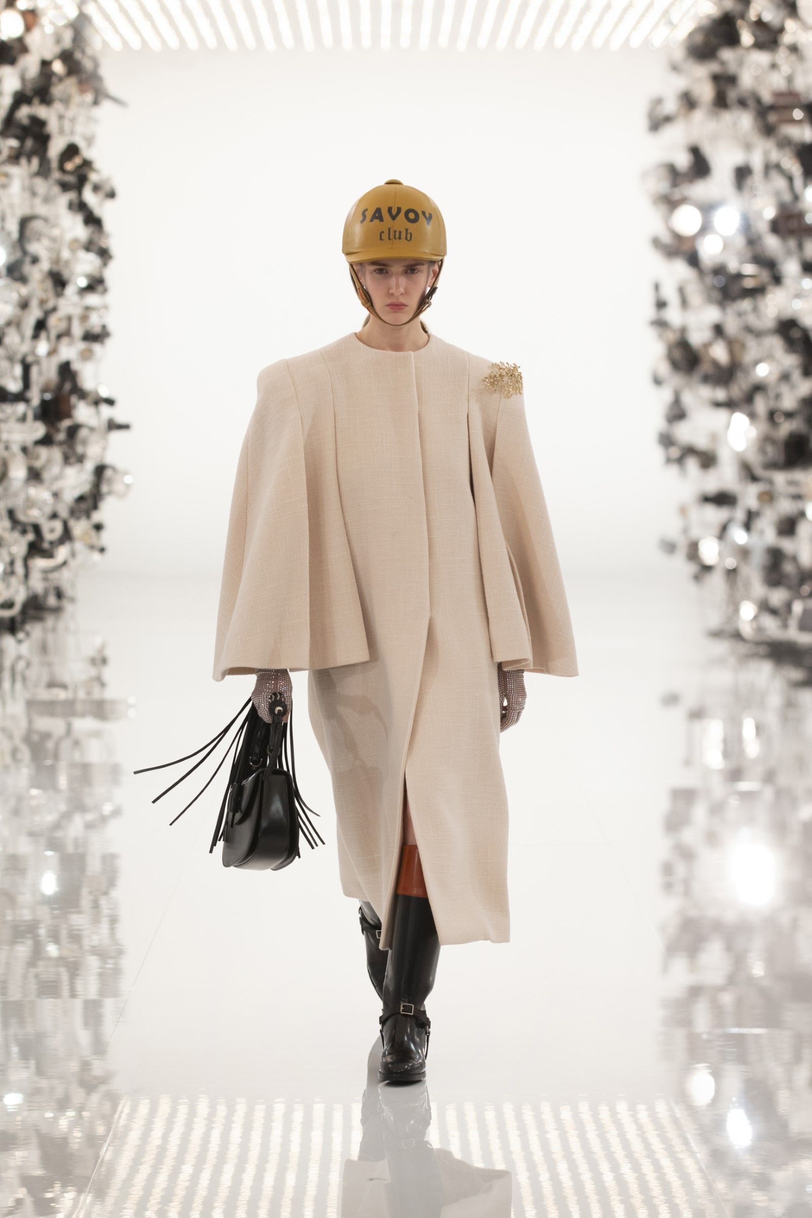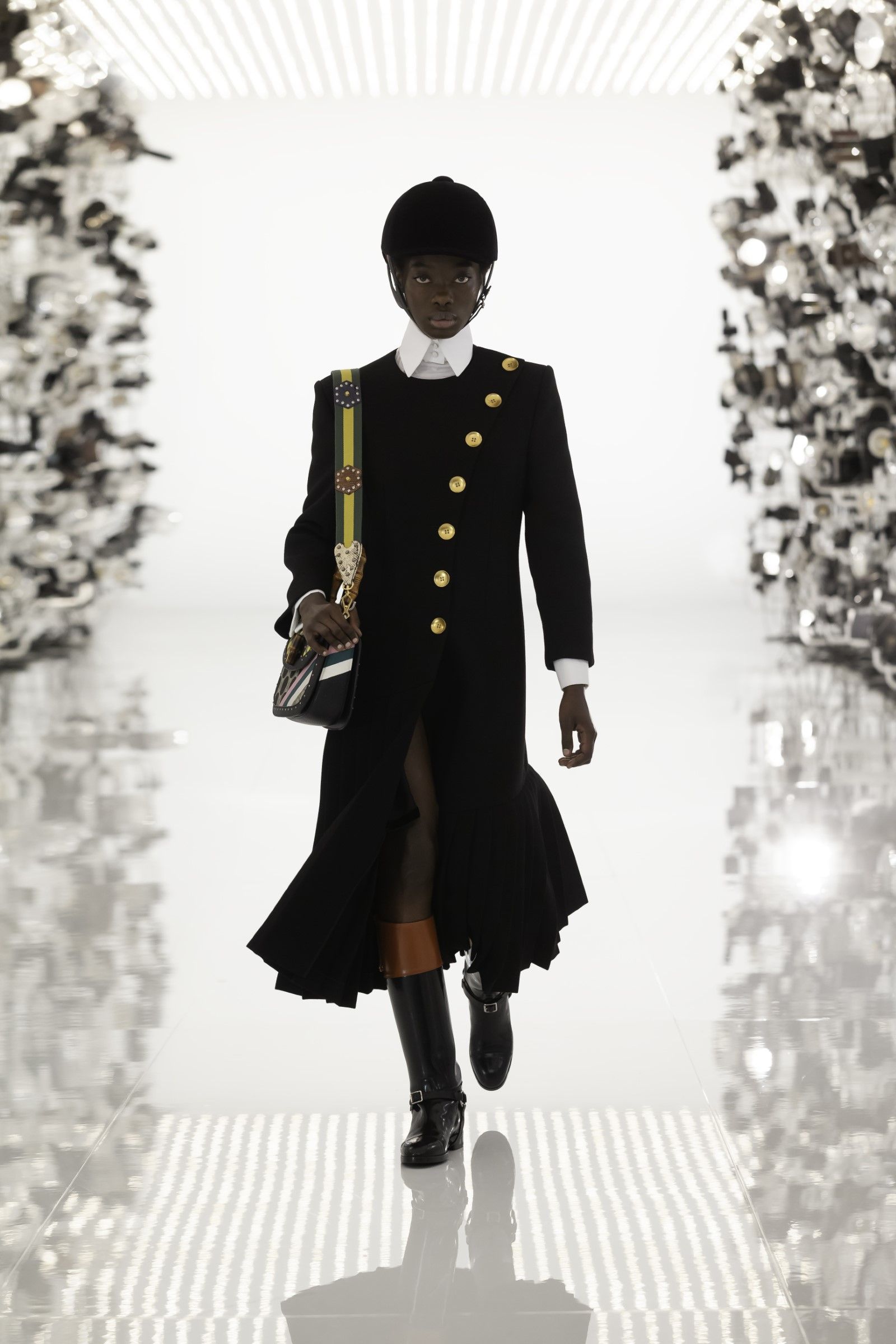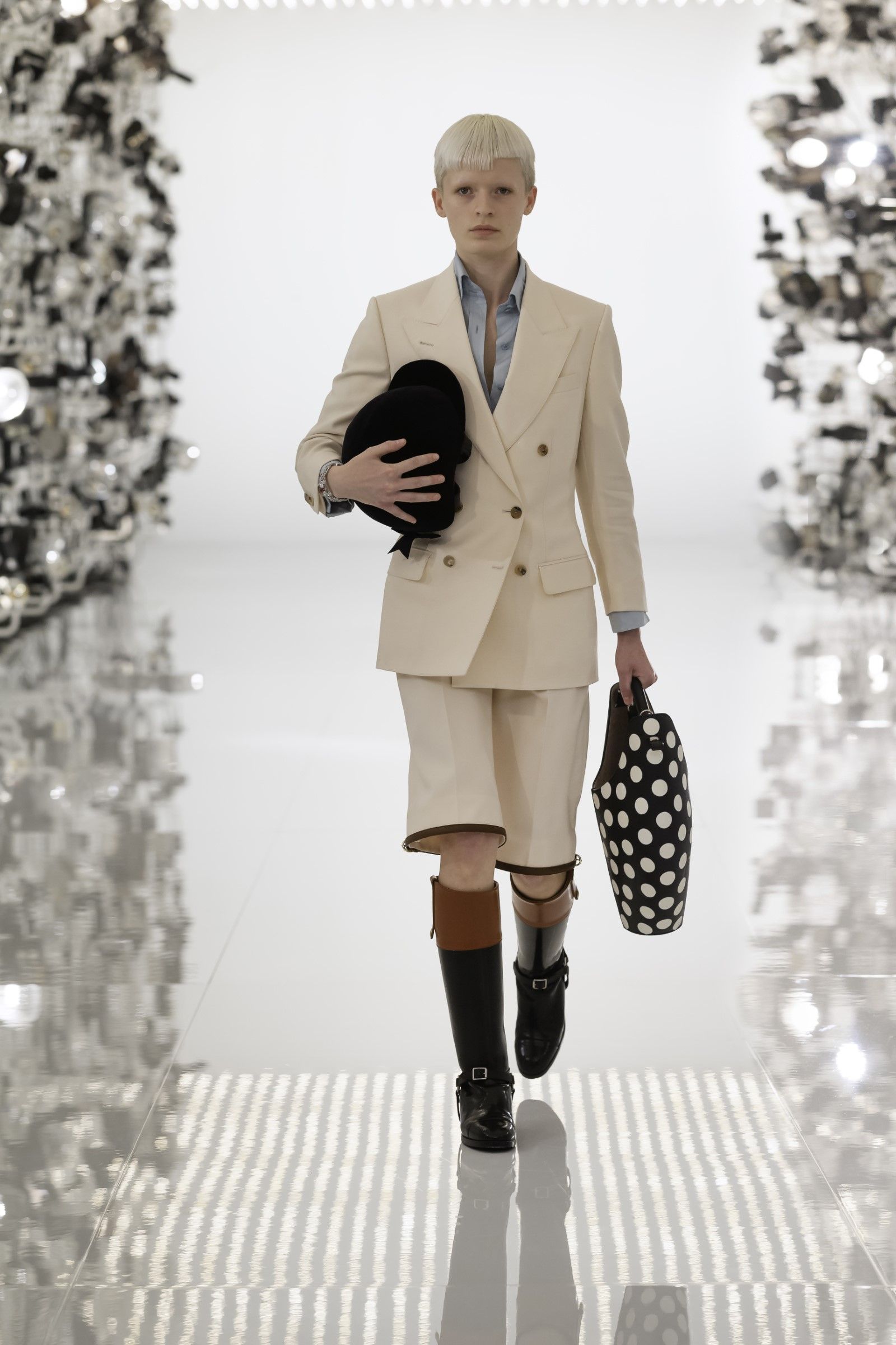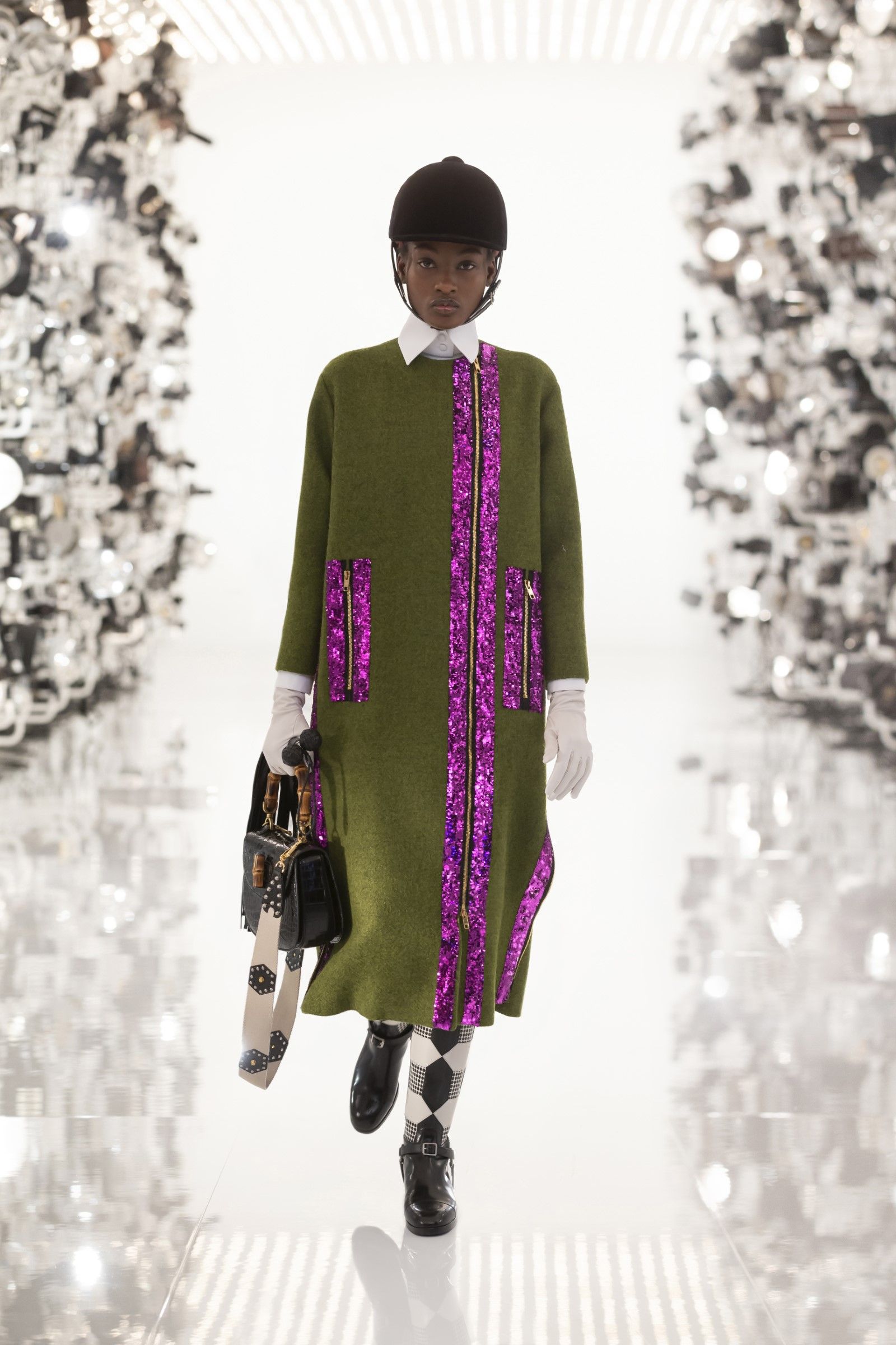 Caschi da fantini, harness di pelle, frustini e dettagli Horsebit richiamano al mondo dell’ippica – una chiara citazione alle origini del brand, nato in origine come valigeria e selleria. Questo richiamo visivo, così profondamente legato alla storia del brand, è sottolineato anche dalla presenza di veri e propri cavalli nelle scene finali del fashion film ma non è l’unica reference al passato del brand: anche la celebre stampa Flora risalente agli anni ’60 torna e ricopre un intero tailleur femminile, incluse calze e scarpe.