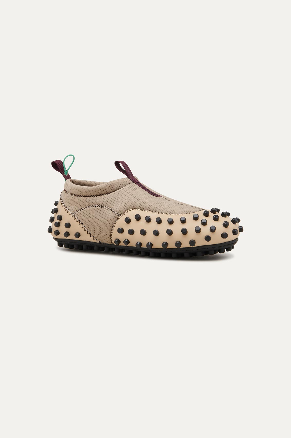 L’estetica della 1000CHIODI, vista allo show in versione boot ma messa in commercio con una silhouette low-cut, è a metà fra la slipper, la sneaker tecnica e lo stivale avant-garde e rientra nel trend delle sneaker ibride che andrà per la maggiore quest’estate. La tomaia è costruita a partire da un tessuto tecnico con impunture a zig-zag e overlay di pelle che dalla punta arrivano fino ai talloni. Una serie di chiodi di gomma ricoprono tutta la parte inferiore della scarpa sostituendo la outsole e garantendo presa sul terreno.