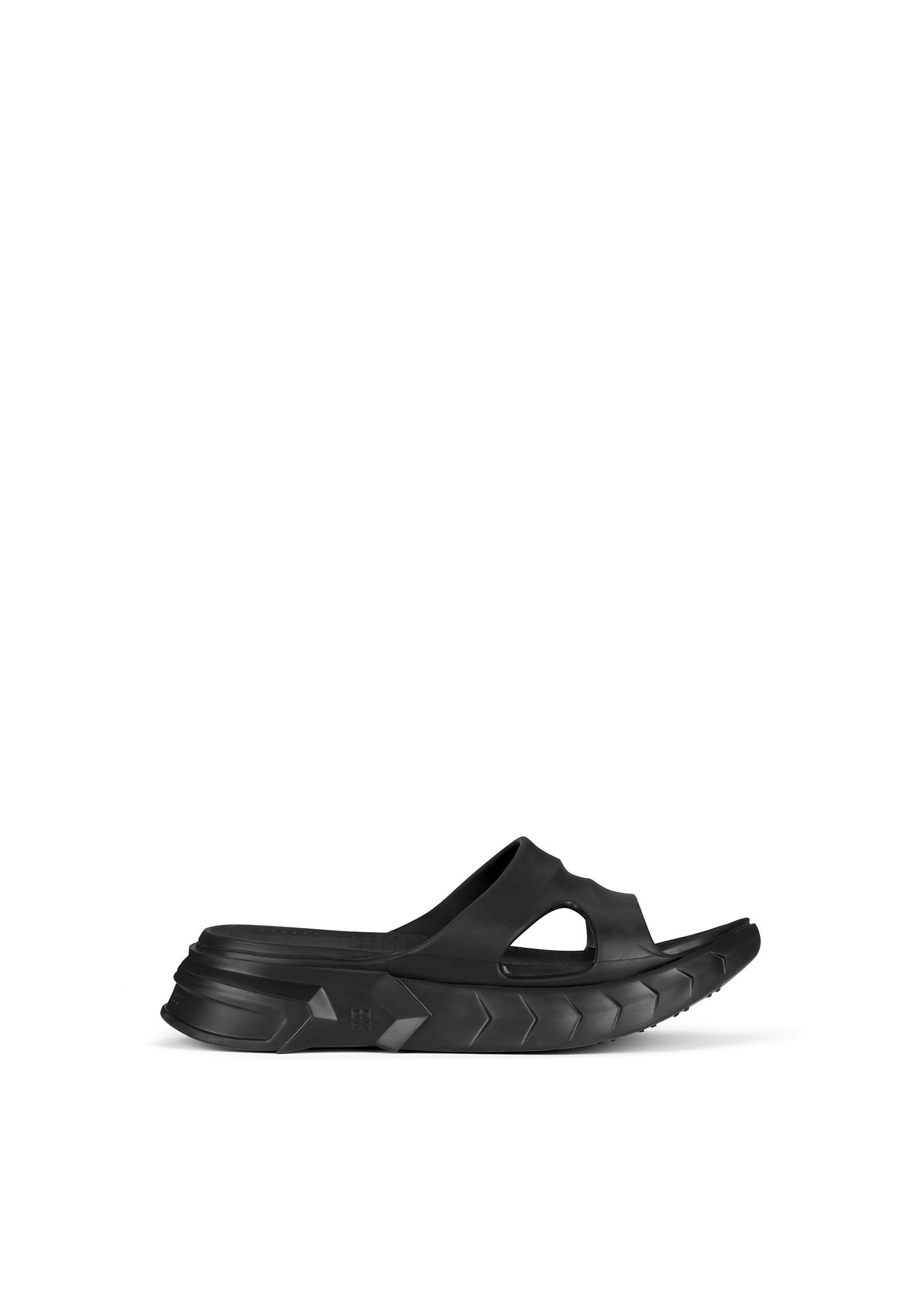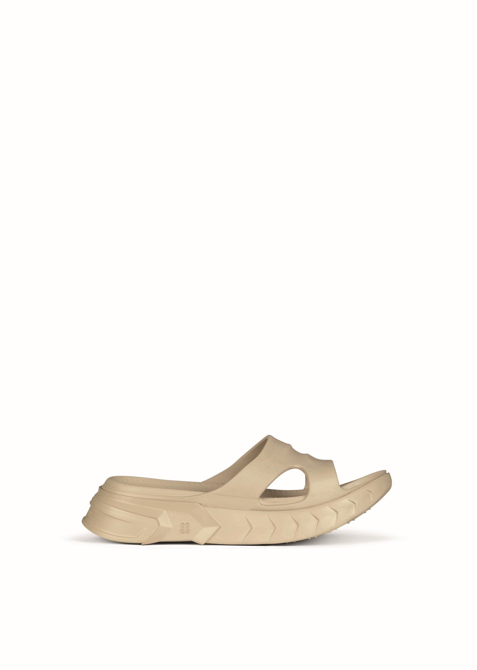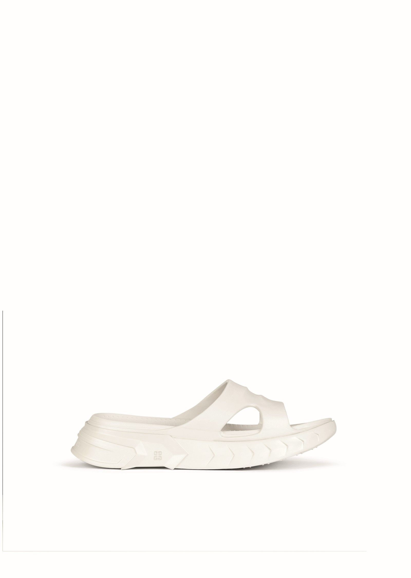 Modellati in una resina ultra moderna EVA termoplastica, le slide monocromatiche Marshmallow trasformano un classico del footwear in un prodotto dalle linee futuristiche con due nuovi modelli: una zeppa da donna e una flat universale, che è anche protagonista della campagna pubblicitaria SS20 di Givenchy. La zeppa combina un profilo allungato con una suola imbottita e decorata con un minimalistico logo in rilievo. La slide invece, con le sue linee architettoniche e la marcata suola ergonomica, è un design gender-inclusive che mescola relax ed estetica formal.