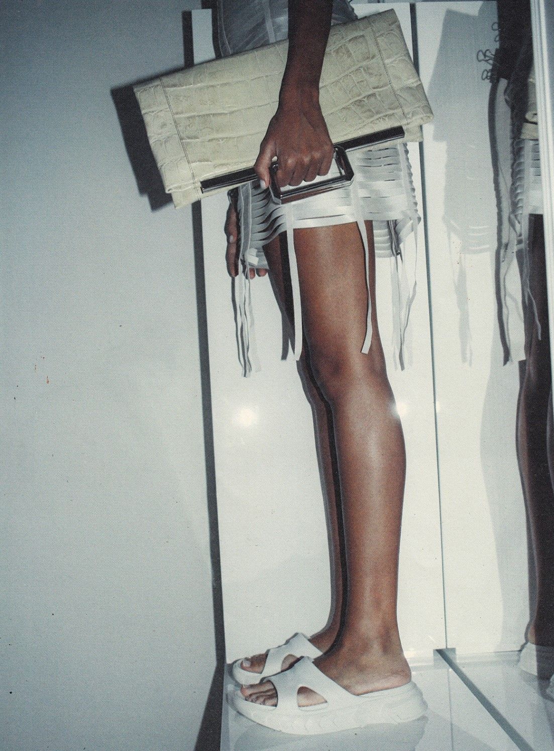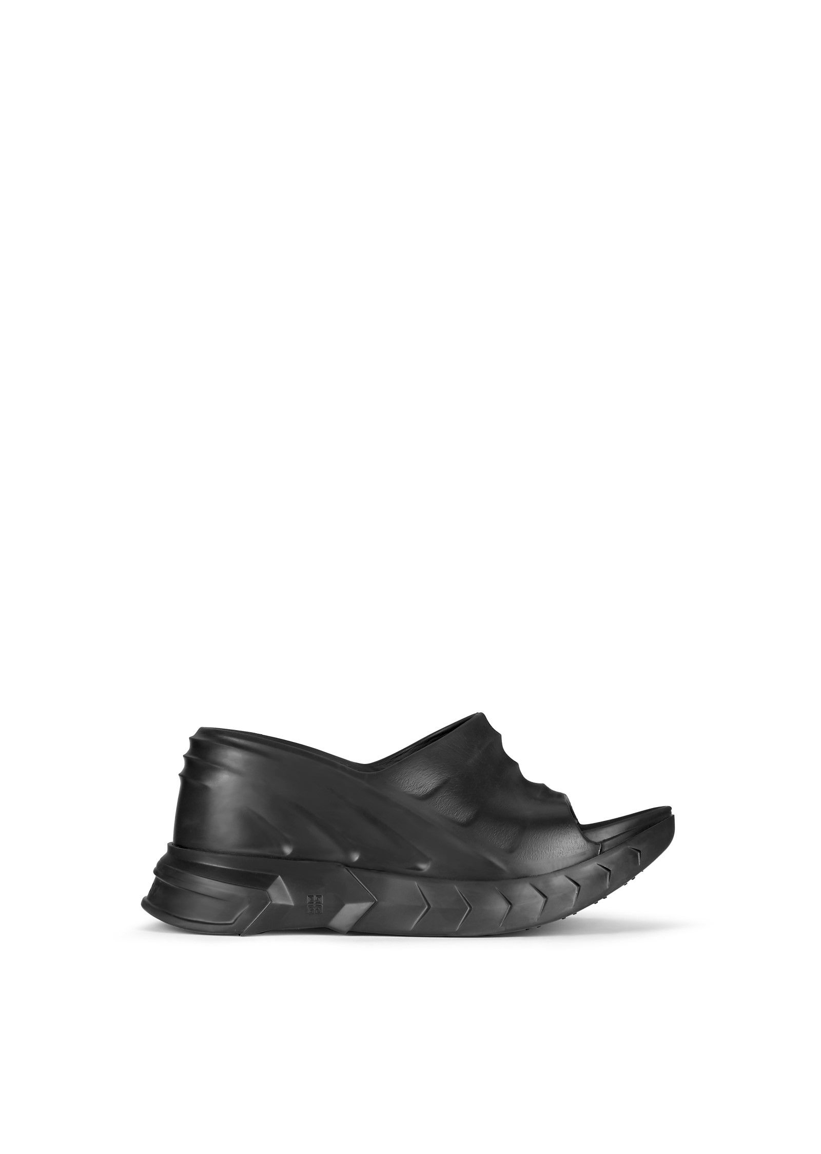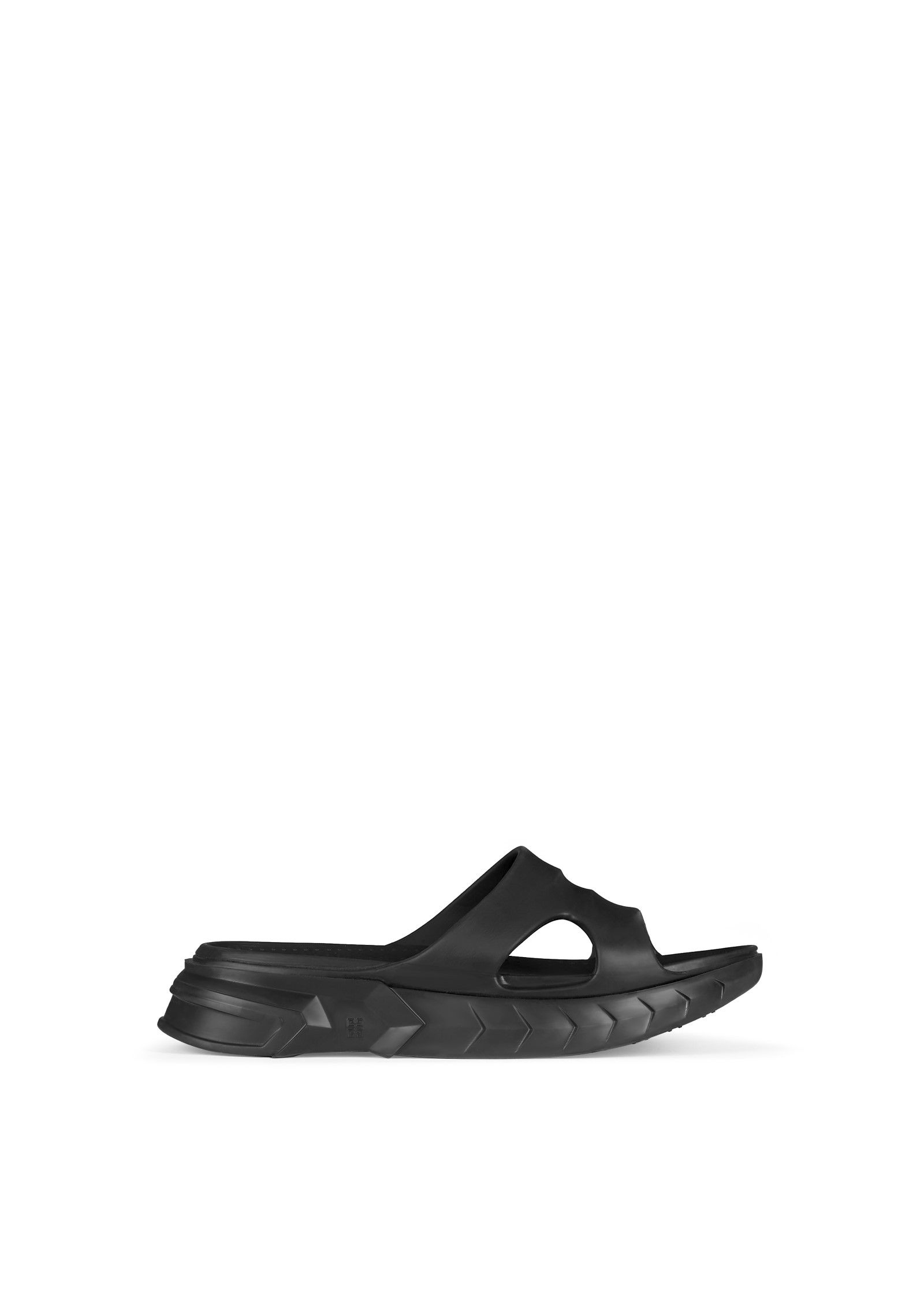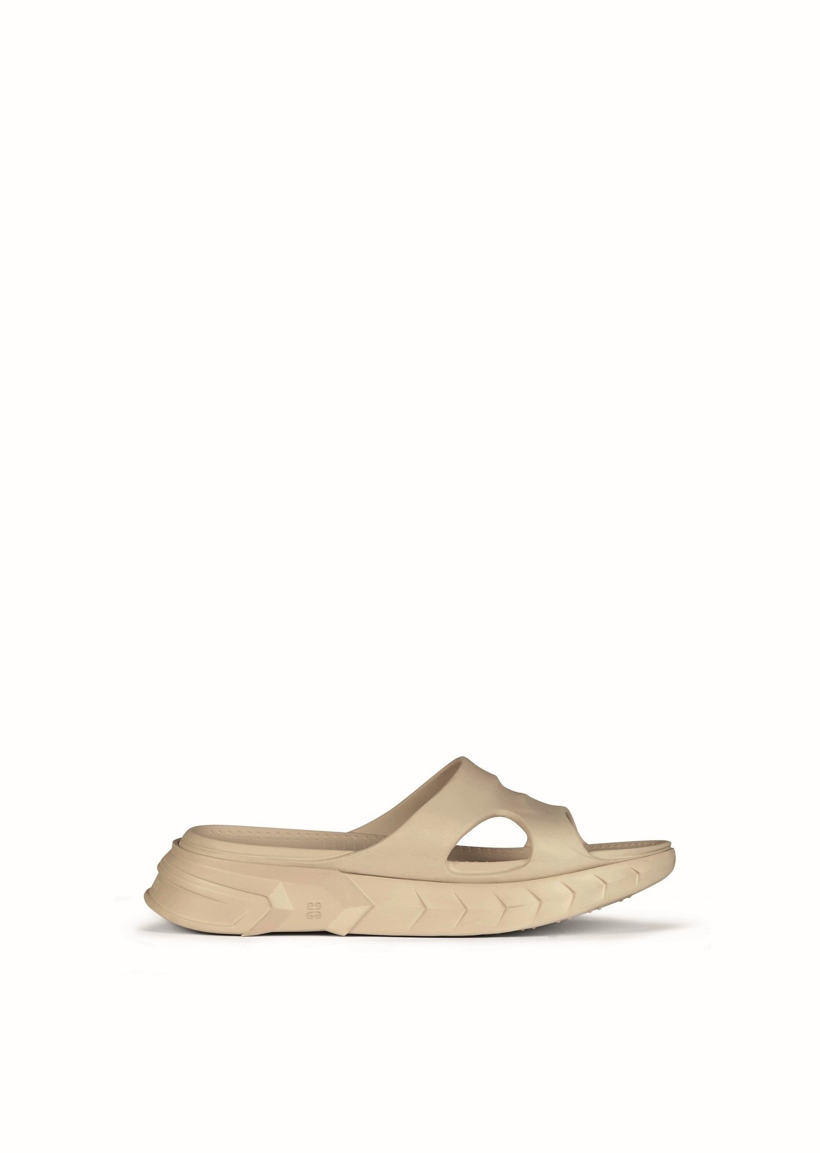 Modellati in una resina ultra moderna EVA termoplastica, le slide monocromatiche Marshmallow trasformano un classico del footwear in un prodotto dalle linee futuristiche con due nuovi modelli: una zeppa da donna e una flat universale, che è anche protagonista della campagna pubblicitaria SS20 di Givenchy. La zeppa combina un profilo allungato con una suola imbottita e decorata con un minimalistico logo in rilievo. La slide invece, con le sue linee architettoniche e la marcata suola ergonomica, è un design gender-inclusive che mescola relax ed estetica formal.
