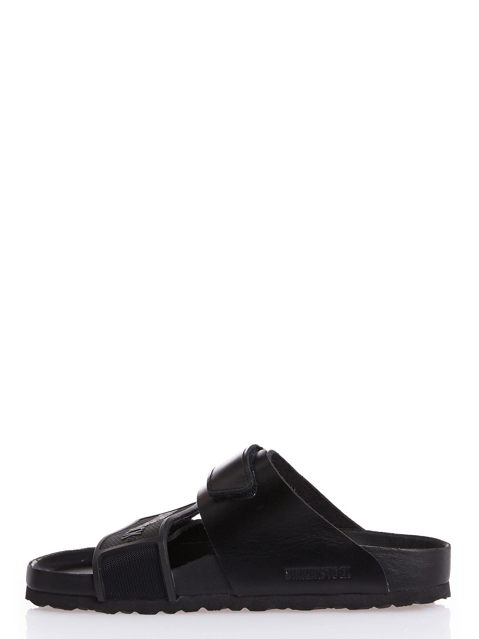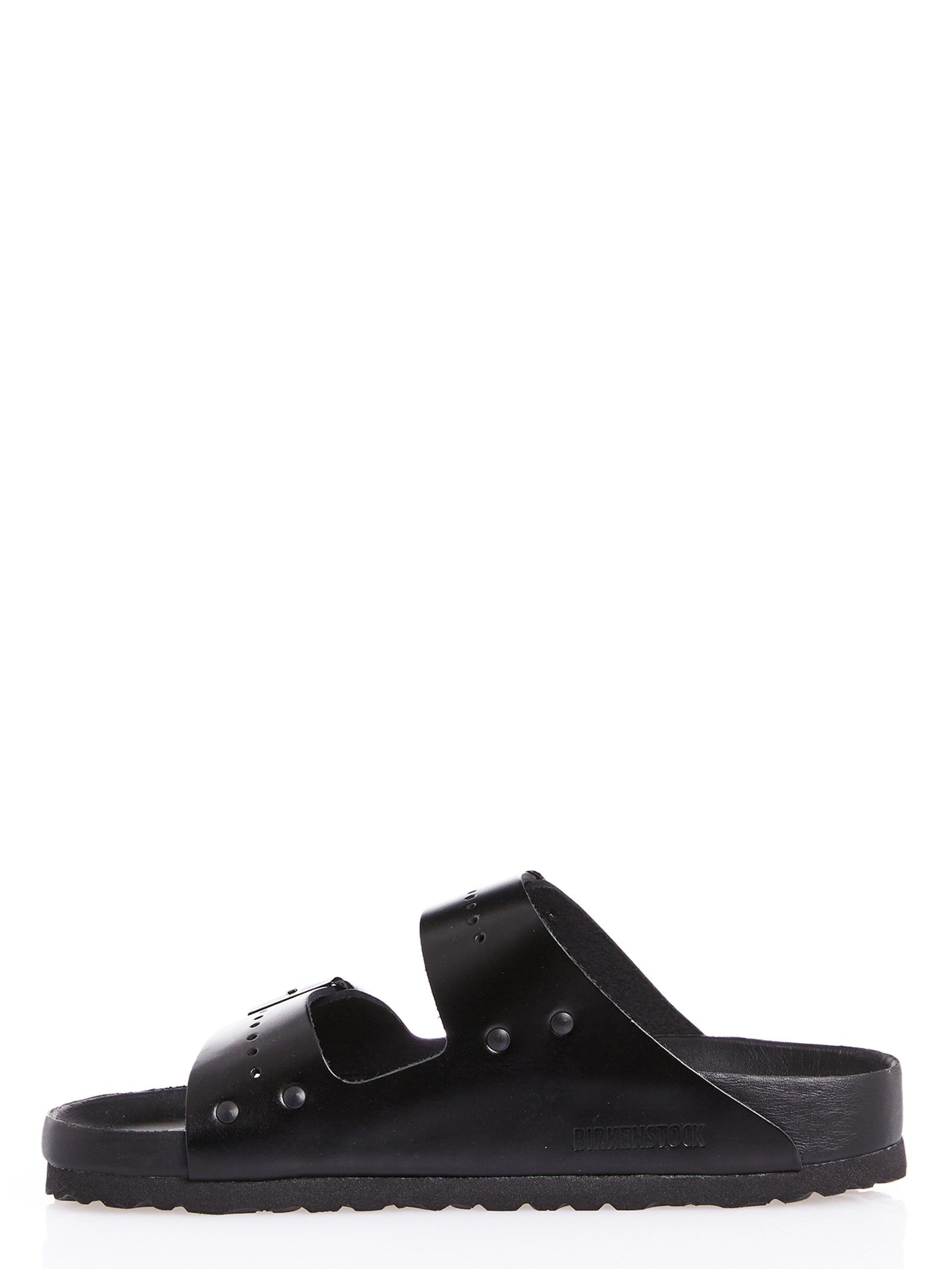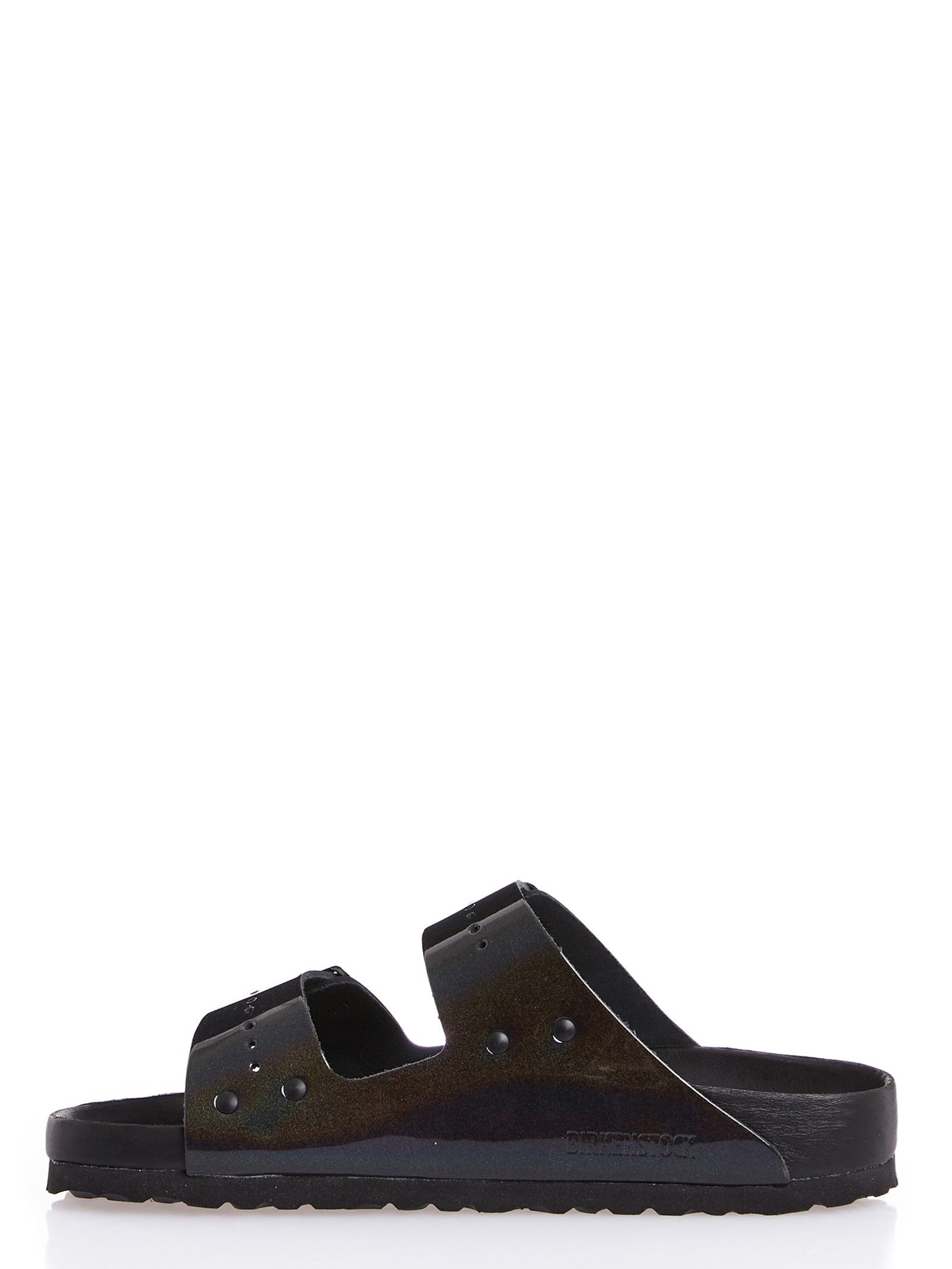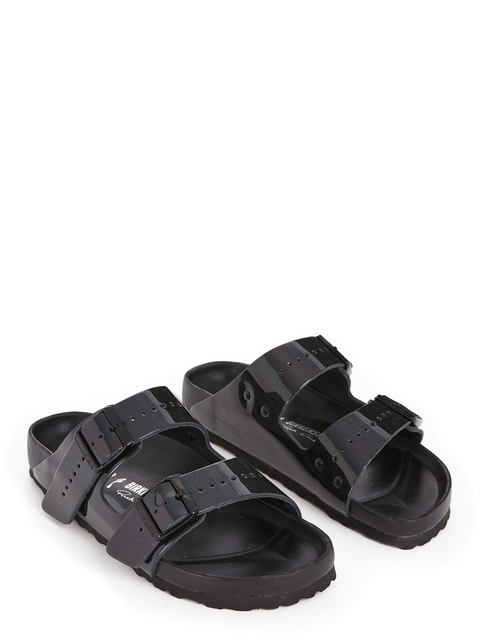 I modelli Arizona, Boston e Rotterdam di Birkenstock sono proposti infatti in una colorway completamente nera, e con costruzioni di pelle che coprono anche la suola. Oltre alle cinghie leggermente allungate riprese dalle precedenti collaborazioni, per questo nuovo capitolo sono stati anche aggiunti dei rivetti "che sembrano usciti da uno dei miei film preferiti di Fritz Lang", come ha detto lo stesso Owens. I modelli Arizona e Boston, poi, sono stati anche prodotti in una seconda versione in pelle metalizzata iridescente.