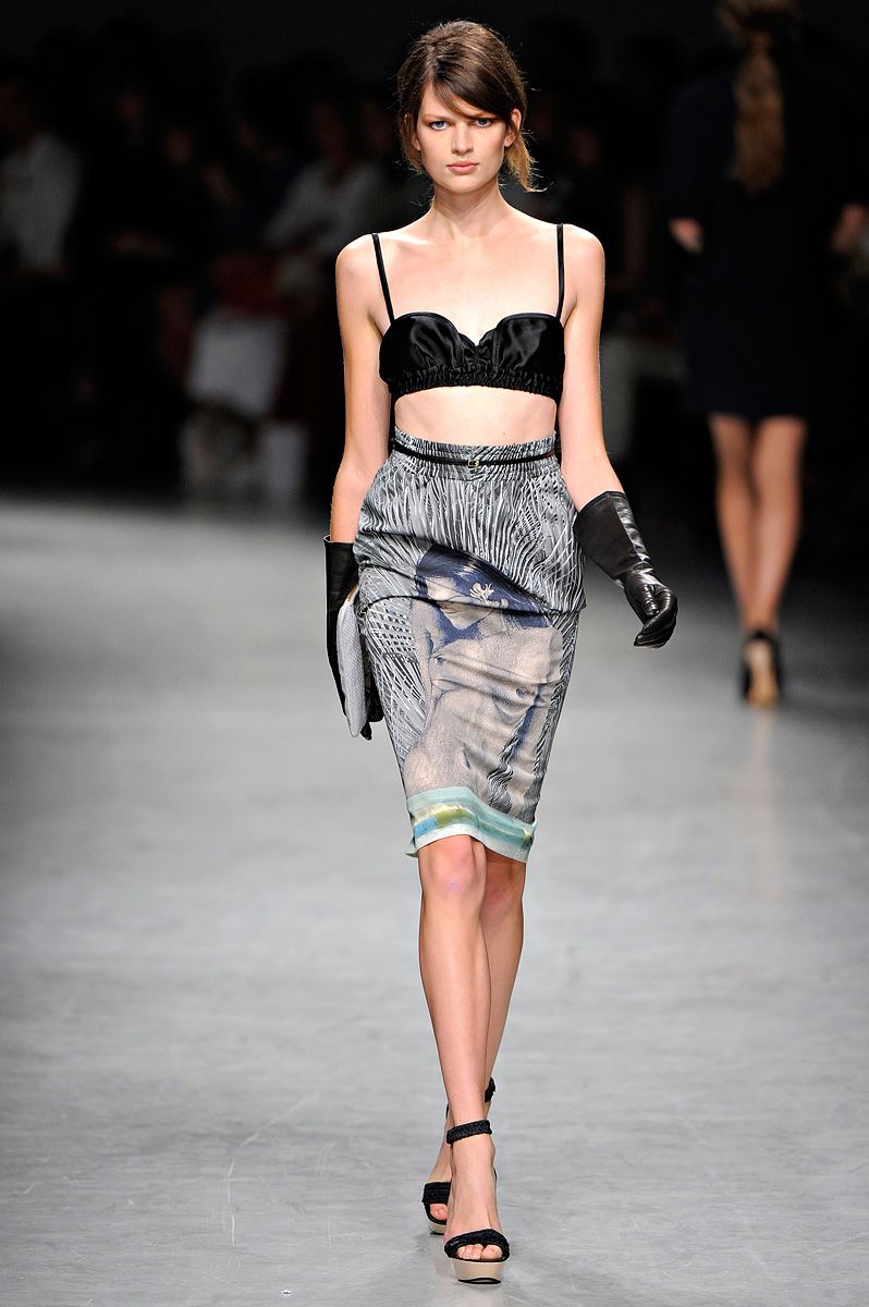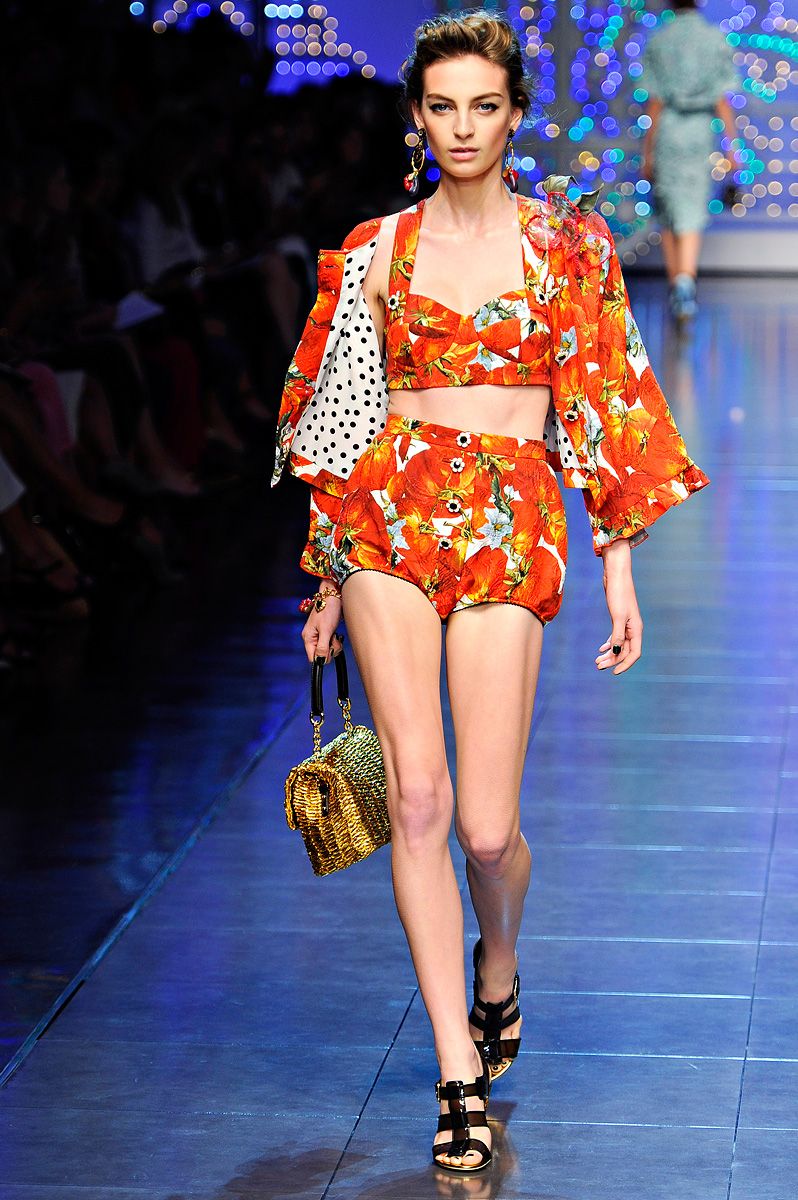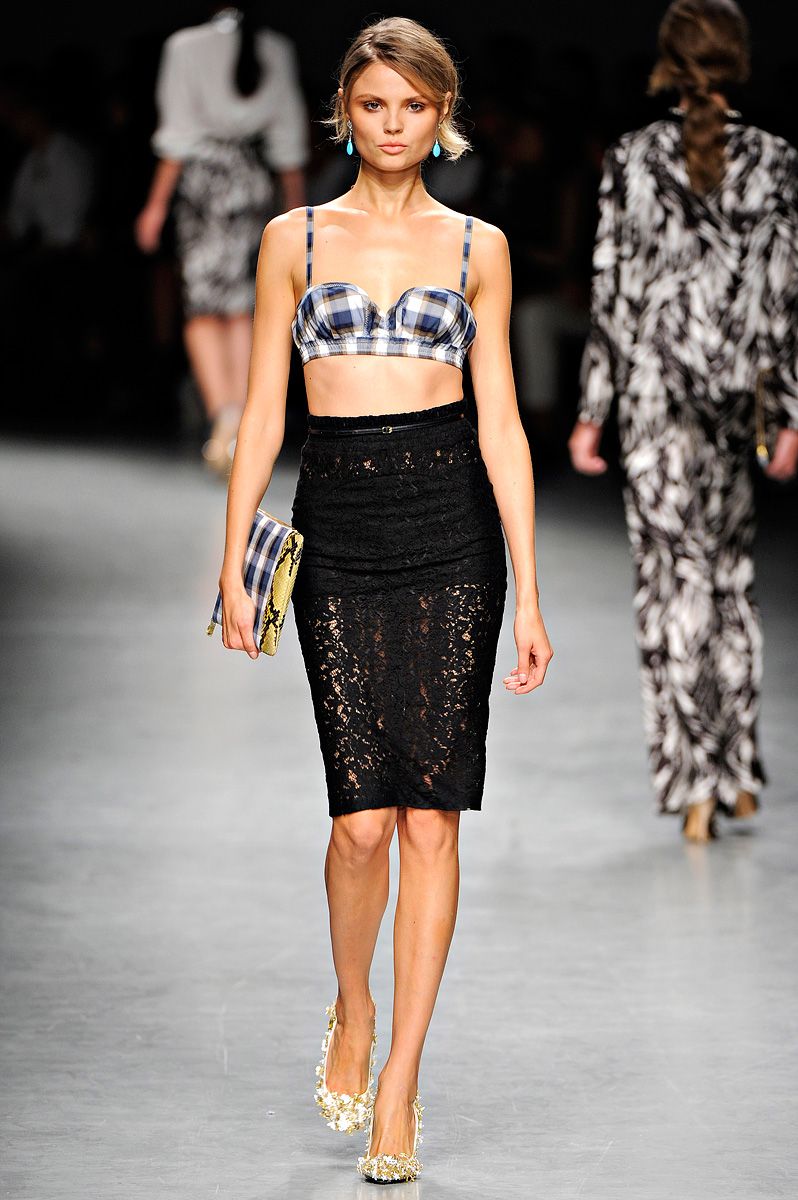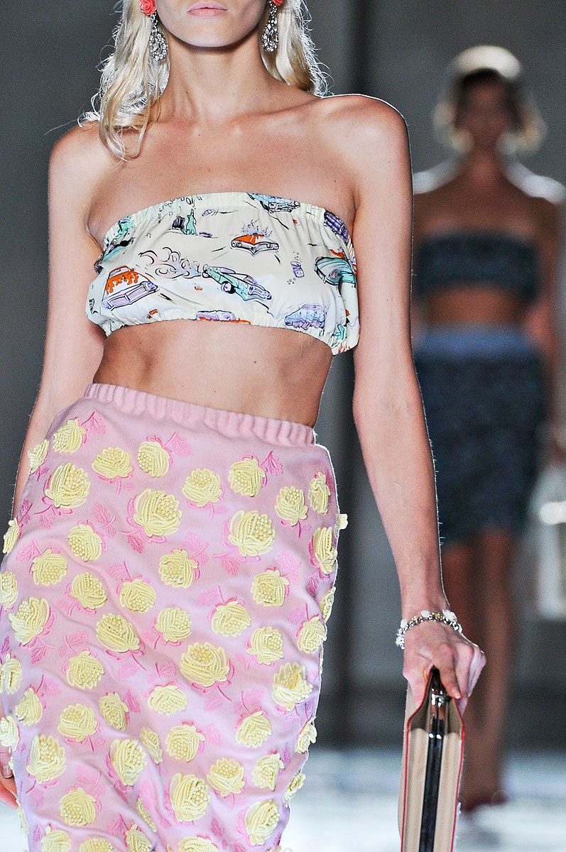Be sure to spend extra time on your abs as you're trying to sweat off these last four months of winter hibernation and holiday laziness.The 80's reincarnated bra-top trend is going to be very popular this spring/summer due to all of the designer attention it has been getting on runways. Show only a little skin with a great pair of high-waisted trousers or show a lot with itty-bitty, teeny-weeny shorts (which are also trending for the upcoming season.) This trend is most likely going to be in every store you can find, but we've provided you with some stores that are selling them as of now: Free People, Urban Outfitters, and Polyvore . Spotted in the S/S 2012 collections of Prada, Pucci, Donna Karan, Nina Ricci, and Dolce and Gabbana.