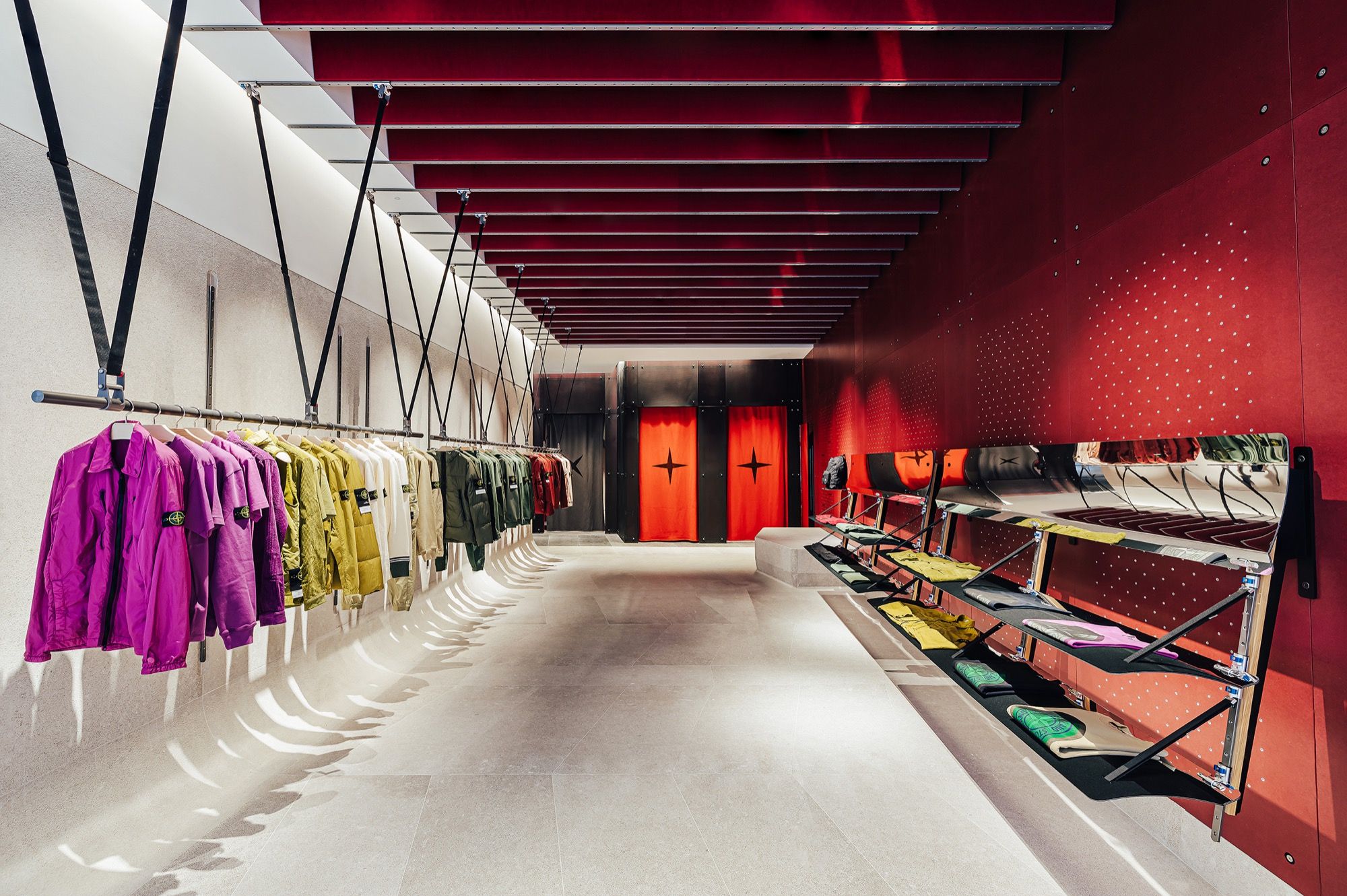 L'interior design dello store riprende l'estetica dei negozi Stone Island, ed è stato firmato da Marc Buhre, designer industriale di Heidelberg, fondatore dello studio di architettura Zeichenweg TM. Ogni elemento è stato creato per combinarsi in modo fluido con un design altamente funzionale. La pietra bocciardata del pavimento caratterizza anche le pareti, affiancata da elementi in rete metallica su una sotto struttura in acciaio. I mobili sono realizzati in rovere naturale tinto nero, gli appendiabiti sono composti da barre di carbonio, l'alluminio anodizzato e le mensole sono nei toni dell'antracite.