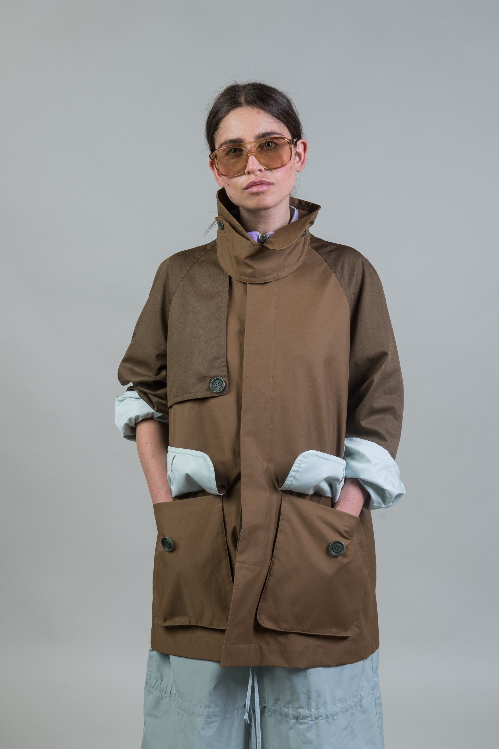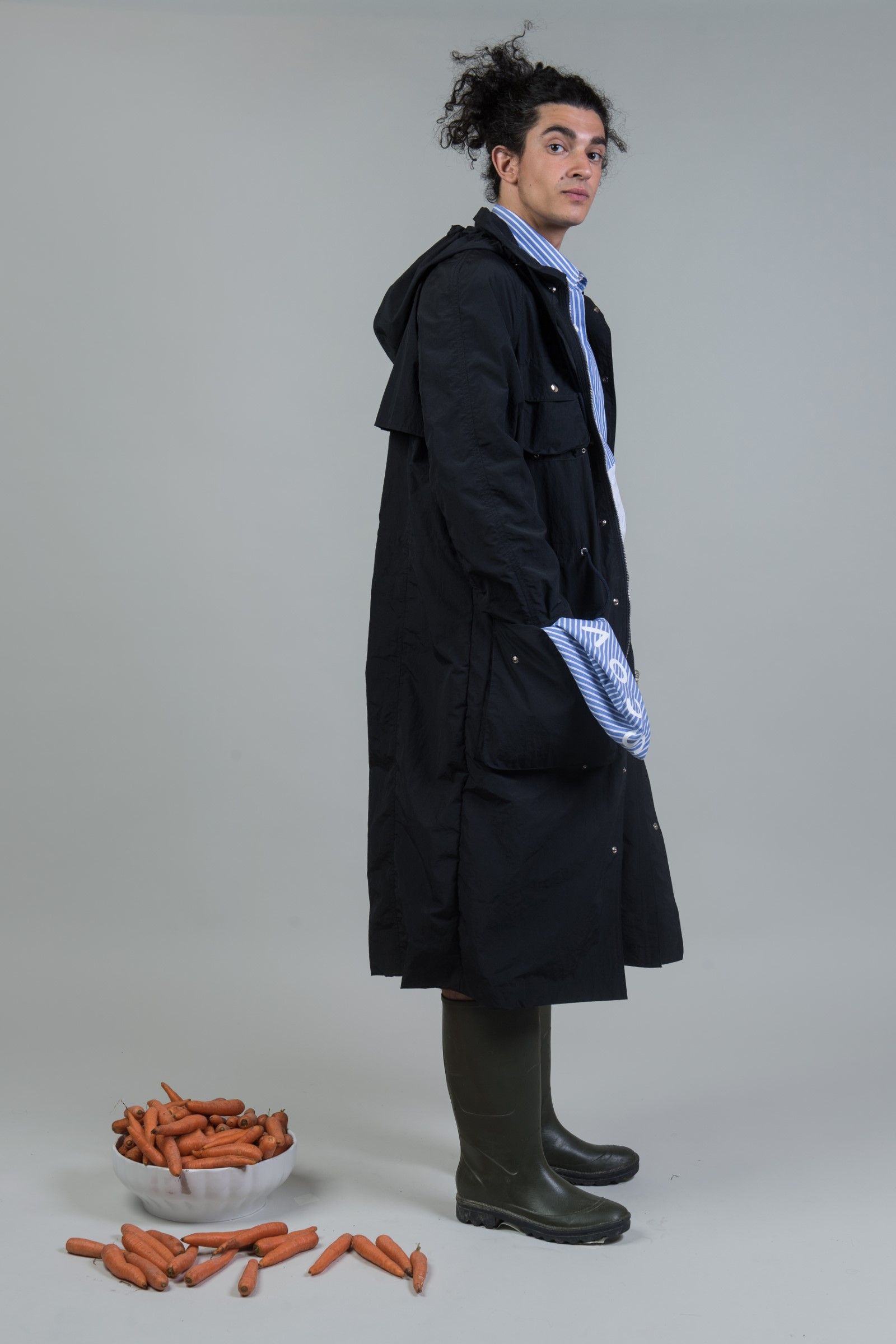 Anzitutto la vocazione verso la sostenibilità e il recupero del brand si riconferma, tramite l’utilizzo di materiali con fibre riciclate ed organiche o materiali di recupero nella maggior parte dei look. Inoltre, in questa stagione, a fianco dell’estetica che abbiamo già imparato a conoscere e fatta di tagli rilassati e materiali techwear, si aggiunge un nuovo elemento techwear, presente sia sul piano dei materiali che su quello del design.