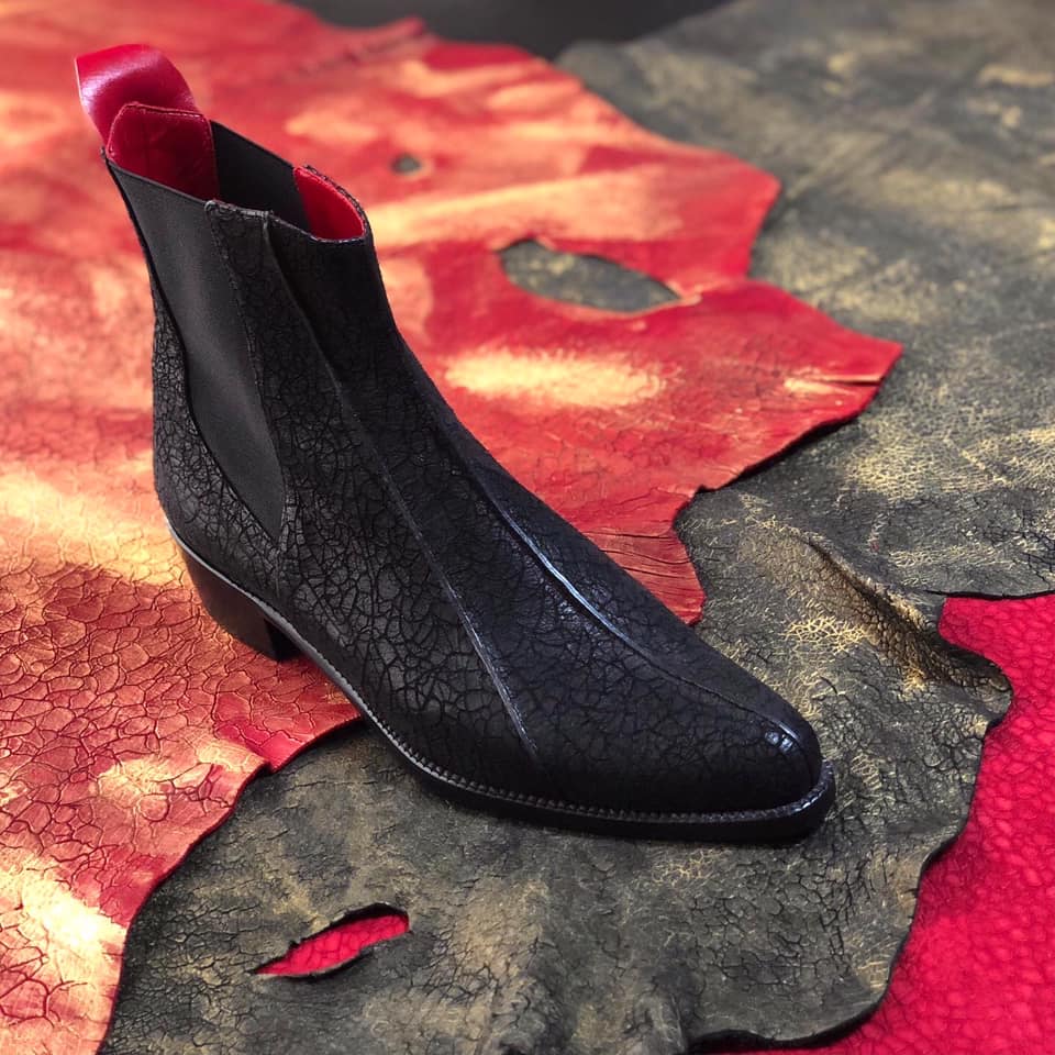 Un brand che invece unisce antica lavorazione artigianale a tecnologia è H. KATSUKAWA, fondato dall’eponimo designer dopo il suo periodo di studi nell’officina del grande shoemaker inglese Paul Harnden. Le scarpe del brand sono costruite in pelle Nibe, dotata di una consistenze disomogenea che crea un effetto visivo unico e che è cucita a mano su suole già dotate di tacco, creando un dettagli di filo extra che fuoriesce dalla suola e che è diventato un simbolo del designer.