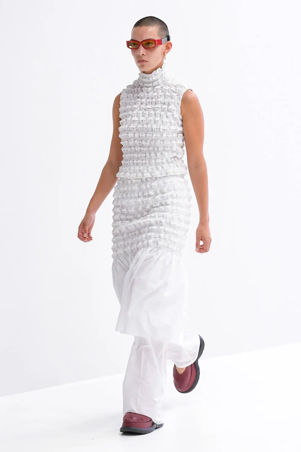 Sempre bravissima a far parlare di sé, durante il suo show nella Milan Fashion Week Sunnei ha presentato un paio di occhiali da sole chiaramente ispirati ai classici occhiali da piscina. Completi di elastico nella parte posteriore, l'item era presenta in tutti i look della nuova collezione, disponibile in una vastissima gamma di colori che vanno dalle più classiche palette monocromatiche ad altre fantasie tipiche del brand.