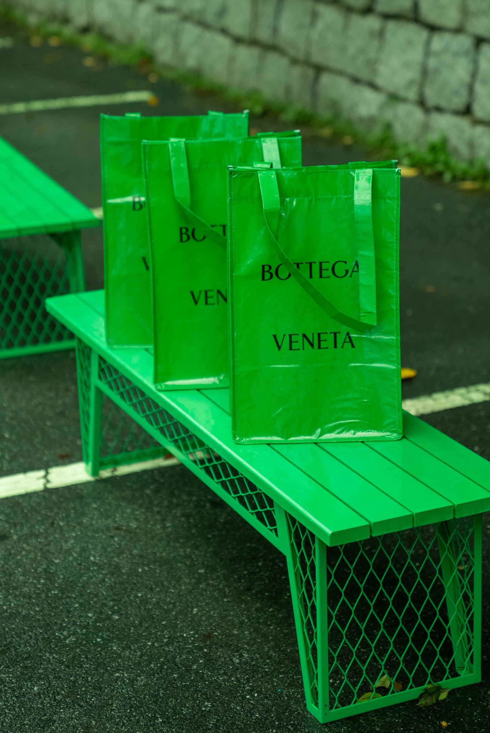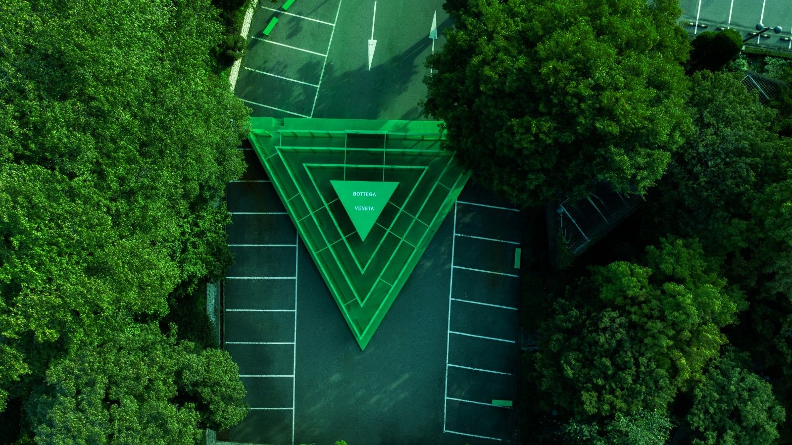 Il brand è rimasto sostanzialmente silenzioso circa la natura dell’installazione che, secondo @hftgroup, è ispirato alla popolarità di Squid Game e che in effetti presenta almeno due parallelismi con la serie: il primo è appunto l’estetica monocromatica; il secondo è la forma triangolare che è da molto tempo un simbolo del Bottega Veneta di Daniel Lee (ricorre ad esempio nei packaging, nelle etichette degli abiti e nelle fibbie) ma che è anche la forma del tavolo triangolare apparso nelle ultime puntate della serie, a sua volta una citazione all’epica installazione Dinner Party di Judy Chicago.