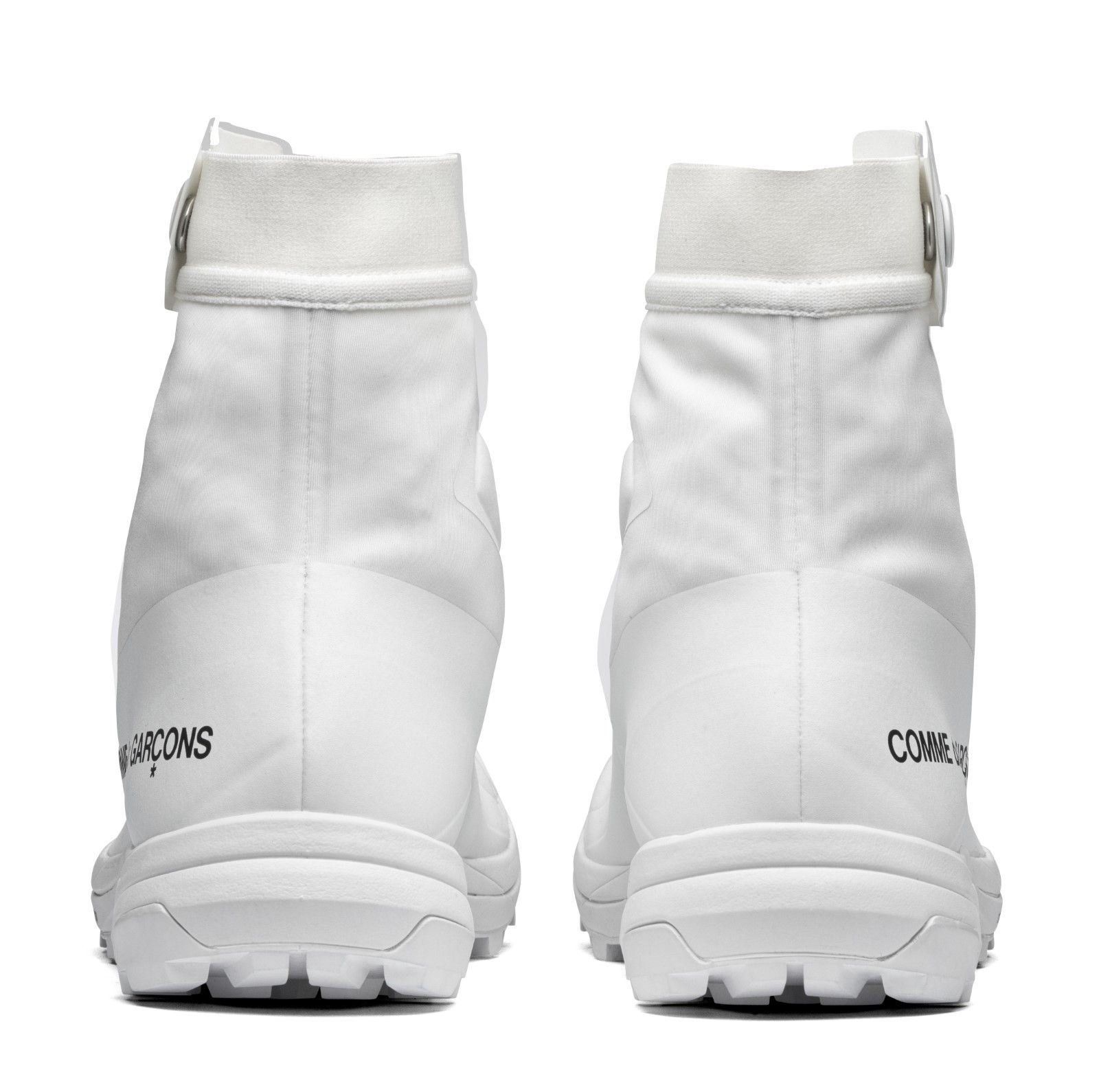 Dopo la loro prima collaborazione vista nella collezione SS21, Salomon e Comme des Garçons hanno co-firmato una nuova capsule collection dedicata all’estetica hiking e presentata durante la collezione FW21 del brand. I modelli della capsule, entrambi genderless, sono declinati nella palette bianconera favorita dal brand di Rei Kawakubo e si chiamano XA-Alpine e Cross. La considerazione più interessante sulla collaborazione riguarda la maniera in cui Kawakubo è stata capace di integrare due sneaker dall’aspetto così futuristico all’interno di una collezione concettuale e avant-garde come quella di Comme des Garçons, trasformando la tecnologia del design in astrattezza delle linee e dei volumi.
