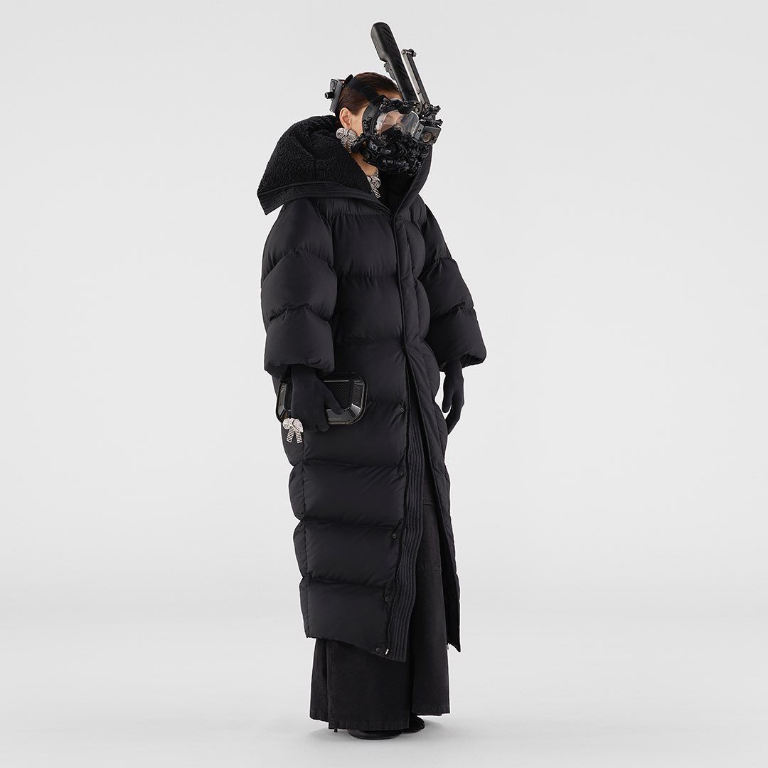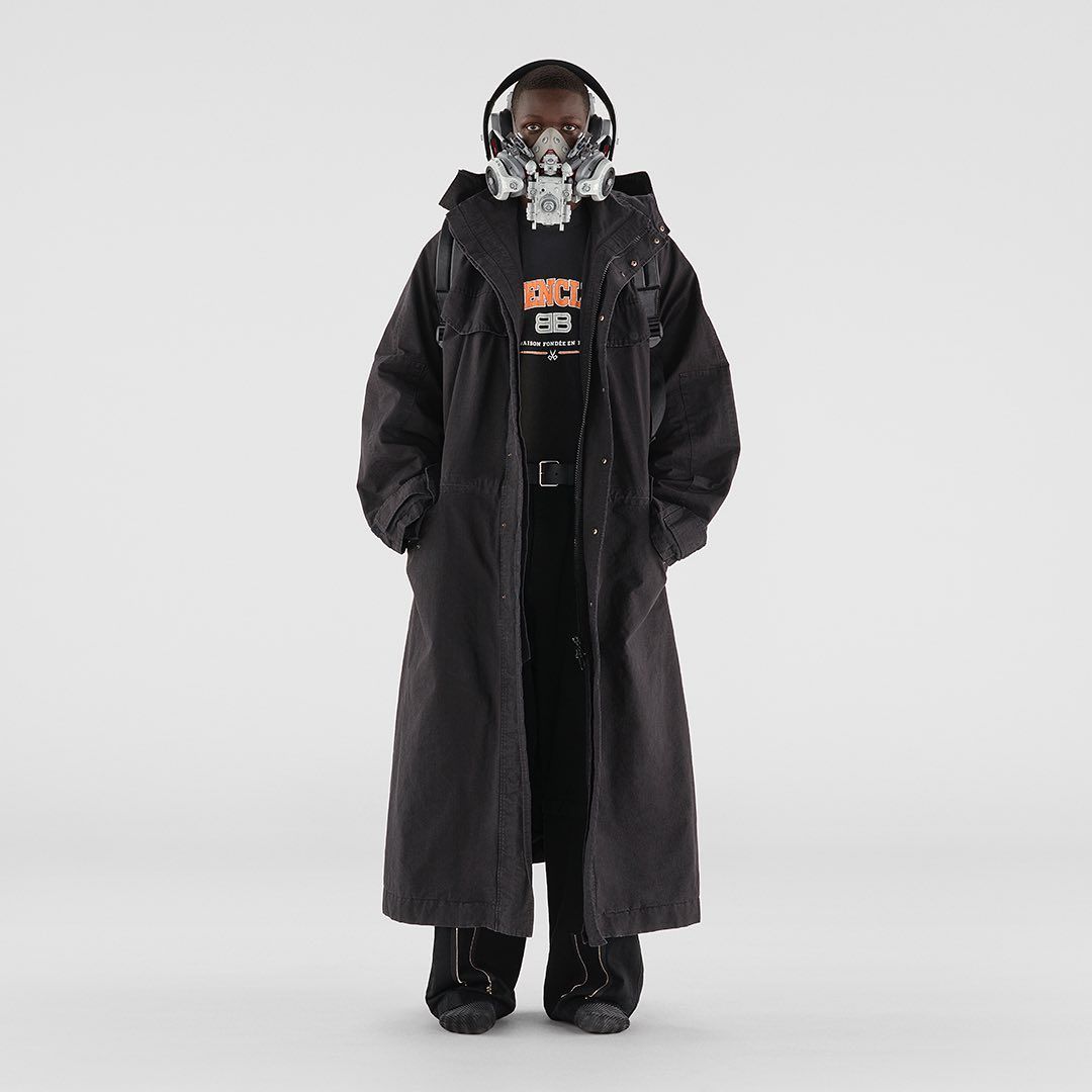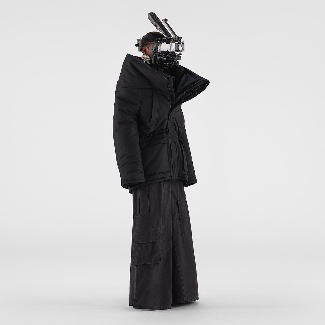 Trench e puffer over, jeans baggy, t-shirt con il logo, shopper extra large, i capi statement dell’estetica by Demna si arricchiscono di maschere robotiche. Proprio le maschere, il vero trend di stagione reso tale dalla collaborazione fra Balenciaga, Kim Kardashian e Kanye West con accessori che vanno dal fetish al grottesco, in questo caso diventano robotiche grazie a Ikeuchi, ispirandosi ai mecha o mech, enormi robot tipici di manga e anime della tradizione giapponese. Il culmine della campagna rivelata fino ad ora è un vero e proprio Skeleton che sembra uscito direttamente da Aliens, film di Ridley Scott del 1986, che porta avanti la riflessione sul rapporto uomo-tecnologia sotto una luce completamente nuova.