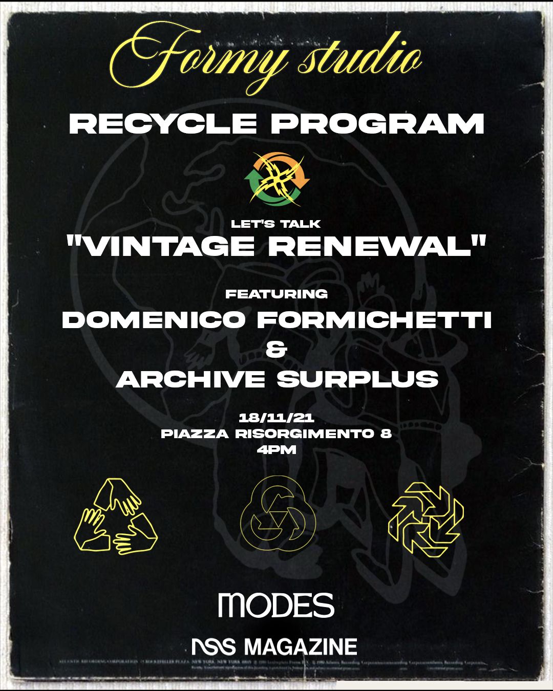 L'appuntamento è per giovedì 18 novembre da Modes a Milano, dalle 16 con il talk con protagonista Archive Surplus e dalle 17 alle 21 con la presentazione della nuova capsule di Formy Studio.