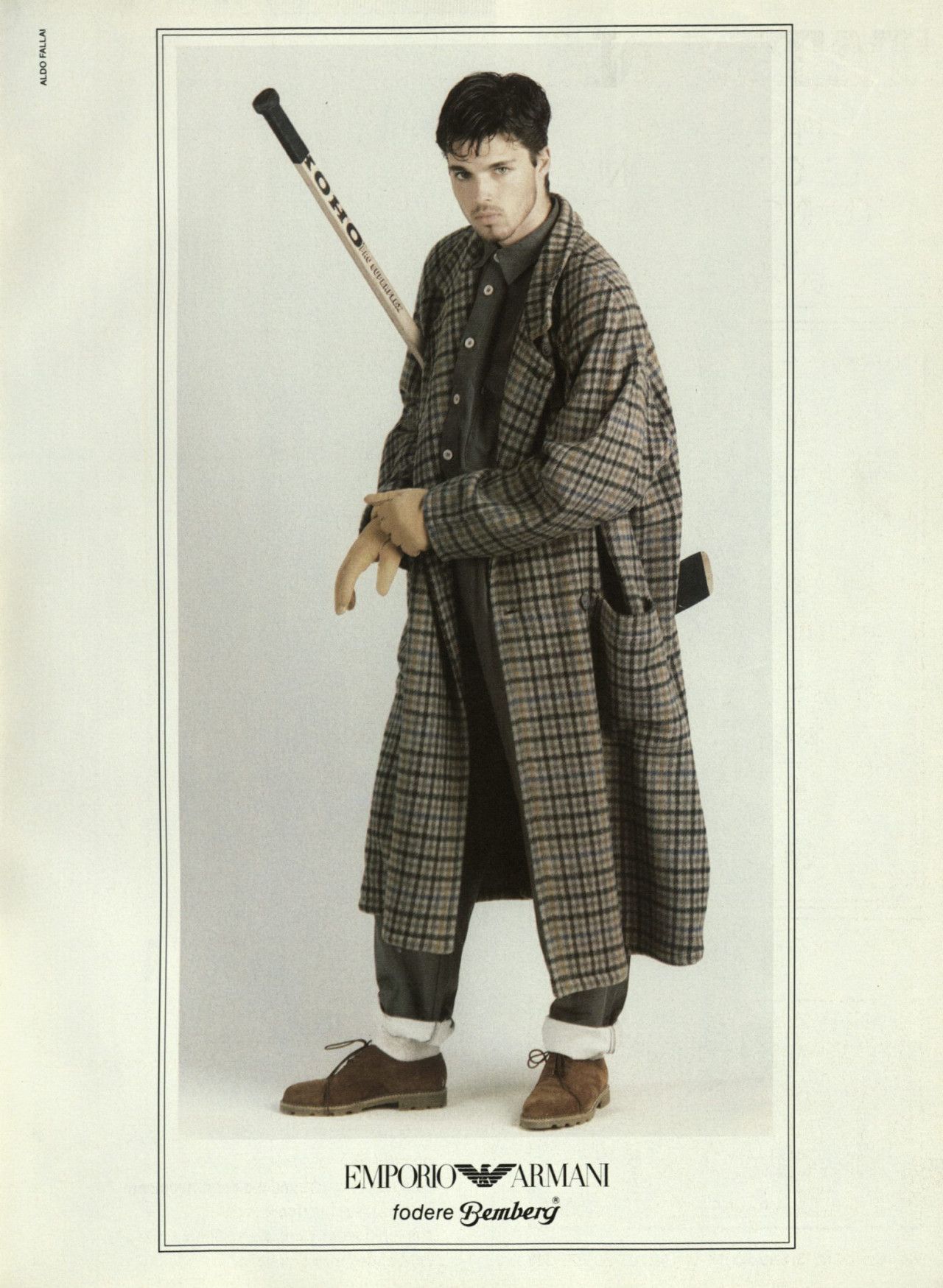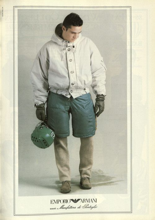 Lo shooting più rappresentativo delle potenzialità di Emporio risale al 1986, fu firmato da Dellai. A differenza della maggior parte delle campagne, era a colori, e lo styling includeva un mix molto eclettico di capi e texture abbinati a paraginocchi di pelle, racchette da neve, mazze e caschi da hockey unite a morbidi maglioni oversize a quadri, pantaloni in velluto, wallabee scamosciate e, nello scatto più bello, un cappotto bianco dalla sillhouette tondeggiante, abbinato a shorts trapuntati verdi indossati sopra pantaloni di velluto e stringate grigie – un accostamento di tessuti, volumi e proporzioni che pare uscito da una campagna di Aimé Leon Dore scattata l’altroieri e che invece ha poco meno di quarant’anni. Quella foto è emblematica della assoluta classicità di un’estetica che fa sembrare ancora del tutto desiderabili quei maglioni spessissimi e drappeggiati, quei blazer quadrettati, quei pantaloni così comodi – tutti prodotti poi in collaborazione con manifatture storiche come Comojersey, Manifattura di Pontoglio, la conceria Motta Alfredo e via dicendo.