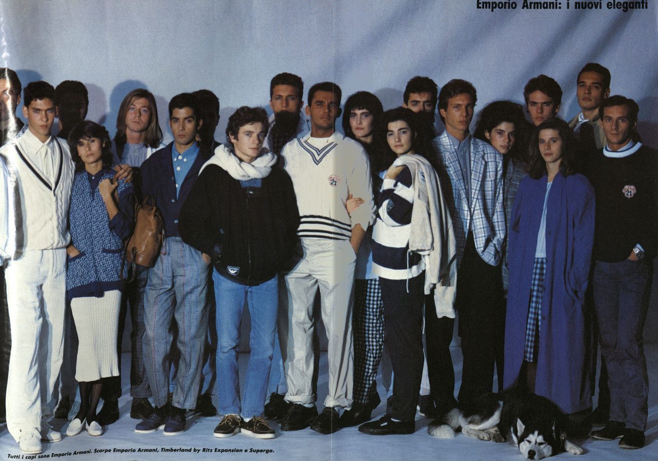 Armani aveva intuito che quei giovani sarebbero stati tutti suoi clienti se fosse riuscito a concepire un lusso alla mano ma elevato - il successo di Emporio Armani fu planetario. Se le campagne e gli editoriali dedicati alla mainline di Giorgio Armani rappresentavano un lusso più classico, ma sempre contraddistinto dalla tipica morbidezza e dal minimalismo dei completi del designer, lo storytelling che portò Emporio nella coscienza collettiva fu diverso: tramite la lente del leggendario fotografo Aldo Fallai, i poster e le campagne del brand proposero una nuova, eclettica estetica che anticipò di anni il gorpcore, il normcore, il mondo di Aimé Leon Dore e JJJJound e lo sportswear logato – tanto che già intorno al 1986, un giornale di moda pubblicava la foto di una legione di giovani in full look Emporio titolandola I nuovi eleganti.