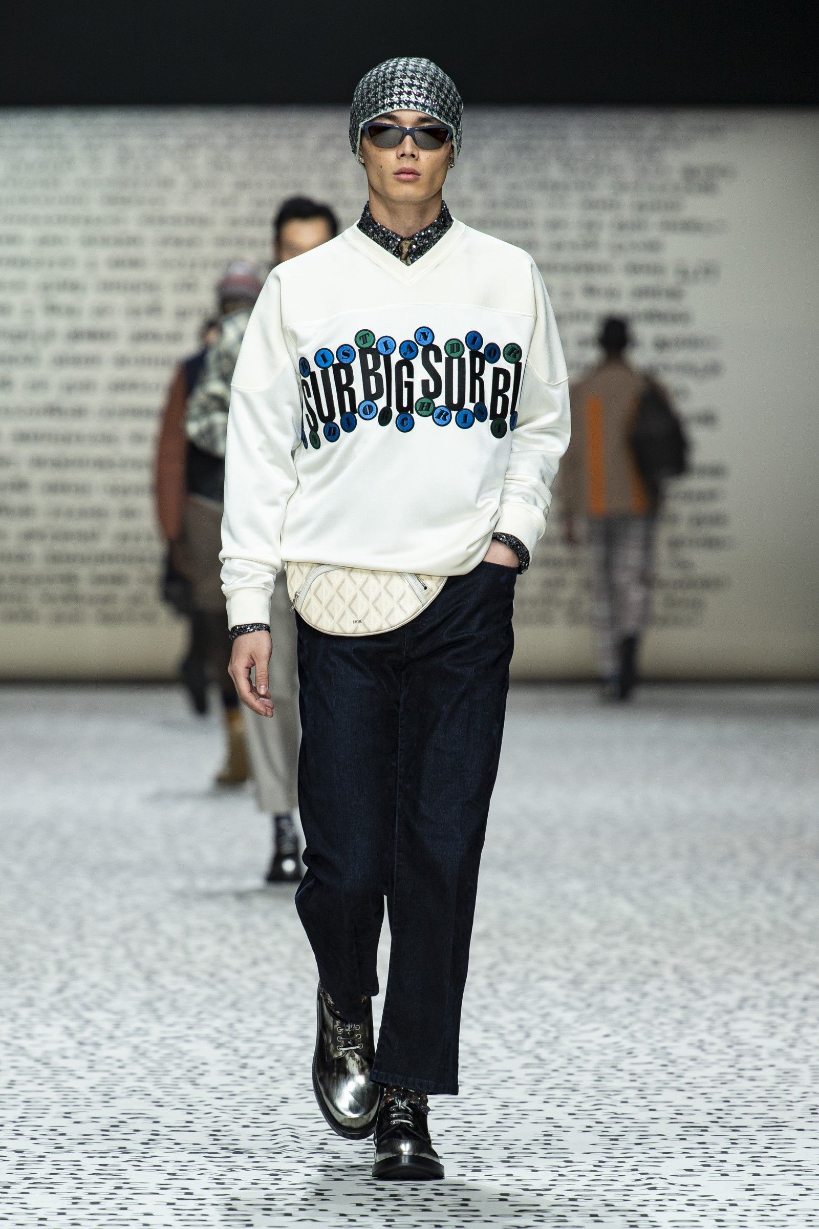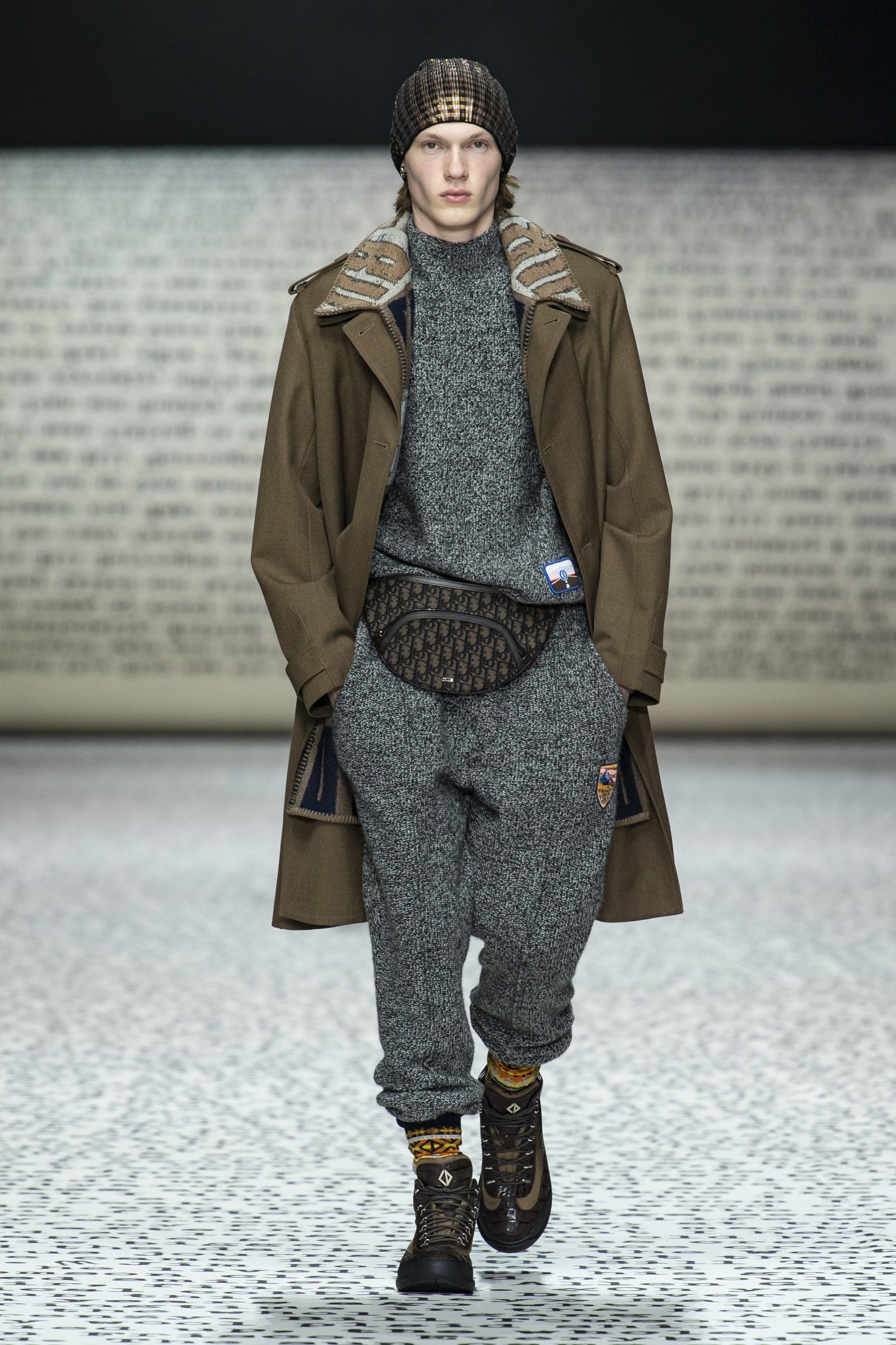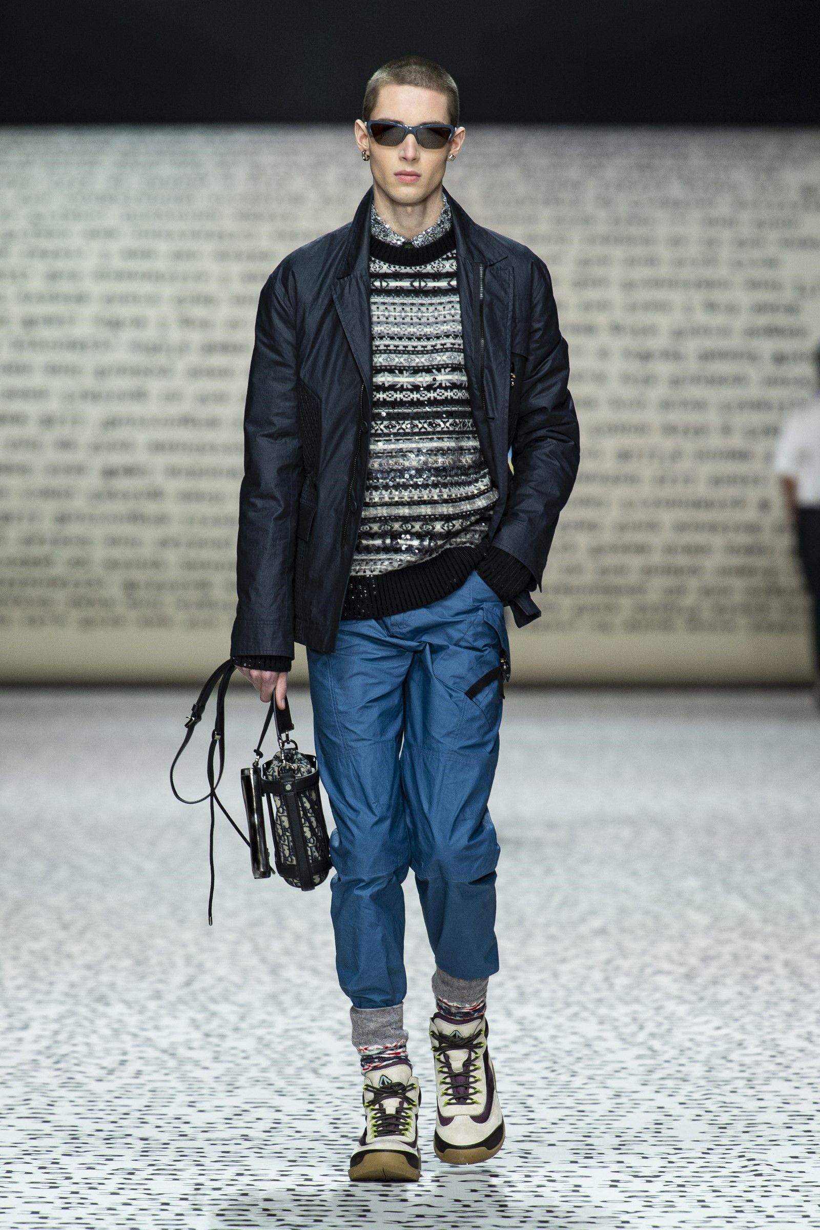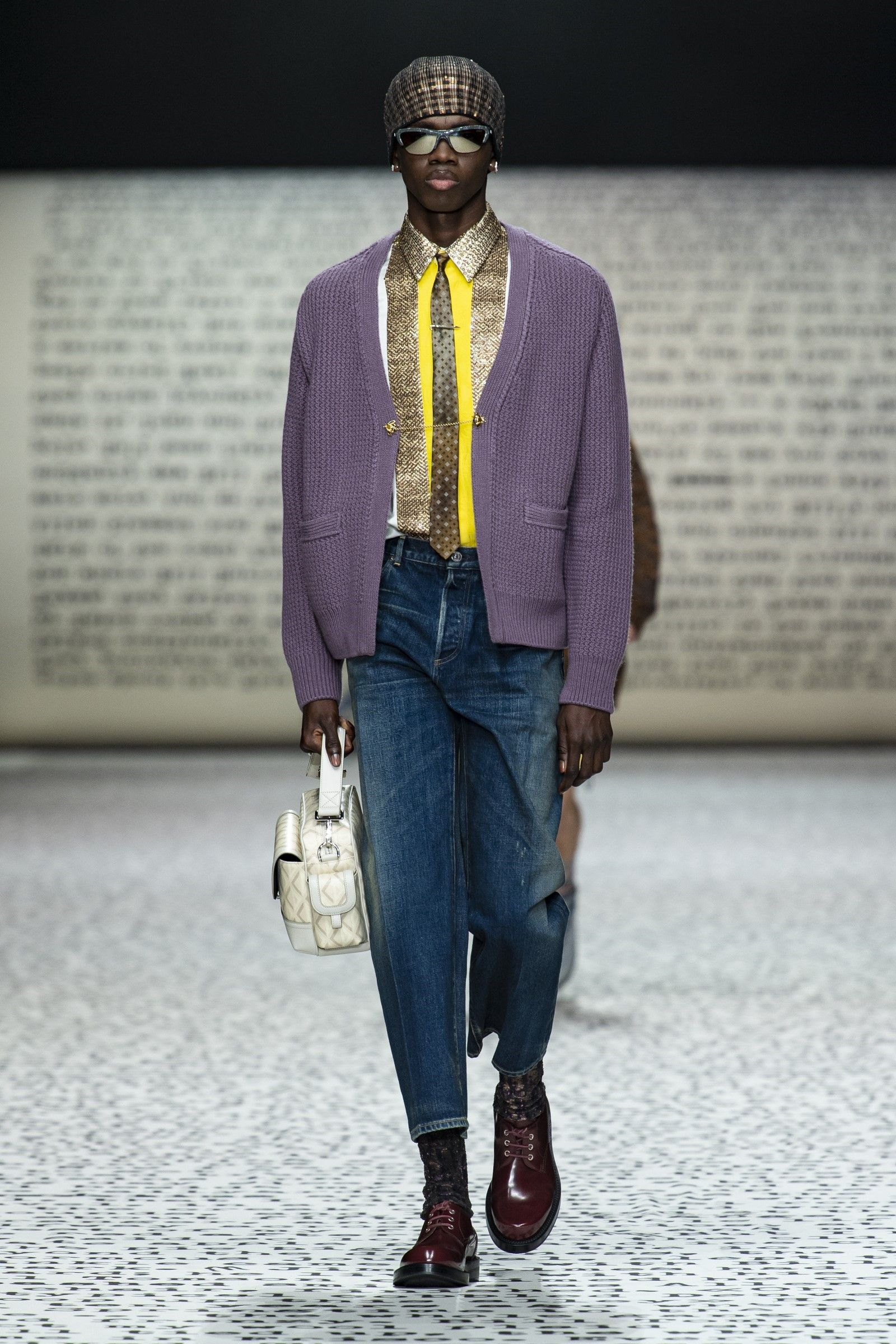 Ovviamente, come si diceva, il vintage è un punto di partenza e non di arrivo: sparpagliati nel corso dei 49 look sono apparsi vari completi di maglia e pantalone in bouclé di lana in tinta unita che spingono in avanti la definizione di luxury leisurewear; mentre dettagli techwear e grafiche bold hanno aggiunto, insieme al mix-and-match di stampe e colori, tocchi di estro e soprattutto grande desiderabilità e modernità alla collezione. La reinterpretazione dell’archivio del brand diventa dunque assai interessante considerando come, vista l’enormità degli archivi di Dior, tornare a rivalutare quel patrimonio di knitwear e tutto il repertorio del menswear classico significa gettare una luce su un periodo trascurato della storia del brand ma anche dare senso e ragion d’essere a un’estetica che, senza quei tocchi moderni e quella reinterpretazione messa in atto da Kim Jones, sarebbe soltanto passé.