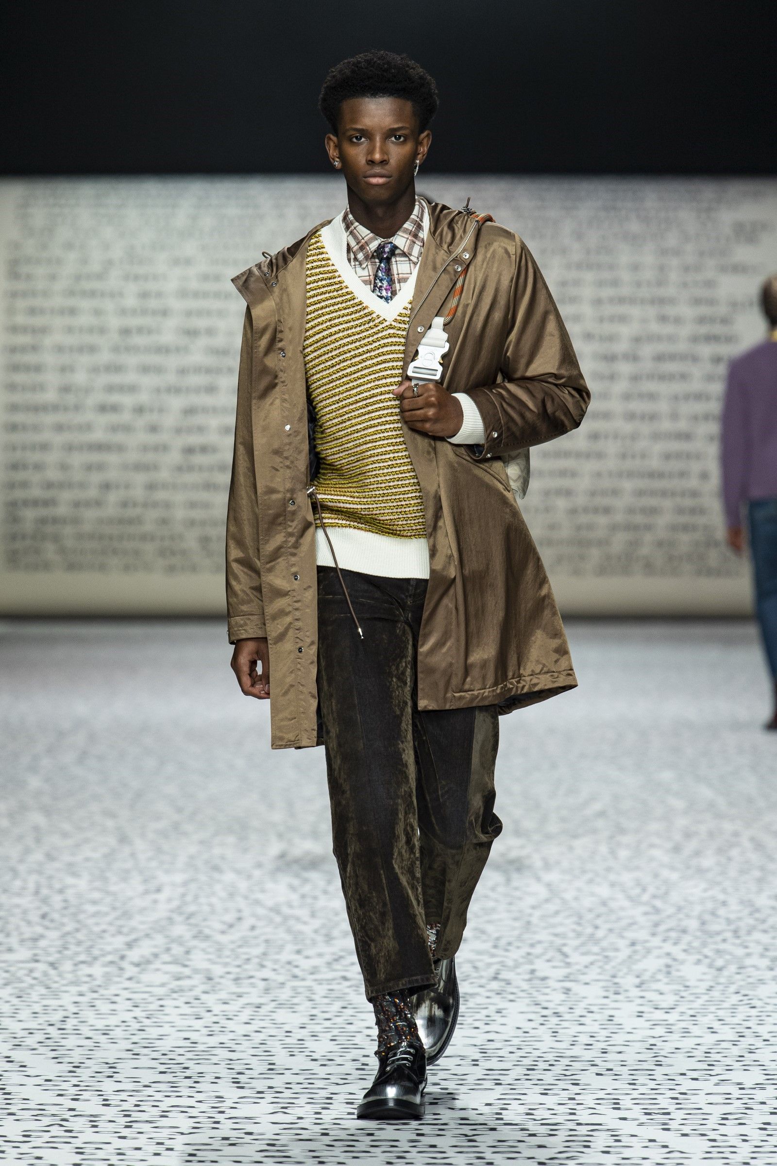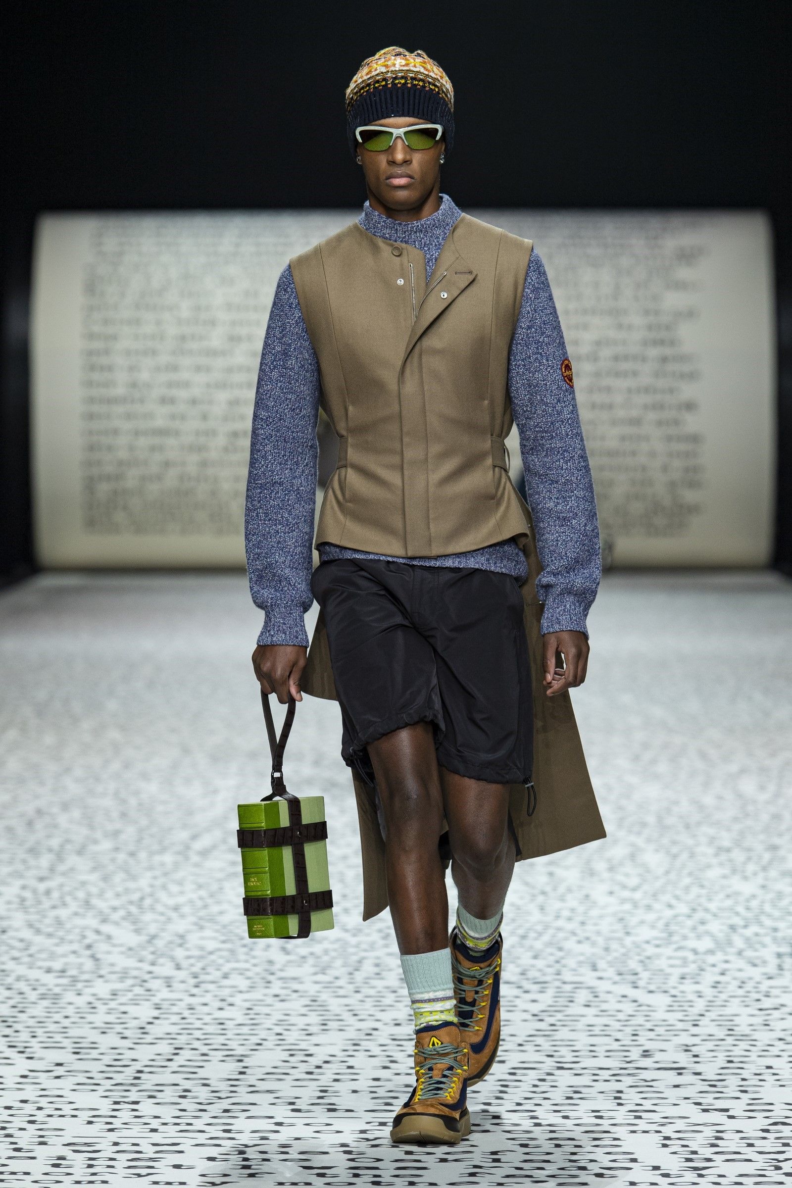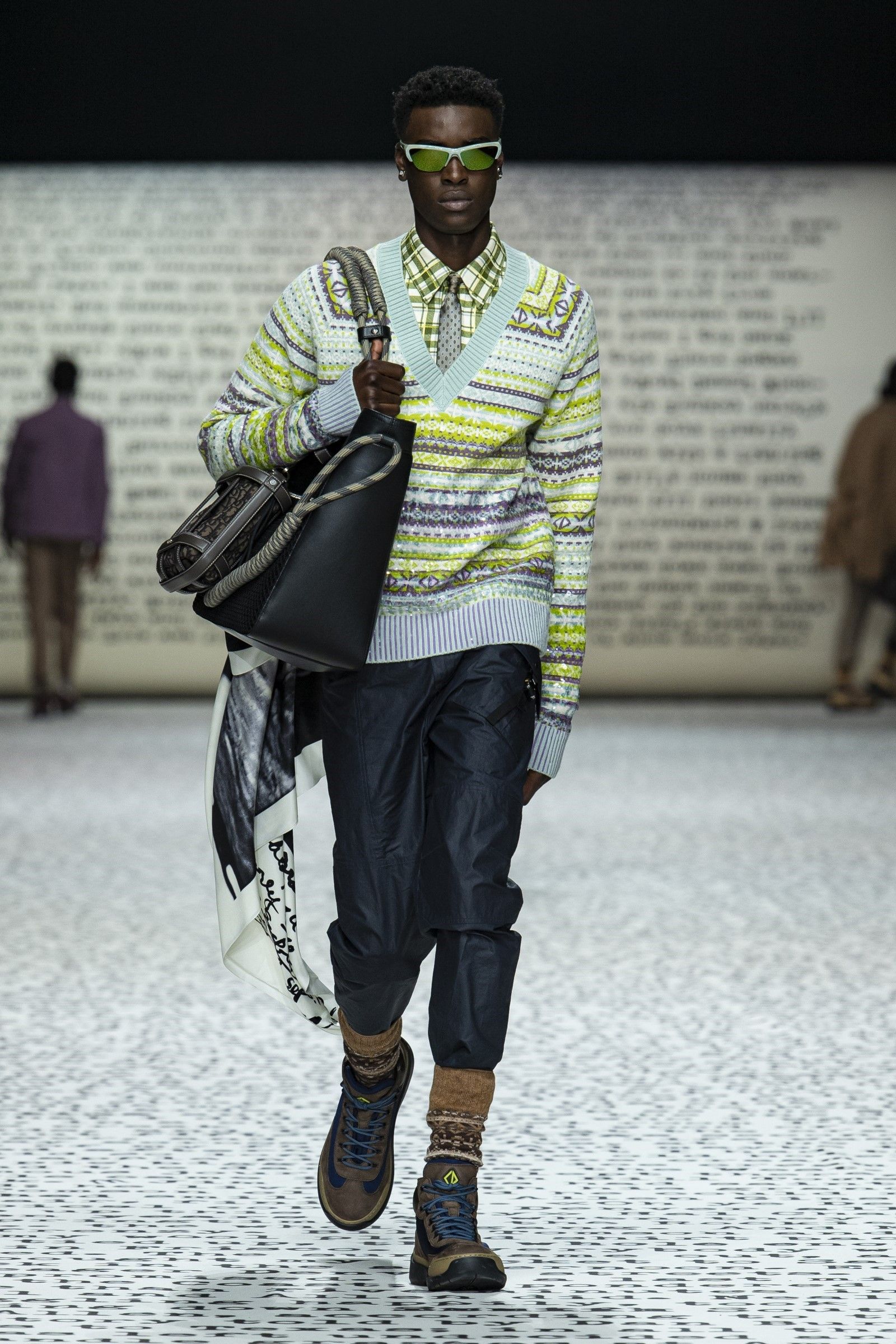 Ovviamente, come si diceva, il vintage è un punto di partenza e non di arrivo: sparpagliati nel corso dei 49 look sono apparsi vari completi di maglia e pantalone in bouclé di lana in tinta unita che spingono in avanti la definizione di luxury leisurewear; mentre dettagli techwear e grafiche bold hanno aggiunto, insieme al mix-and-match di stampe e colori, tocchi di estro e soprattutto grande desiderabilità e modernità alla collezione. La reinterpretazione dell’archivio del brand diventa dunque assai interessante considerando come, vista l’enormità degli archivi di Dior, tornare a rivalutare quel patrimonio di knitwear e tutto il repertorio del menswear classico significa gettare una luce su un periodo trascurato della storia del brand ma anche dare senso e ragion d’essere a un’estetica che, senza quei tocchi moderni e quella reinterpretazione messa in atto da Kim Jones, sarebbe soltanto passé.