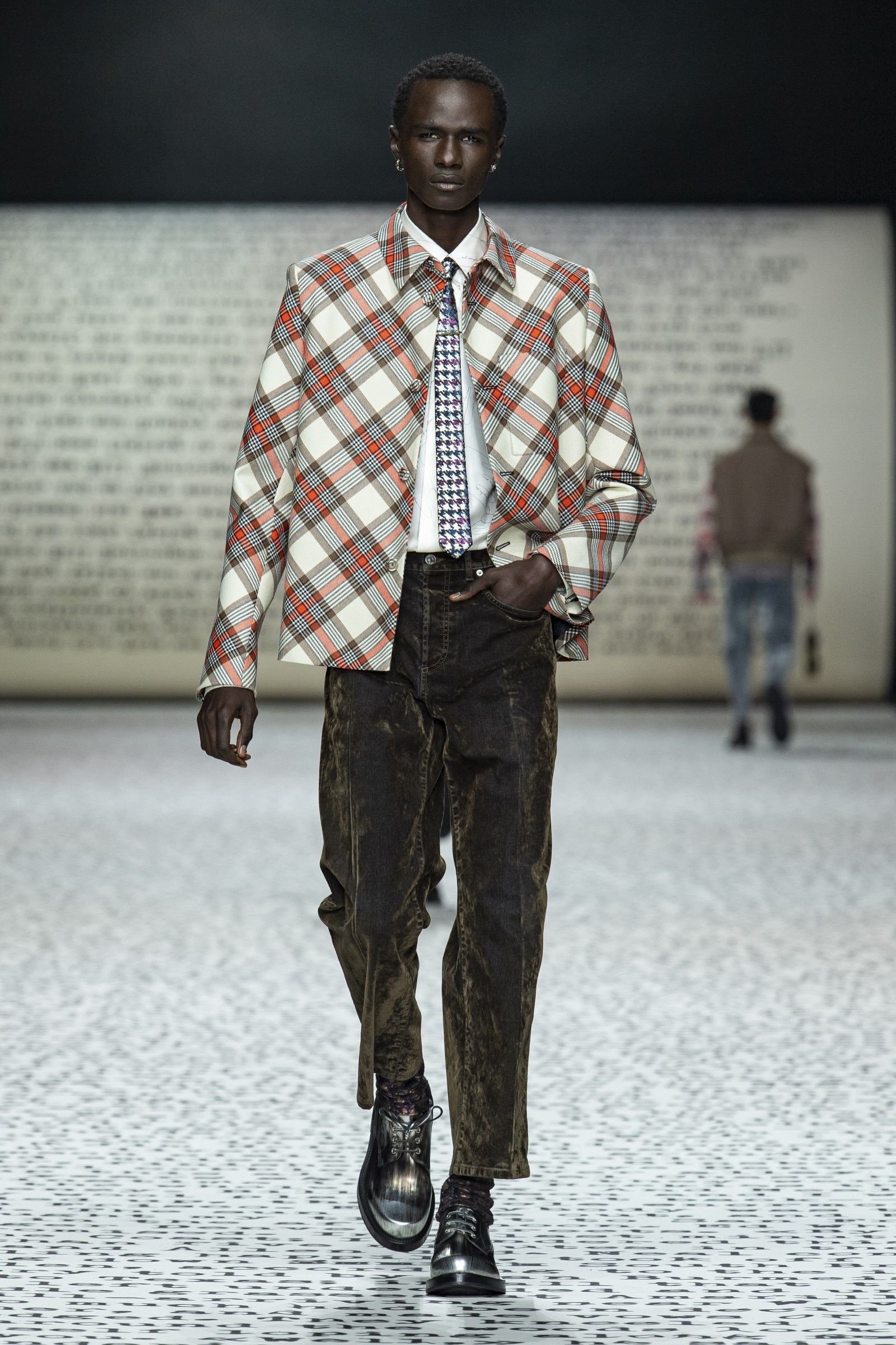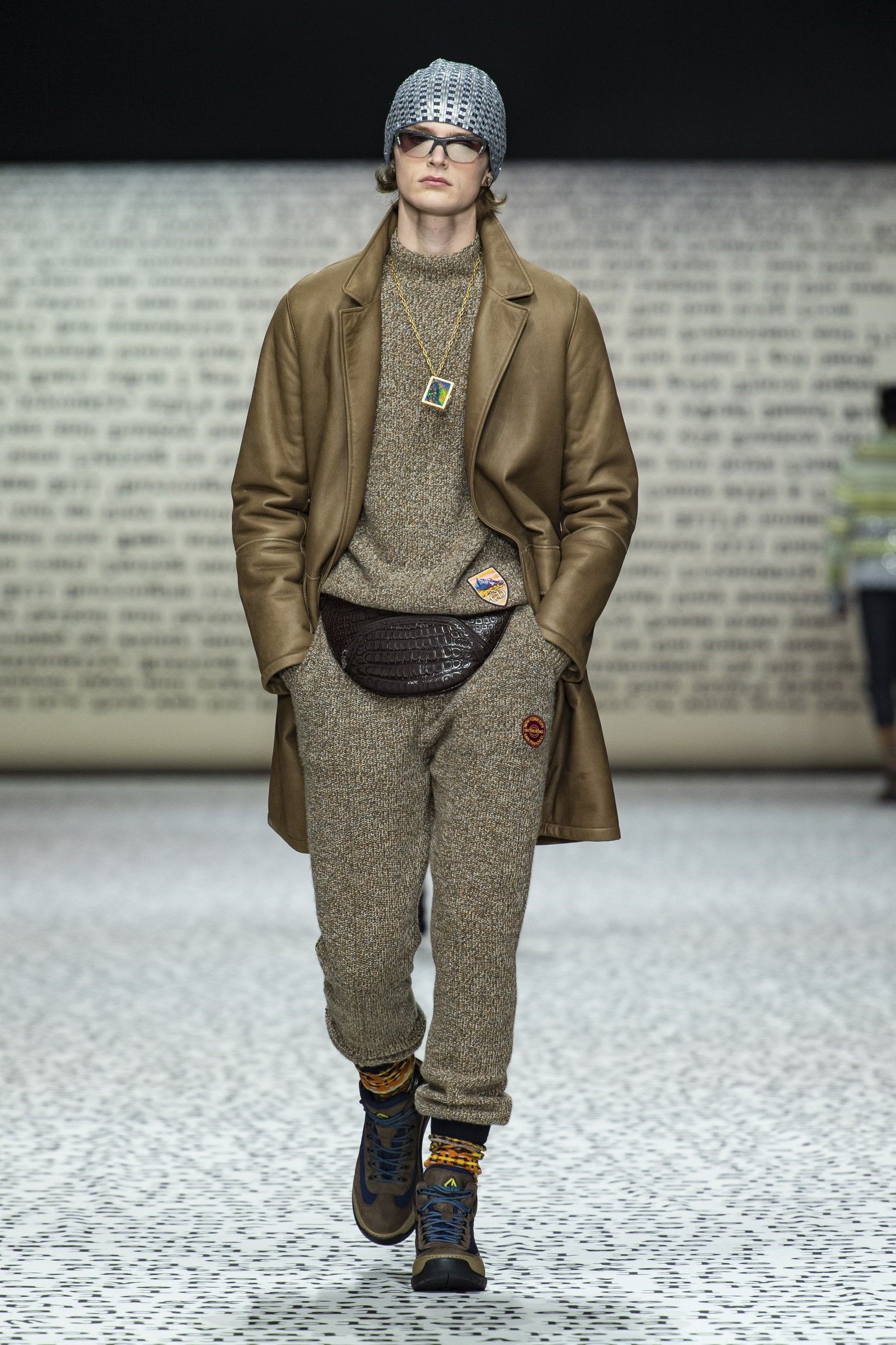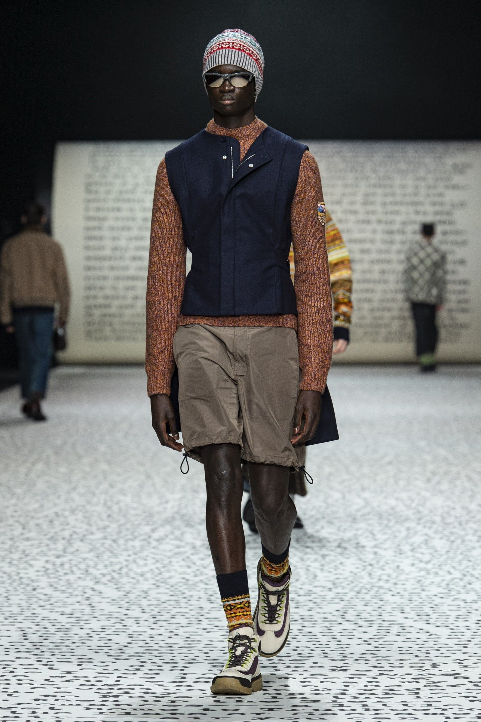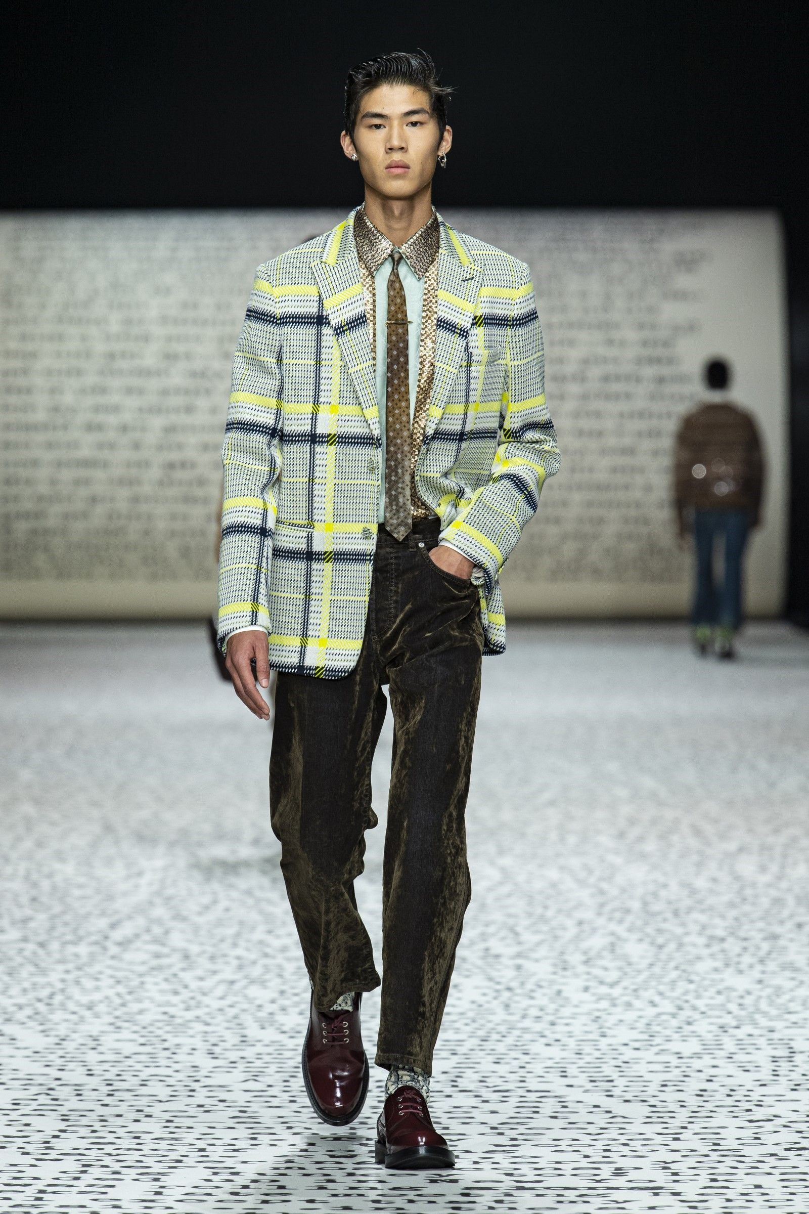 Ovviamente, come si diceva, il vintage è un punto di partenza e non di arrivo: sparpagliati nel corso dei 49 look sono apparsi vari completi di maglia e pantalone in bouclé di lana in tinta unita che spingono in avanti la definizione di luxury leisurewear; mentre dettagli techwear e grafiche bold hanno aggiunto, insieme al mix-and-match di stampe e colori, tocchi di estro e soprattutto grande desiderabilità e modernità alla collezione. La reinterpretazione dell’archivio del brand diventa dunque assai interessante considerando come, vista l’enormità degli archivi di Dior, tornare a rivalutare quel patrimonio di knitwear e tutto il repertorio del menswear classico significa gettare una luce su un periodo trascurato della storia del brand ma anche dare senso e ragion d’essere a un’estetica che, senza quei tocchi moderni e quella reinterpretazione messa in atto da Kim Jones, sarebbe soltanto passé.
