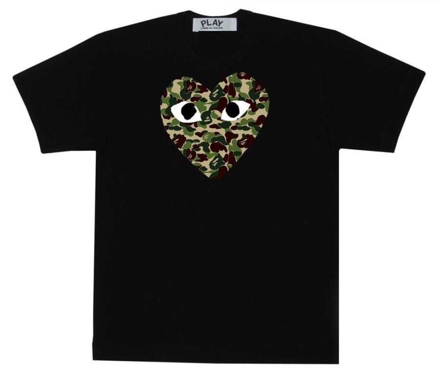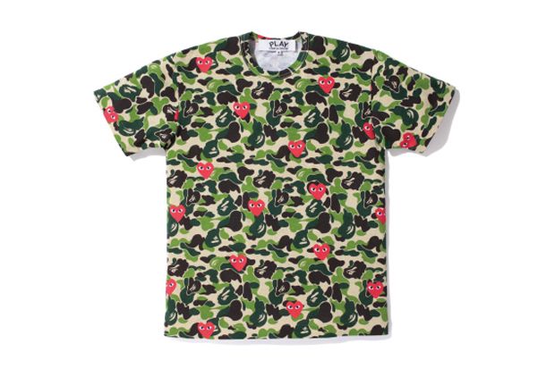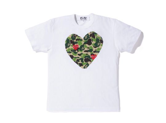 L'attesa è finita, A Bathing Ape e PLAY Comme des Garcons lanciano una limited edition T-Shirt capsule, dove le loro grafiche più iconiche, si mescolano, dando come risultati cuori in patterns mimetici, fonts di Bape su quelli di CDG e grafiche All-Over. Sarà disponibile per la vendita a partire dal 16 Marzo.
