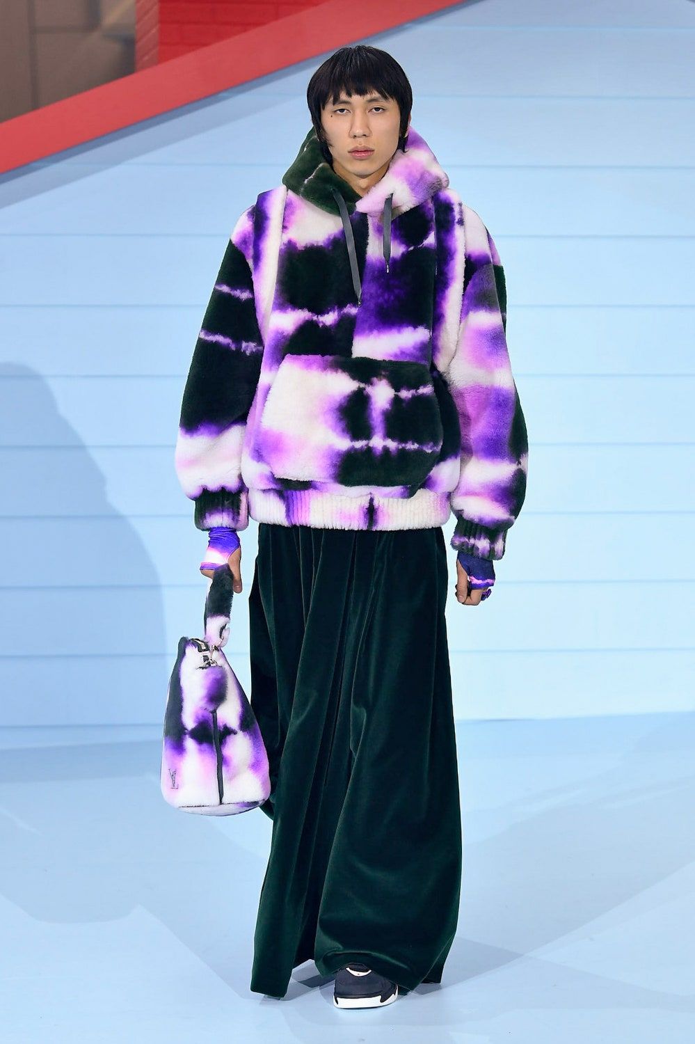 Una delle parti migliori della collezione sono state le borse: proprio perché borse e zaini sono il prodotto più iconico di Louis Vuitton, il lavoro di sovversione delle aspettative e dei pregiudizi di Abloh ha stravolto la stampa Damier facendola diventare un’illusione ottica, la pelle dei borsoni diventa ora pelliccia shearling, ora mosaico di cuoio e PVC, le borse di coccodrillo sono tinte in tie-dye e ricoperte da una gommatura mentre, al contrario, le borse da Triathlon e le protezioni usate nelle arti marziali si trasformano in accessori di lusso. Un tipo di visione, infusa di elementi autobiografici e ragionamenti culturali, che le note descrivono così: