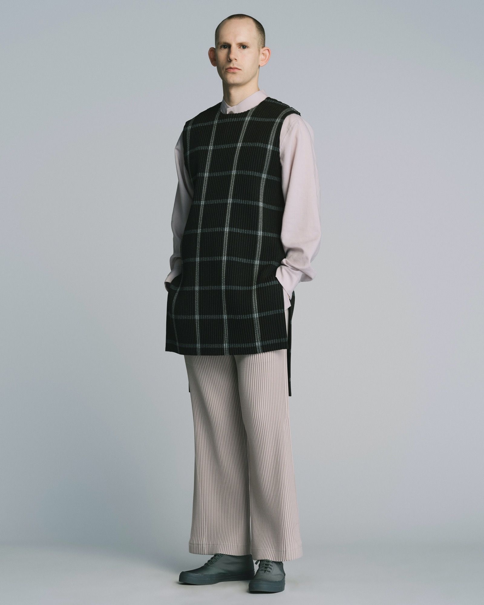 LANTERN è una serie con stampa che esprime la luce di una lanterna brillare attraverso una tenda il tutto realizzato. attraverso molti delicati disegni a pastello. Realizzato in tessuto intrecciato con filato elastico in trama, invece, FLIP COAT presenta una silhouette semplice dalla struttura morbida e croccante. L'orlo può essere ripiegato fino alle spalle e fissato con cinghie, trasformando il cappotto in una giacca leggera e voluminosa. FRAME COAT è una serie di capispalla imbottiti che prende ispirazione dalla costruzione di una tenda. Il design integra la struttura della tenda nella struttura del capo.