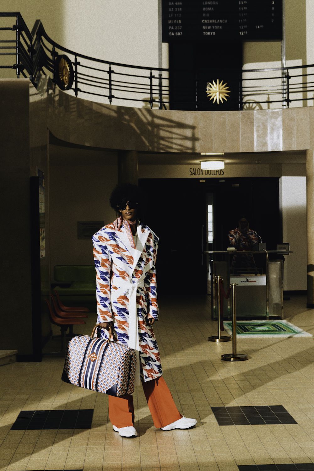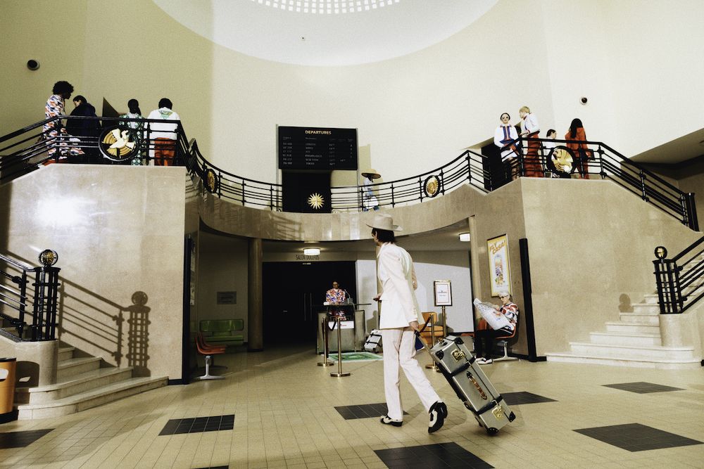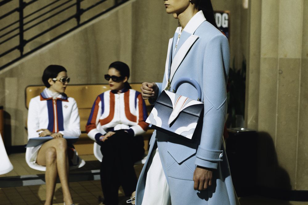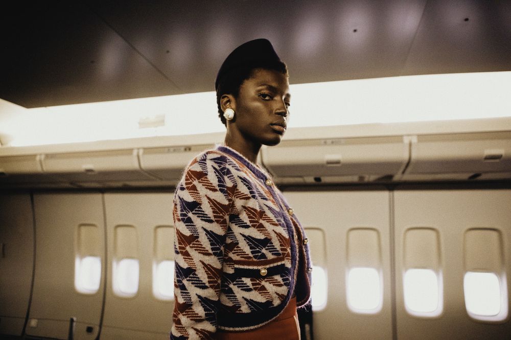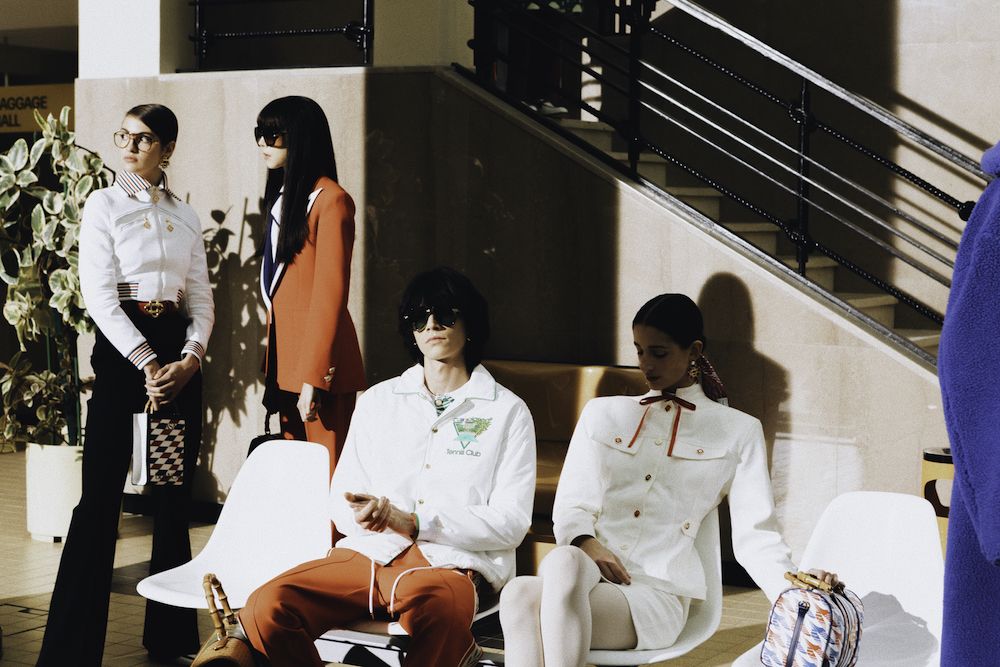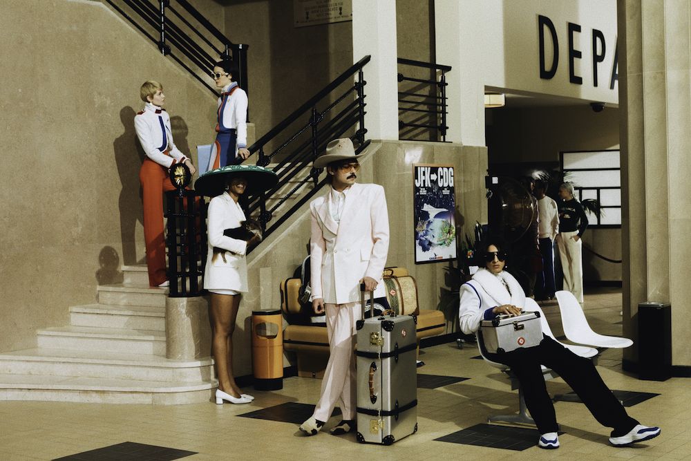 Nel video della campagna con l'attrice Emma Mackey, l'audacia e l'altitudine del viaggio, così come il linguaggio del design architettonico di Parigi, vengono celebrati attraverso location iconiche, come l'aeroporto Le Bourget, il ristorante Le Train Bleu e la Maison Darre - una panoramica della città a cavallo tra classicismo e contemporaneità. Capi sartoriali si arricchiscono di stampe preppy e cappelli a tesa larga, occhiali oversize, stivali western in un connubio perfetto che ben rappresenta il lusso contemporaneo e che allo stesso tempo ci teletrasporta negli anni '70. I capi in seta caratteristici di Casablanca si arricchiscono di stampe aeronautiche nel tricolore francese, che percorrono tutta la collezione, culminando nel capospalla trapuntato in raso, pezzo clou della collezione. Elementi ricamati a mano come perle, cristalli, paillettes, piume e perline possono essere visti su twin-set, maglieria, abiti e sartoria, a rappresentare il cielo notturno sfumato così come lo si vede dalla finestra di un aeroplano.