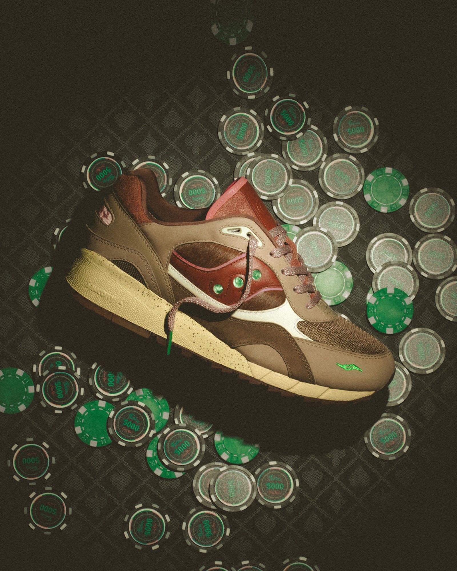 Come ultima puntata dell’High Roller Pack, Saucony ha presentato la nuova sneaker Shadow 6000 "Chocolate Chip" creata in collaborazione con la leggendaria sneaker boutique di Las Vegas FEATURE che ha firmato una colorway esclusiva ispirata allo stile retrò delle fiches da poker da $ 5.000. La sneaker sarà presentata con una collaborative box a tema che segue l’ispirazione pokeristica, in particolare con le sfumature verdi che rimandano al classico tavolo verde da poker su cui si gioca a Las Vegas, chiudendo il cerchio tematico dell’High Roller Pack di Saucony.