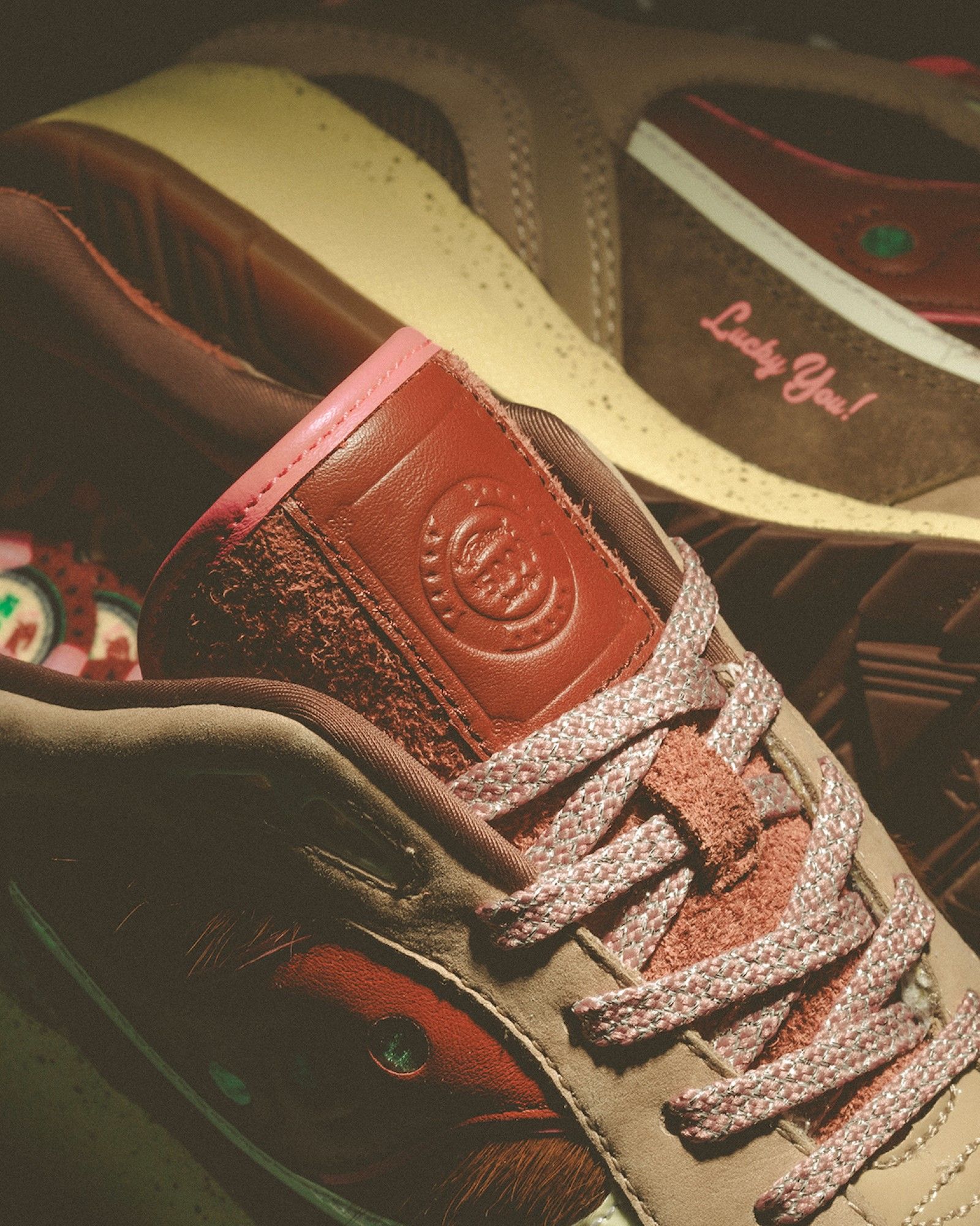La nuova versione limitata della Shadow 6000 è stata prodotta in materiali premium come il nabuk, la pelle bottalata e verniciata, lo shaggy suede per alcuni dettagli di linguetta e tallone e, infine, il velluto utilizzati per i tre iconici dots laterali e per il panel sul tallone. Il colore predominante è il marrone in diverse tonalità cui si aggiungono inserti e dettagli in rosa, bianco e verde. Sulla linguetta è impressa la versione di FEATURE di una fiche da $ 5.000 - stampata anche all-over sulla inner sole, il cavallino sintetico che caratterizza i pannelli laterali con puntale in mesh per una traspirabilità ottimale e l’ammiccante scritta in rosa Lucky You!