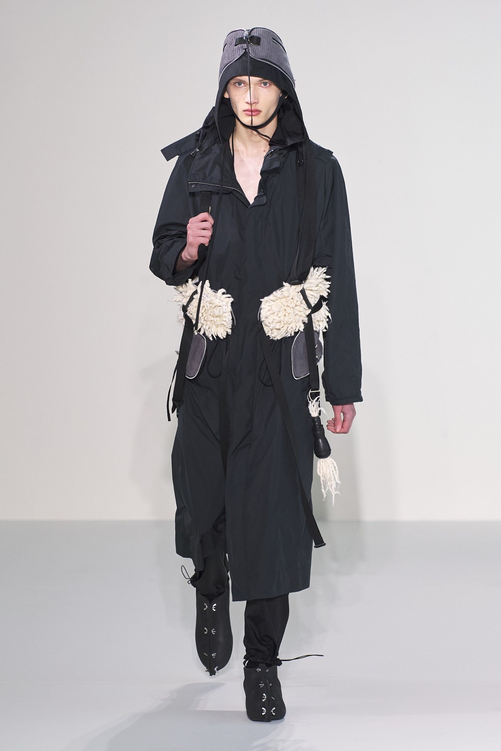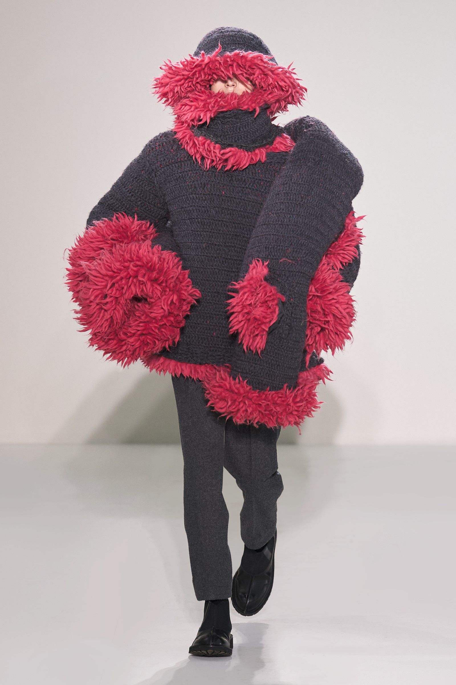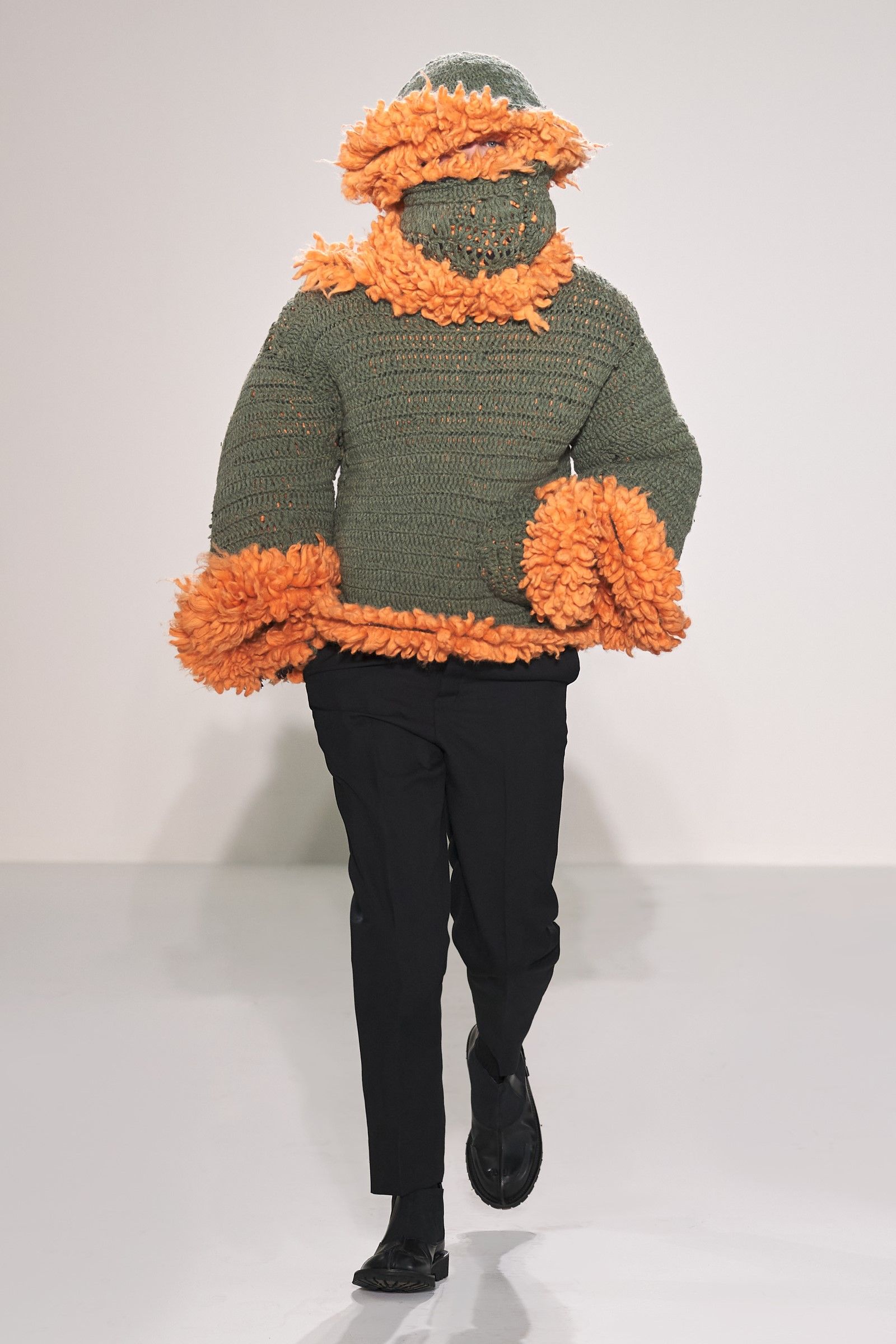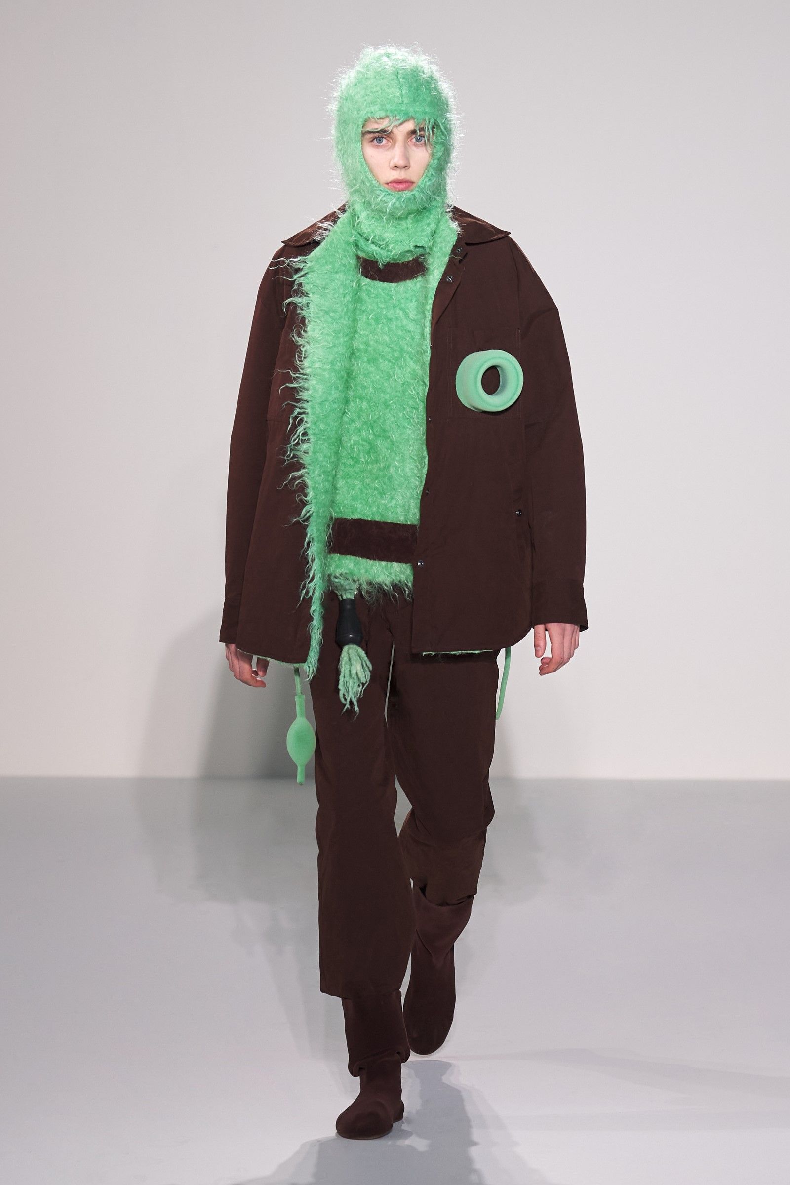 C’è stato effettivamente, nel corso dello show, il senso di un riversamento all’esterno di ciò che era all’interno, come una struttura che si rompe rivelando la sua costruzione e anatomia interna, ma anche una ricostruzione del senso tattile degli abiti con, ad esempio, una giacca marrone che era liscia fuori e aveva un interno villoso di mohair verde – chi la indossa ne sente la morbidezza, ma non chi la guarda; o anche elementi sintetici, di latex o simili al materiale delle mute da sub, che si rovesciano verso l’esterno, rivelano le particolarità dell’interno come il trench che, nei risvolti delle maniche e negli inserti sintetici, sembra lasciare intuire la presenza di un interno in gomma blu che prova a emergere. Alla fine dello show, una serie di look di maglieria includono una specie di hoodie di lana oversize che all'interno è rigonfia di spessissimo mohair le cui frange fuoriescono fuori come fodere di pelliccia e le cui maniche sono anatomicamente inesatte producendo l'impressione di una strana creatura marina.