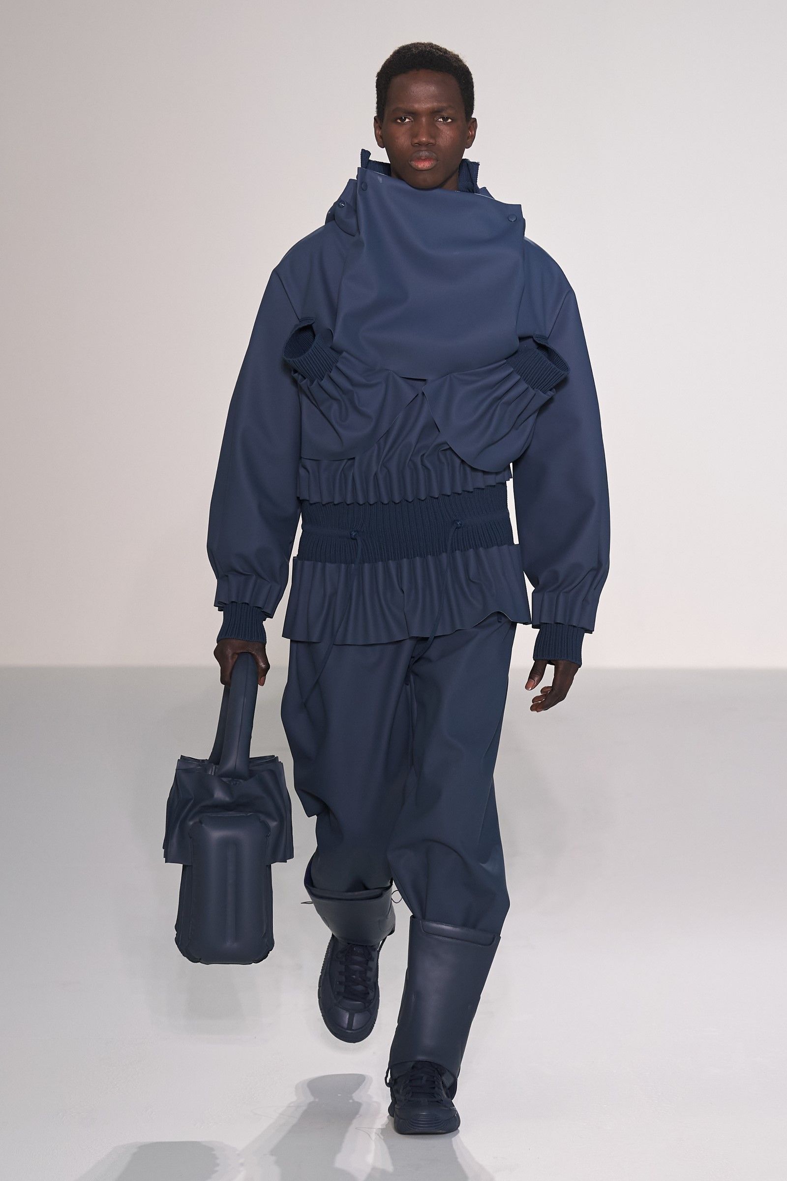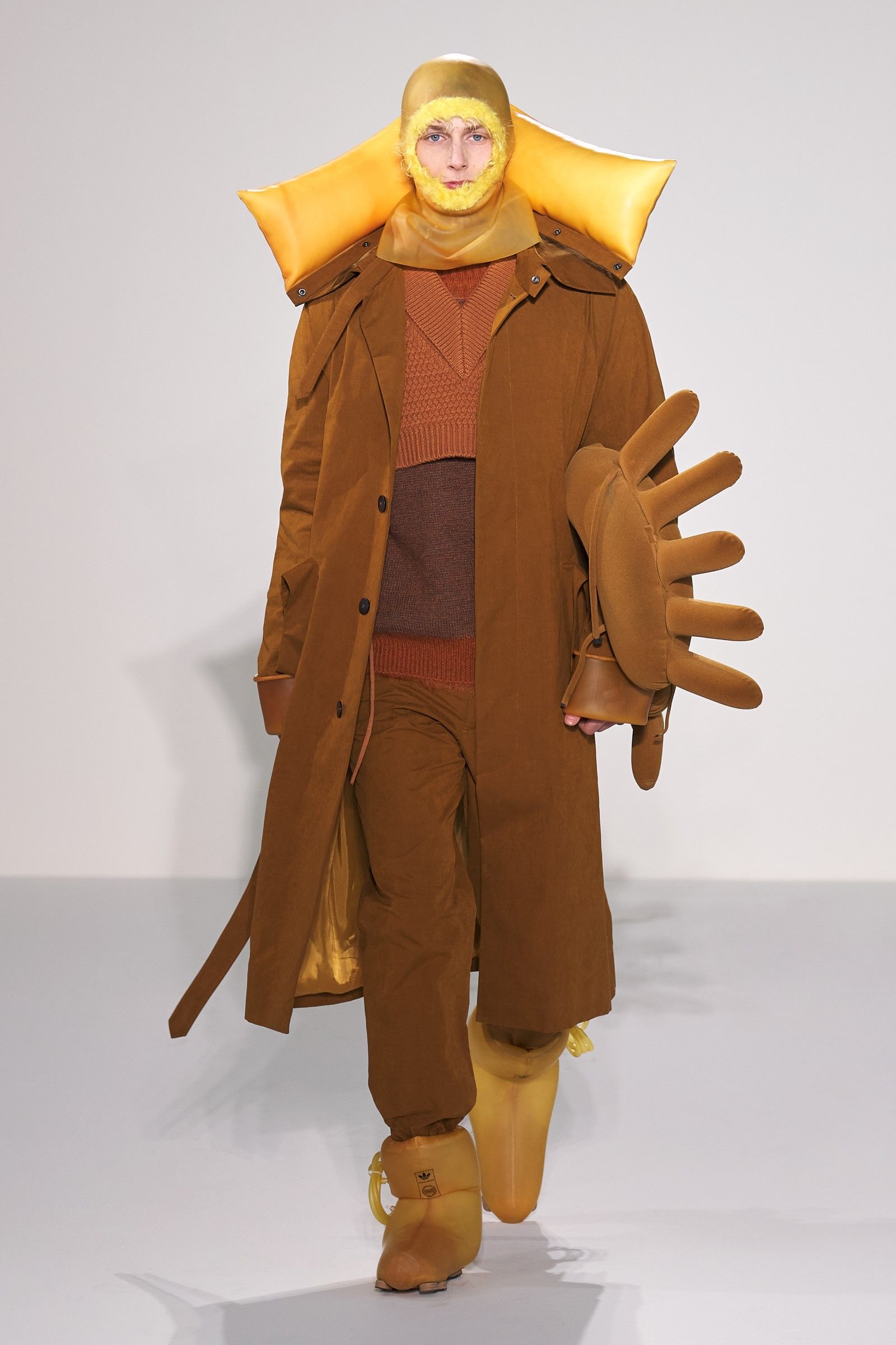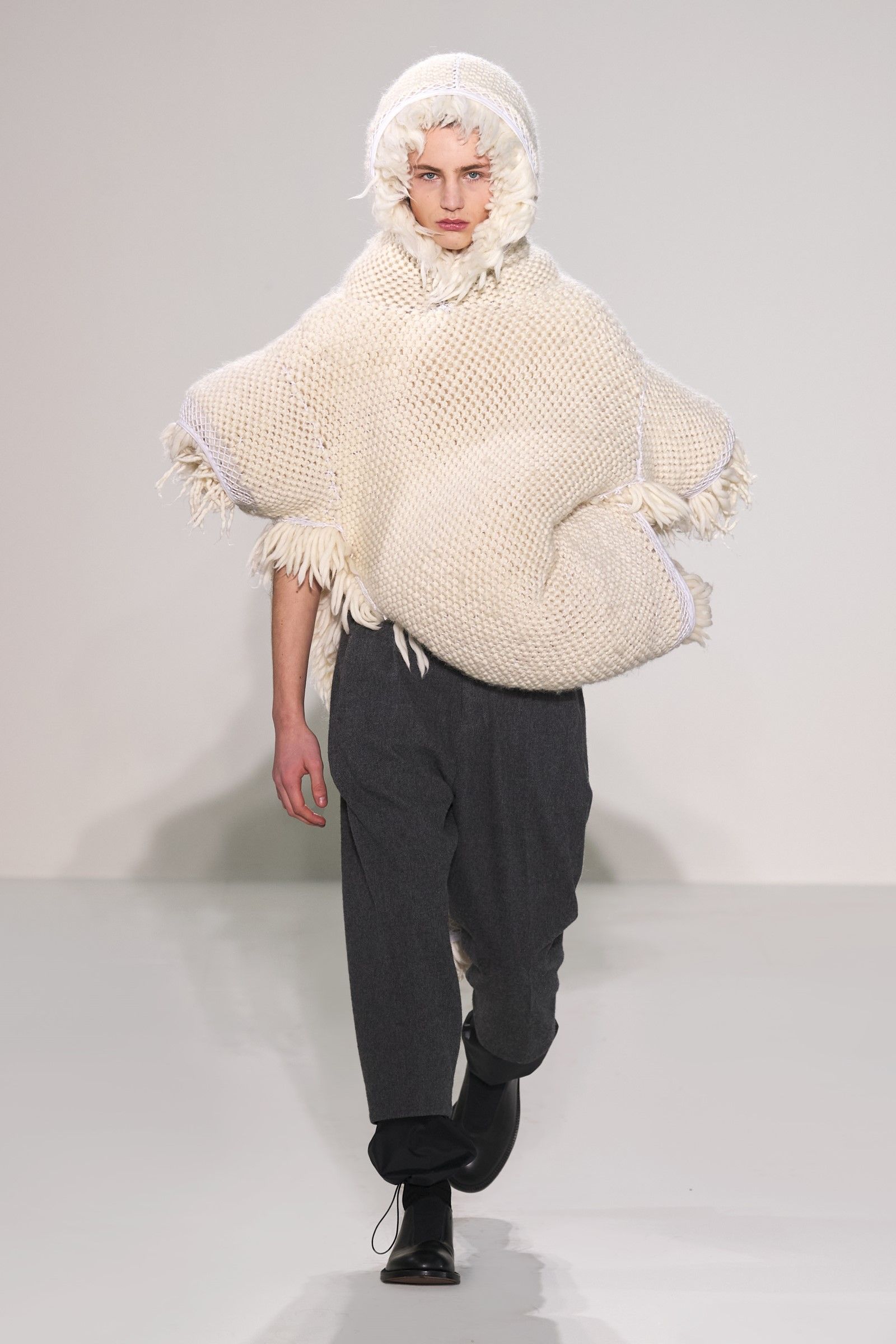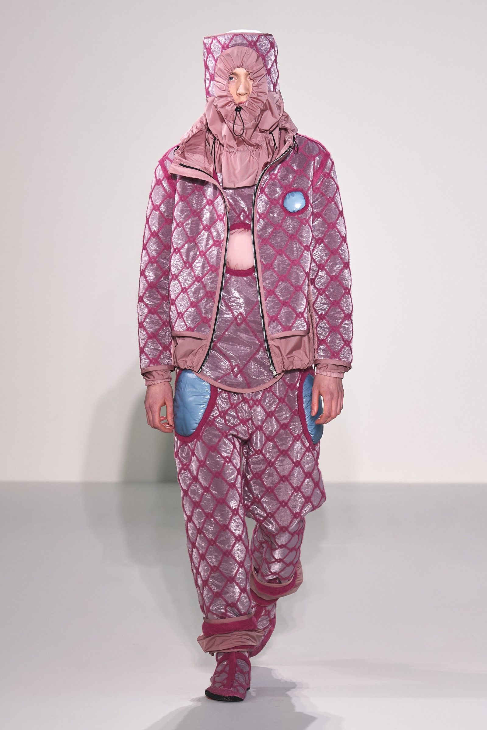 C’è stato effettivamente, nel corso dello show, il senso di un riversamento all’esterno di ciò che era all’interno, come una struttura che si rompe rivelando la sua costruzione e anatomia interna, ma anche una ricostruzione del senso tattile degli abiti con, ad esempio, una giacca marrone che era liscia fuori e aveva un interno villoso di mohair verde – chi la indossa ne sente la morbidezza, ma non chi la guarda; o anche elementi sintetici, di latex o simili al materiale delle mute da sub, che si rovesciano verso l’esterno, rivelano le particolarità dell’interno come il trench che, nei risvolti delle maniche e negli inserti sintetici, sembra lasciare intuire la presenza di un interno in gomma blu che prova a emergere. Alla fine dello show, una serie di look di maglieria includono una specie di hoodie di lana oversize che all'interno è rigonfia di spessissimo mohair le cui frange fuoriescono fuori come fodere di pelliccia e le cui maniche sono anatomicamente inesatte producendo l'impressione di una strana creatura marina.