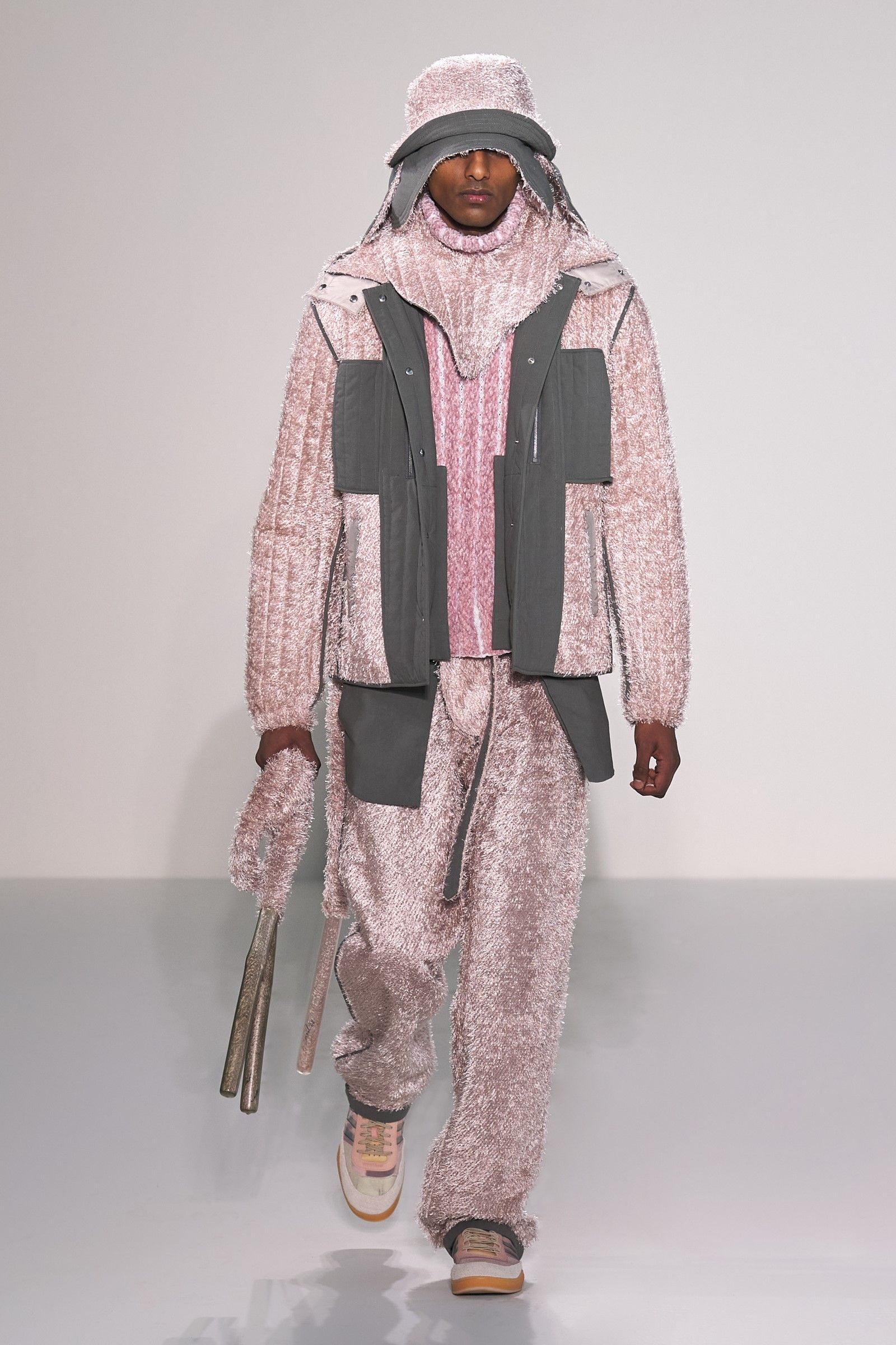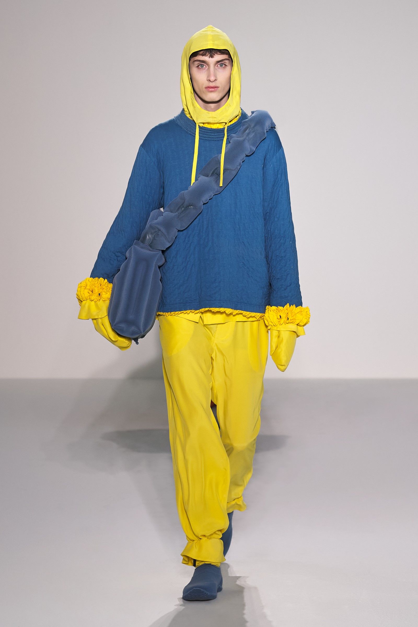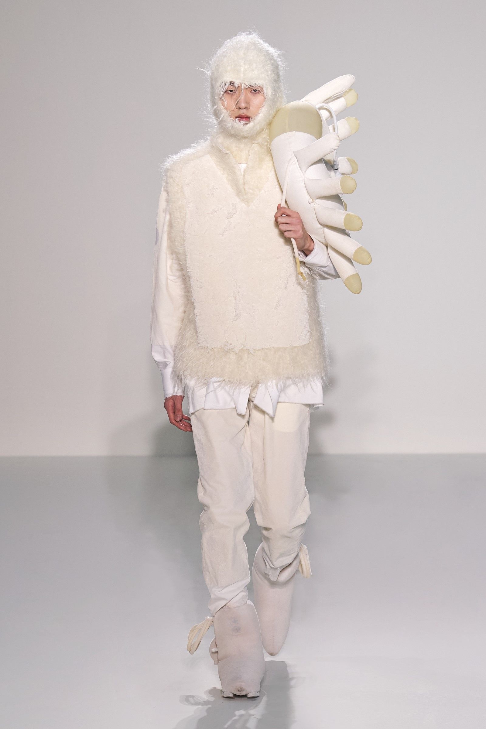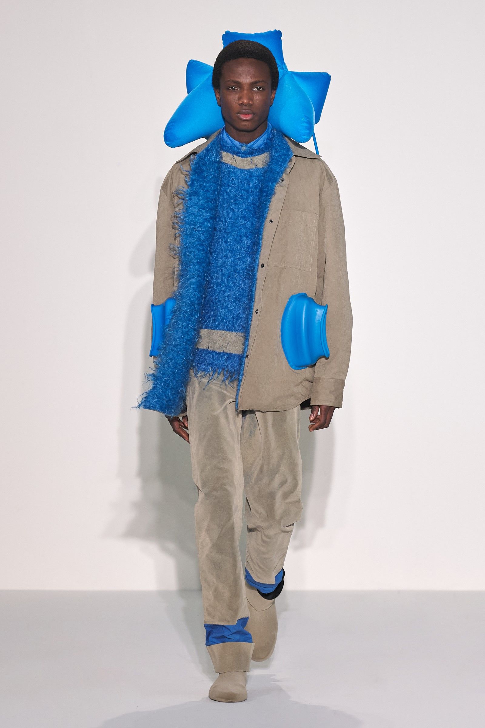 C’è stato effettivamente, nel corso dello show, il senso di un riversamento all’esterno di ciò che era all’interno, come una struttura che si rompe rivelando la sua costruzione e anatomia interna, ma anche una ricostruzione del senso tattile degli abiti con, ad esempio, una giacca marrone che era liscia fuori e aveva un interno villoso di mohair verde – chi la indossa ne sente la morbidezza, ma non chi la guarda; o anche elementi sintetici, di latex o simili al materiale delle mute da sub, che si rovesciano verso l’esterno, rivelano le particolarità dell’interno come il trench che, nei risvolti delle maniche e negli inserti sintetici, sembra lasciare intuire la presenza di un interno in gomma blu che prova a emergere. Alla fine dello show, una serie di look di maglieria includono una specie di hoodie di lana oversize che all'interno è rigonfia di spessissimo mohair le cui frange fuoriescono fuori come fodere di pelliccia e le cui maniche sono anatomicamente inesatte producendo l'impressione di una strana creatura marina.