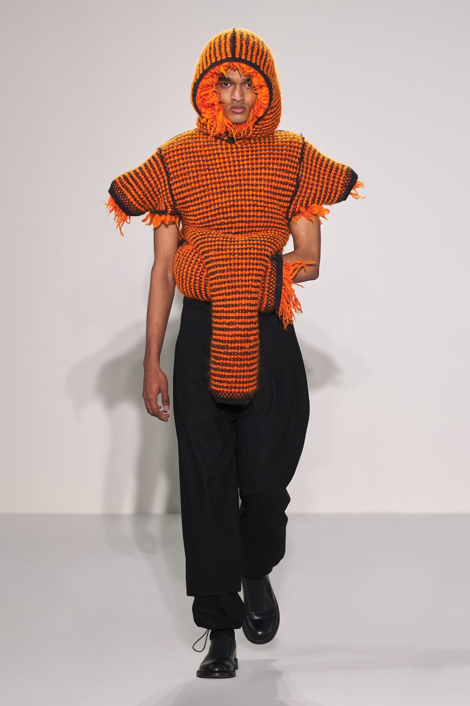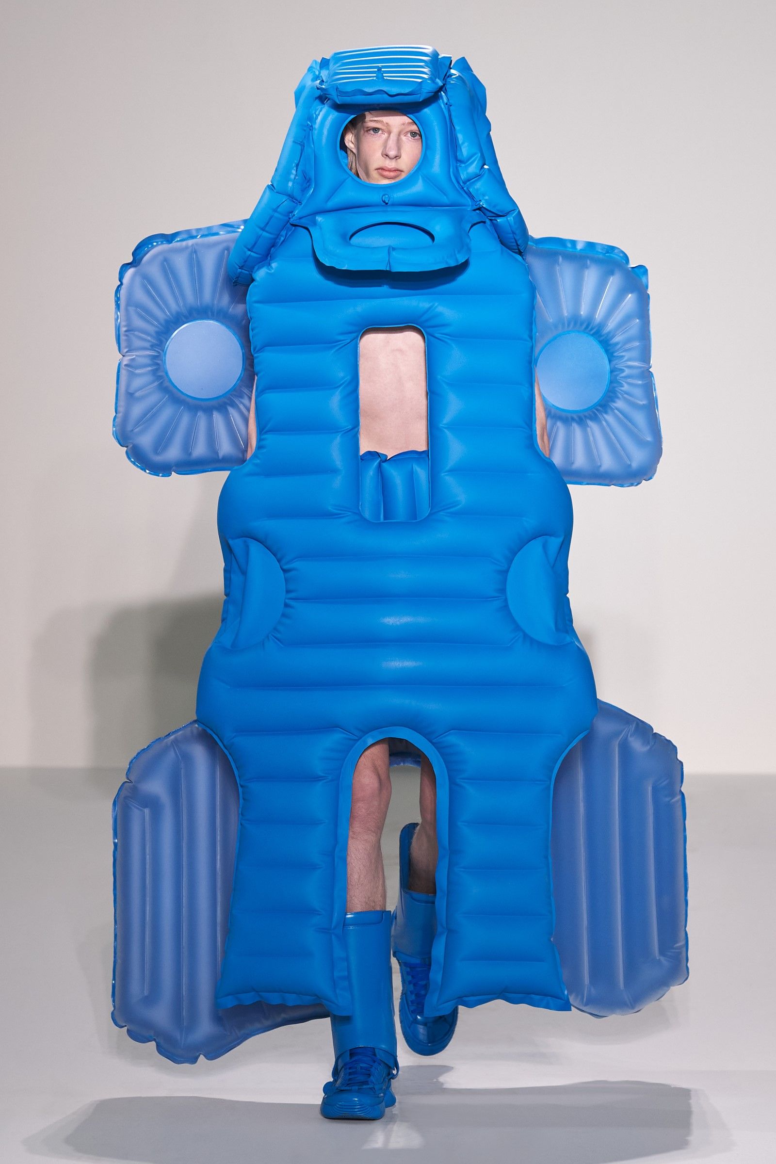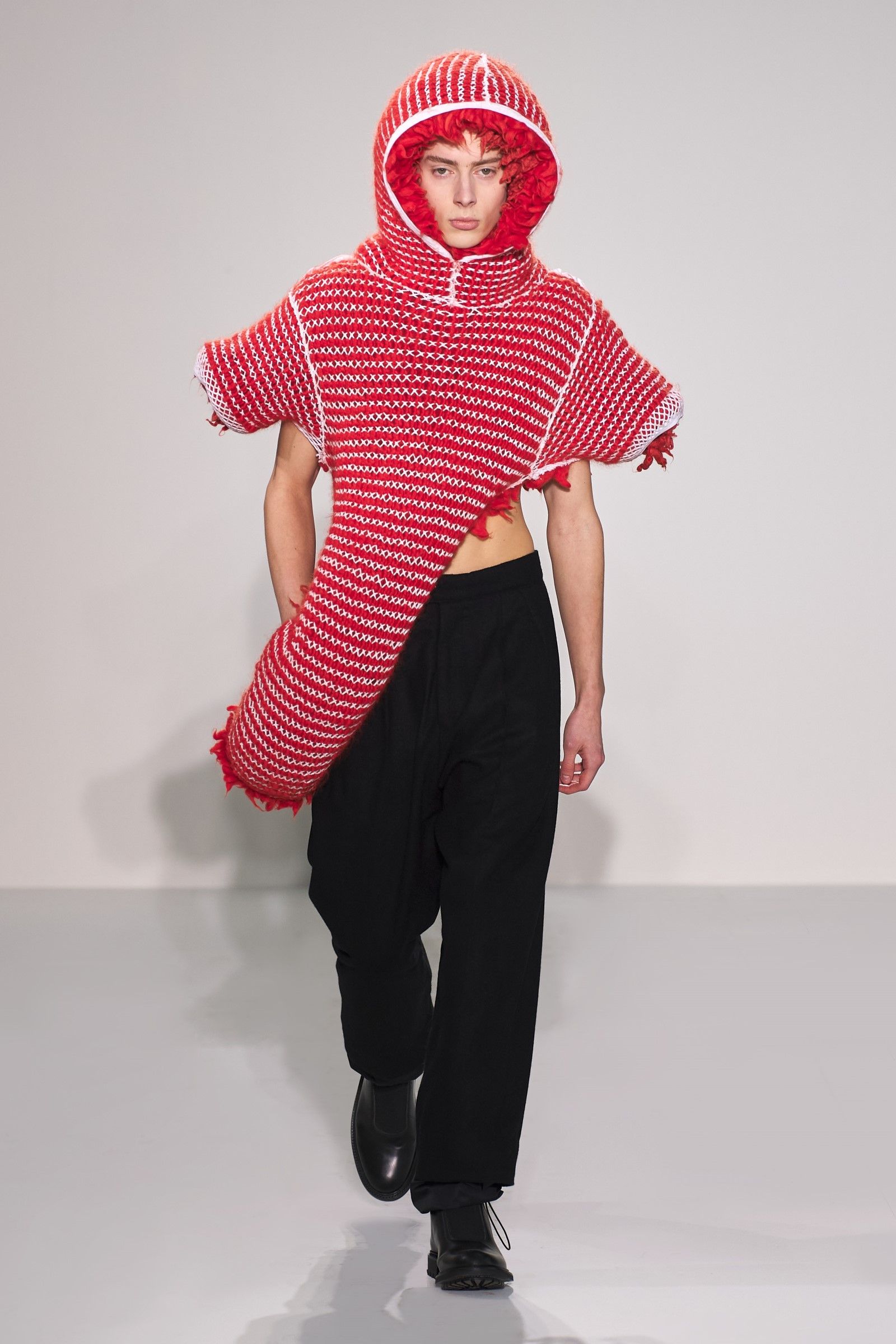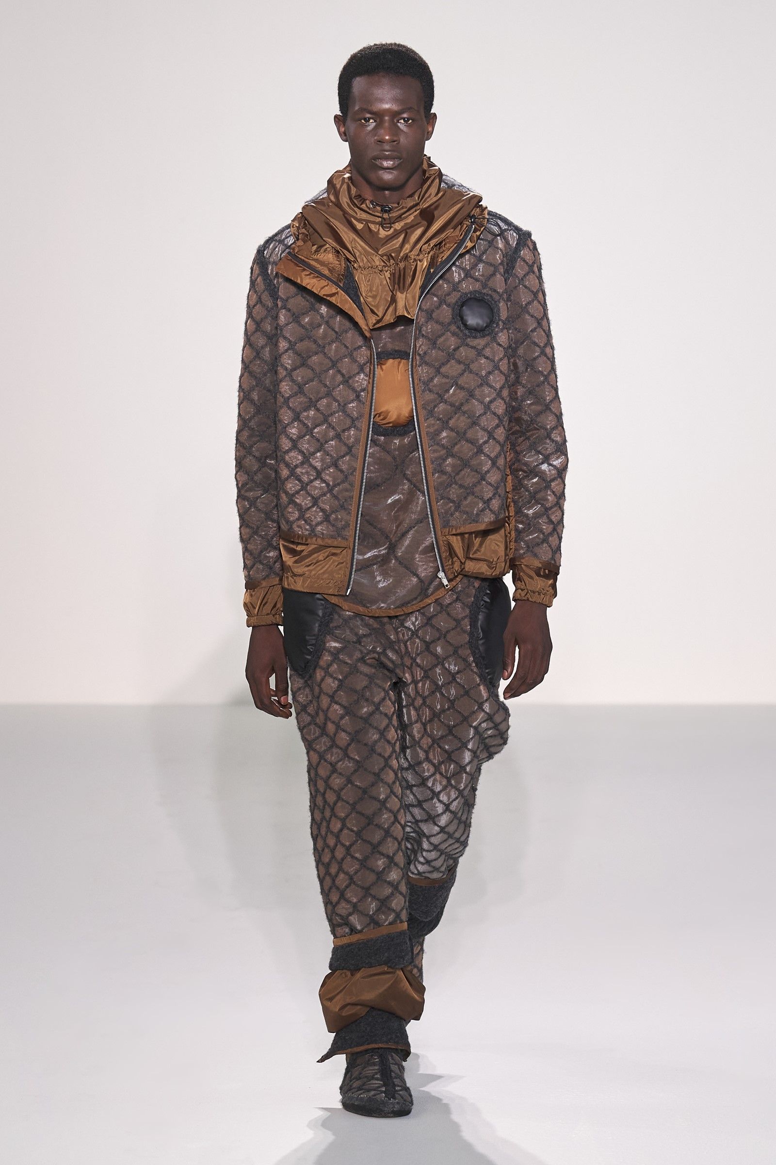 C’è stato effettivamente, nel corso dello show, il senso di un riversamento all’esterno di ciò che era all’interno, come una struttura che si rompe rivelando la sua costruzione e anatomia interna, ma anche una ricostruzione del senso tattile degli abiti con, ad esempio, una giacca marrone che era liscia fuori e aveva un interno villoso di mohair verde – chi la indossa ne sente la morbidezza, ma non chi la guarda; o anche elementi sintetici, di latex o simili al materiale delle mute da sub, che si rovesciano verso l’esterno, rivelano le particolarità dell’interno come il trench che, nei risvolti delle maniche e negli inserti sintetici, sembra lasciare intuire la presenza di un interno in gomma blu che prova a emergere. Alla fine dello show, una serie di look di maglieria includono una specie di hoodie di lana oversize che all'interno è rigonfia di spessissimo mohair le cui frange fuoriescono fuori come fodere di pelliccia e le cui maniche sono anatomicamente inesatte producendo l'impressione di una strana creatura marina.