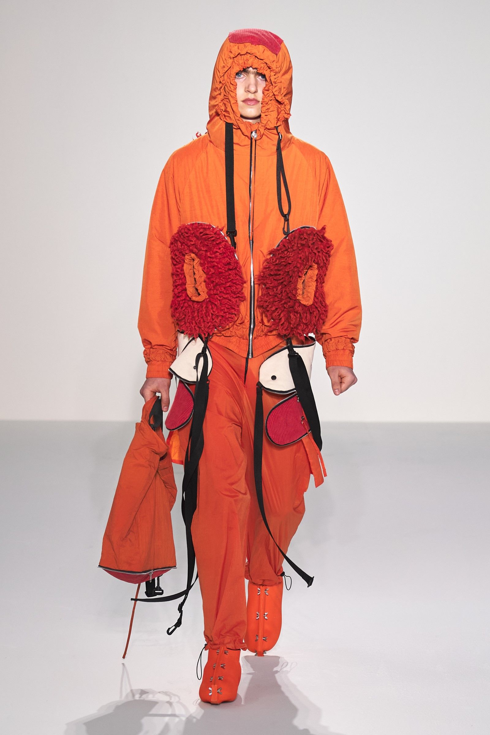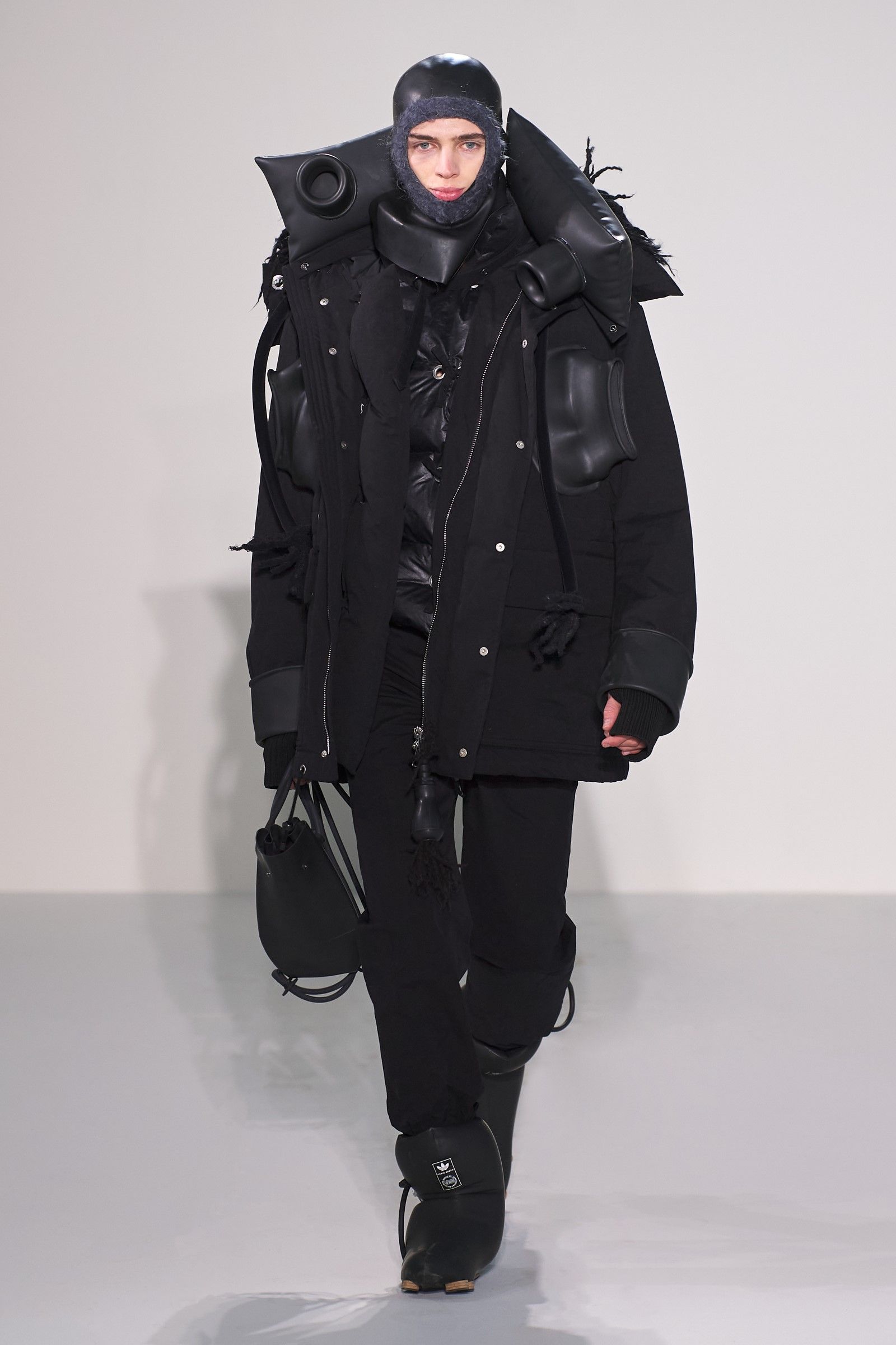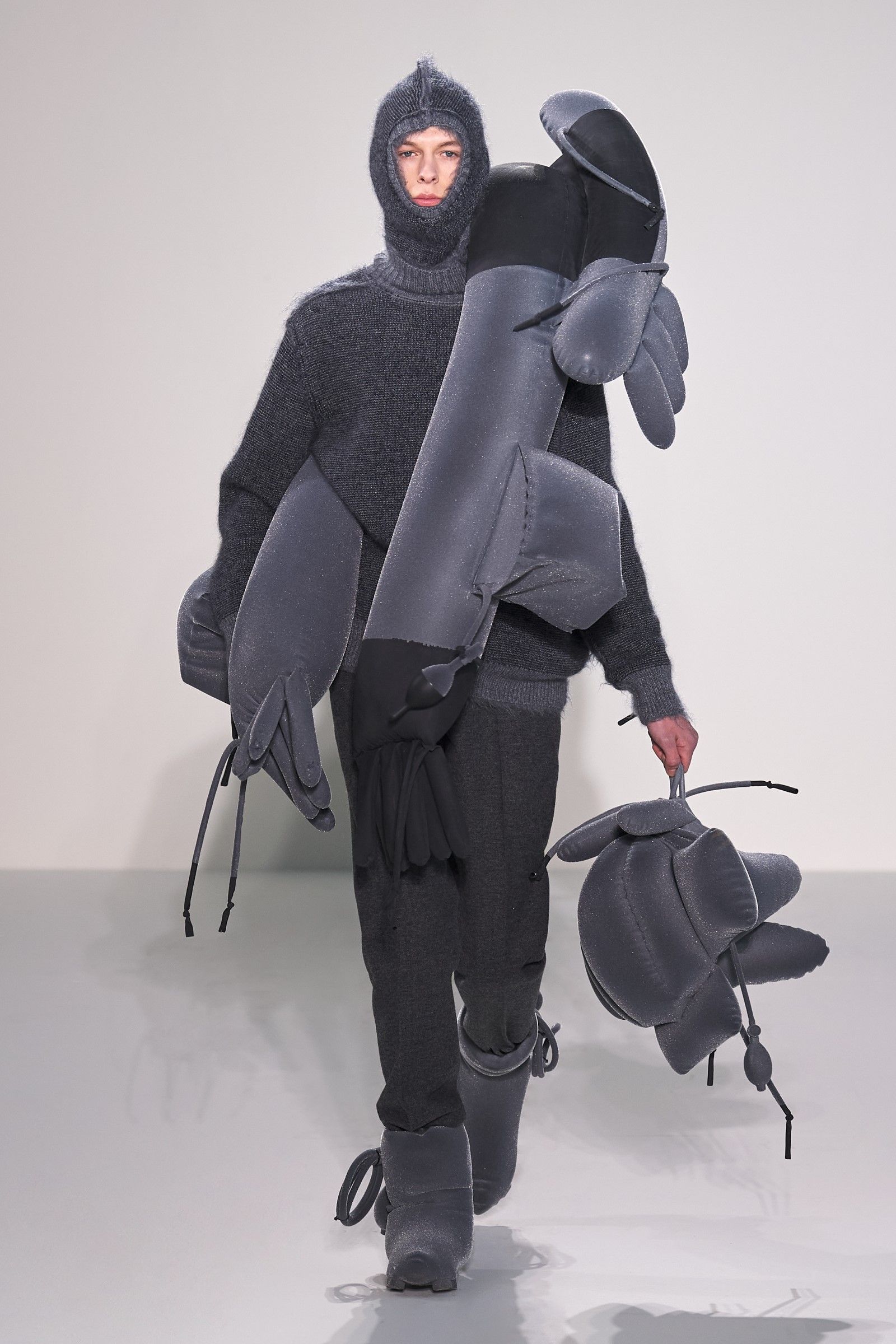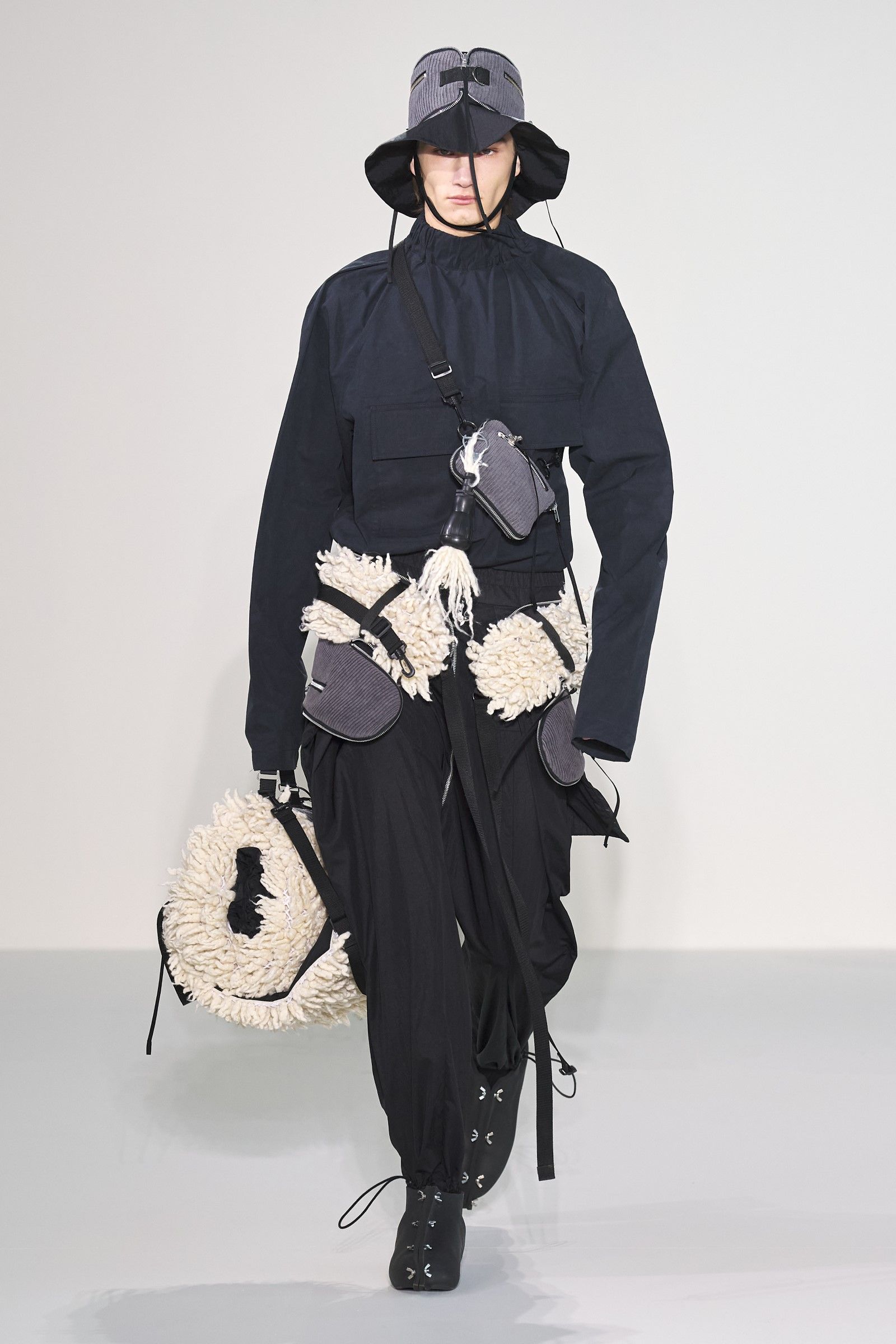 L’architettura invertita degli strati che si incastrano e si sovrappongono in modo apparentemente caotico seguendo una filosofia di design che vede gli accessori diventare simili a giocattoli, le borse così come alcuni dei balaclava e dei look più concettuali, insieme alle patch di mohair/ciniglia da appendere e impacchettare, sono bizzarre in se stesse ma costruite con una logica molto rigorosa in mente, seguono una razionalità che pesca dal mondo degli invertebrati, dall’idea di corpo impacchettato di cinghie del BDSM ma anche dall’approccio funzionale a strati e struttura dei capi di scalatori e sommozzatori.