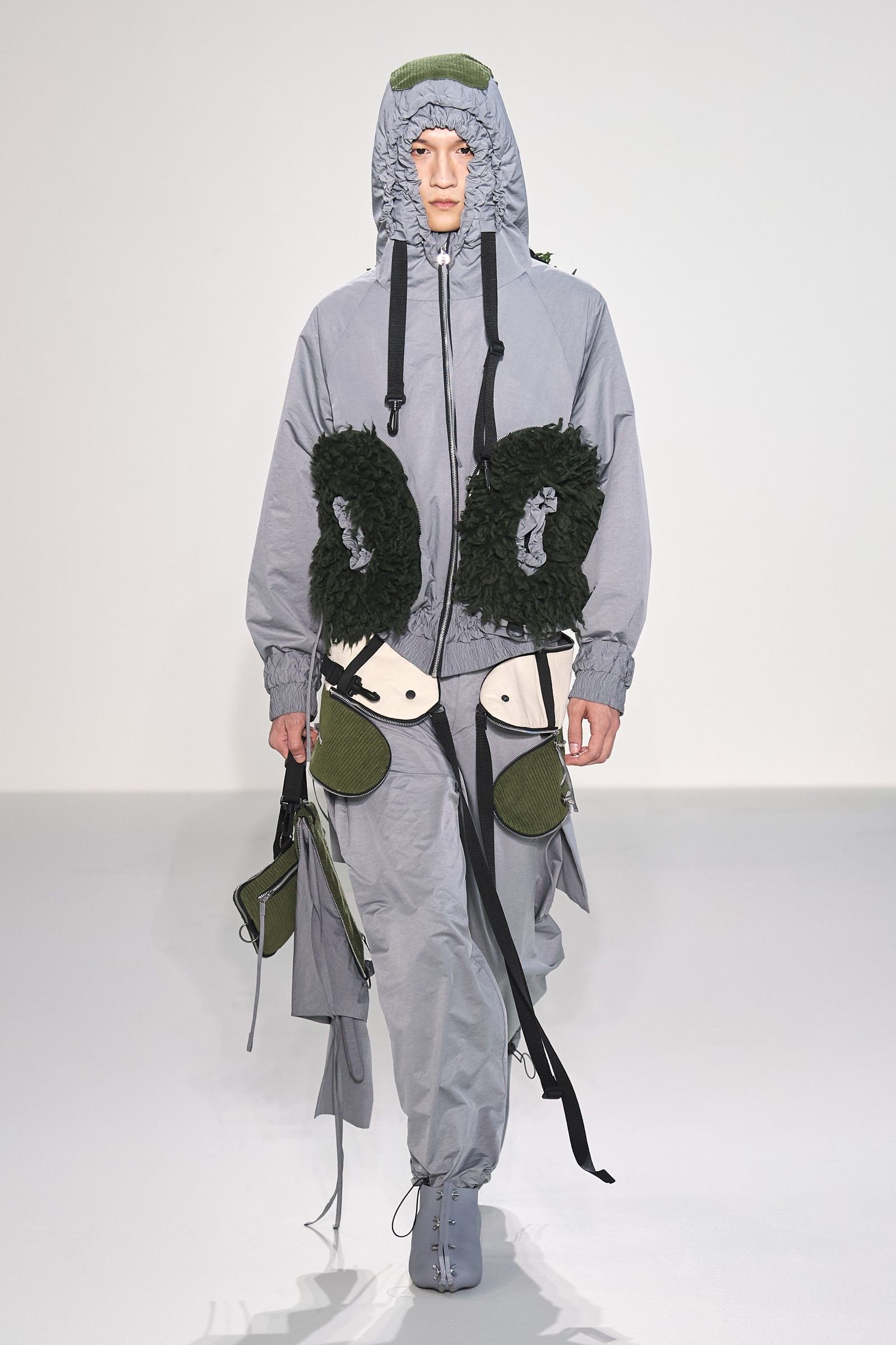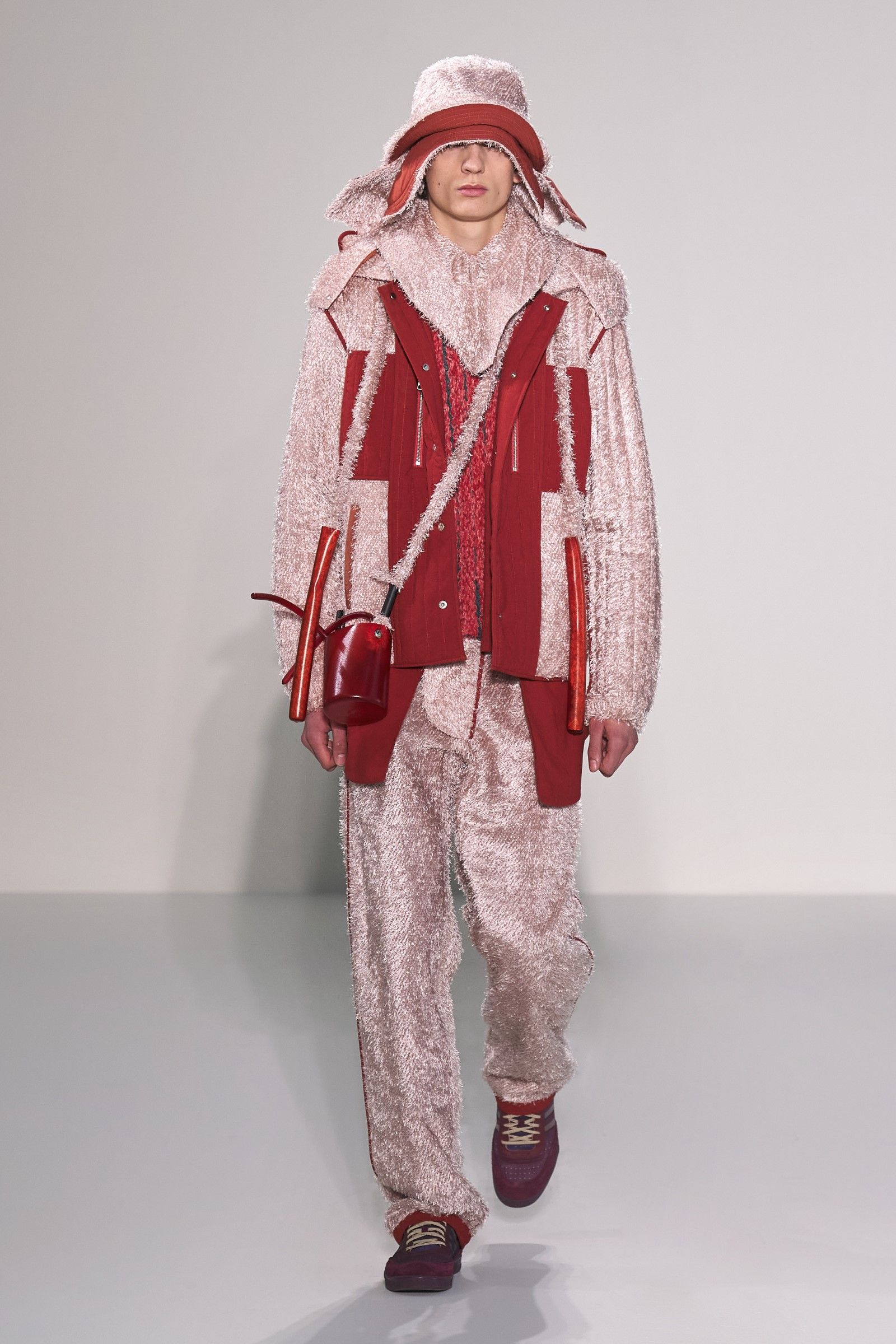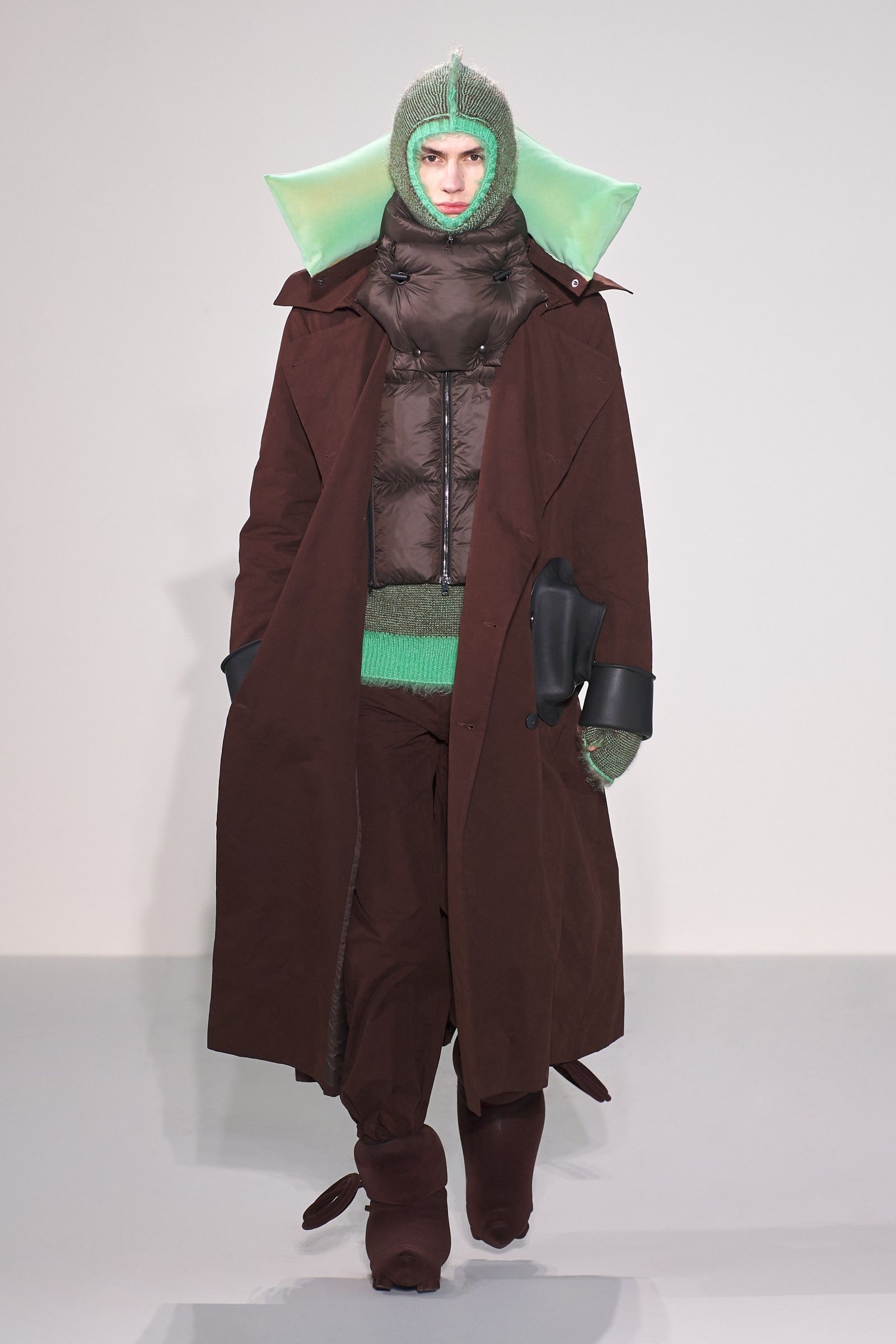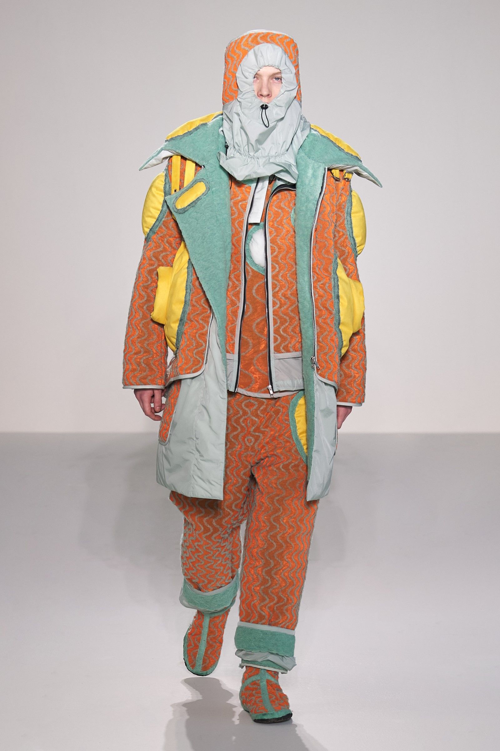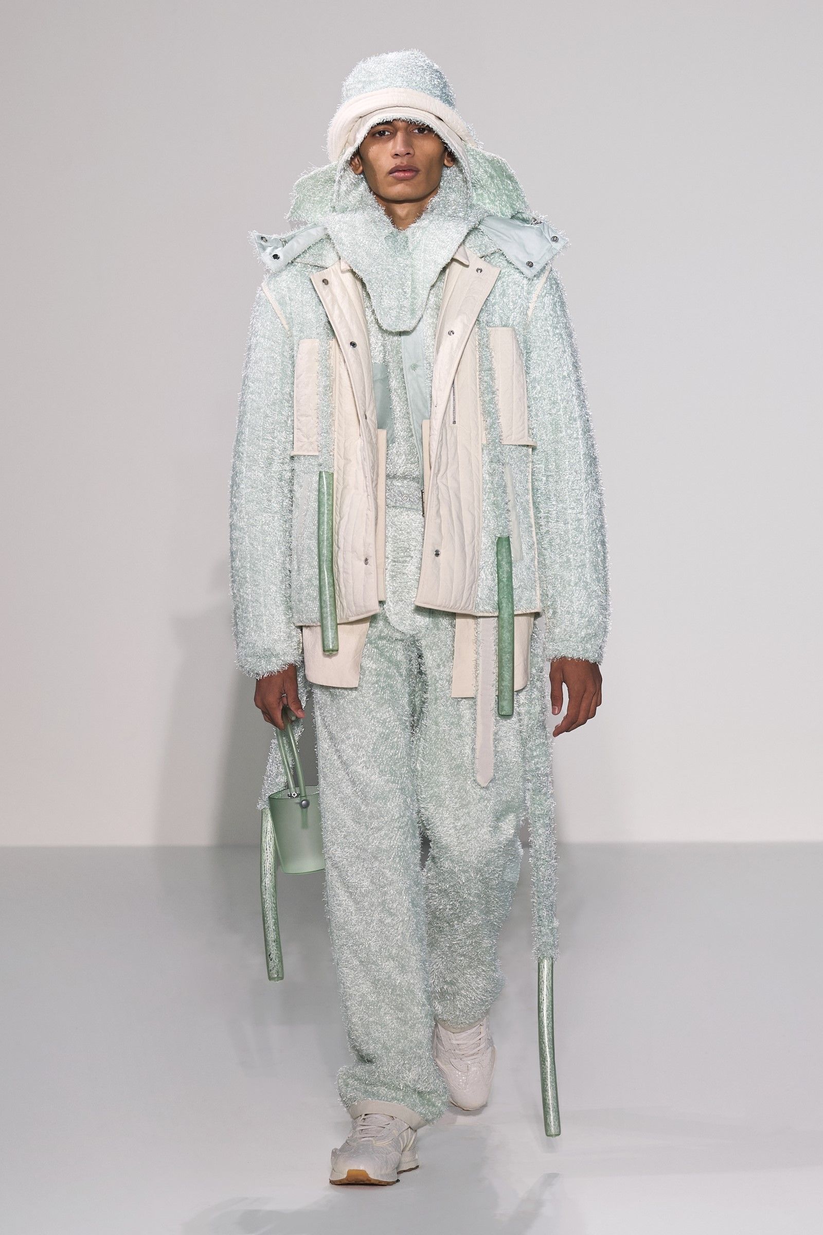 L’intera collezione ha meditato, nei termini della surreale e utilitaristica architettura tessile che è diventata la firma di Green, sull’isolamento e sugli strati isolanti, non rivelando l’interno tramite aperture dell’esterno (pensate a una giacca che rivela una camicia) ma rivelando interno tramite aperture dell’esterno. In alcuni look, la struttura del classico puffer jacket è usata come strato interno al cappotto di lana, trasformando ciò che si associerebbe normalmente a un cappotto a uno strato interno quasi da nascondere. I richiami possibili a forme e fenomeni naturali che vengono in mente sono quelli alle forme di vita subacquee e alle colate laviche dei vulcani – una specie di fotografia di uno stato di metamorfosi in cui ciò che è liquido pare sul punto di solidificarsi, ciò che ha una struttura pare non possederne alcuna.