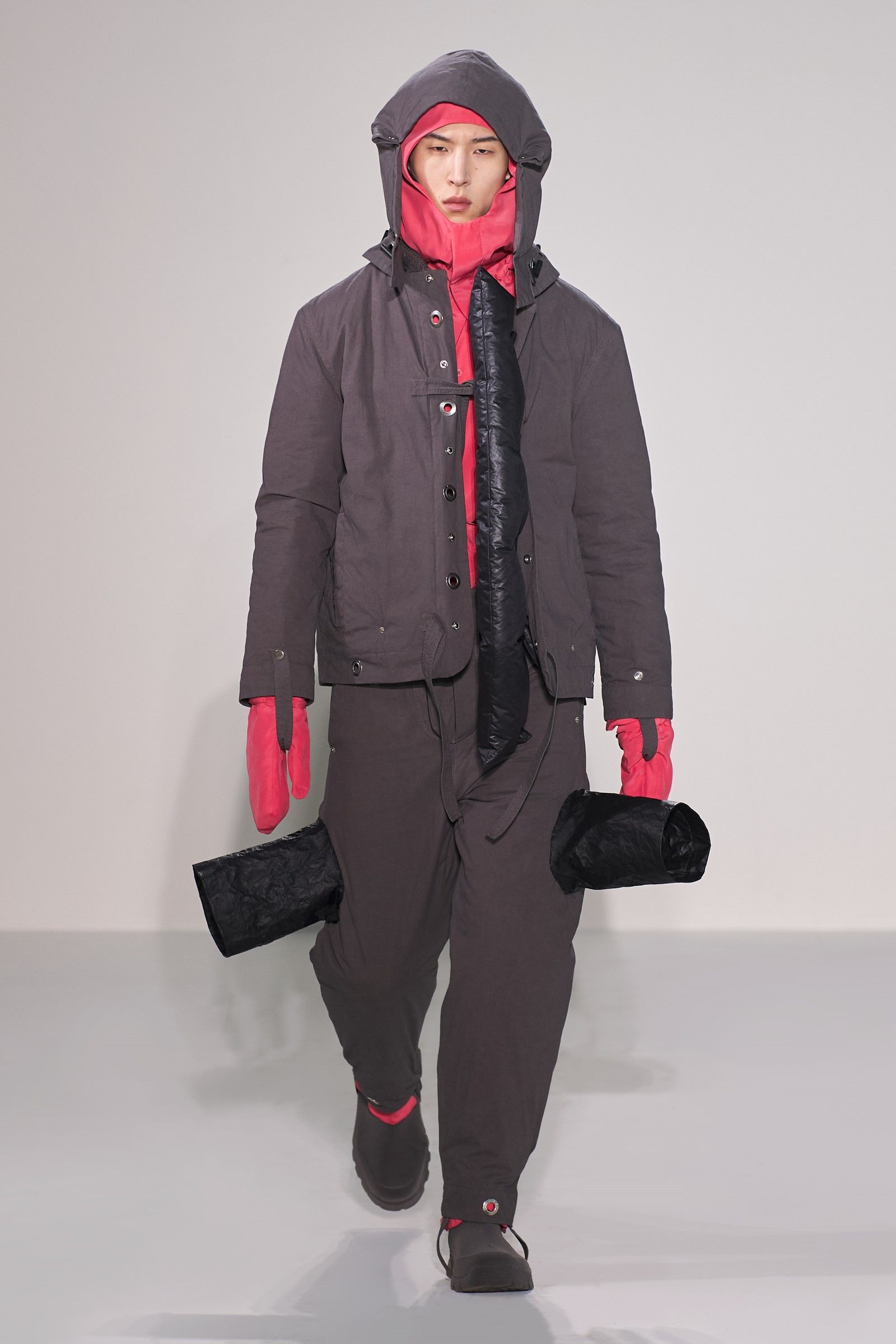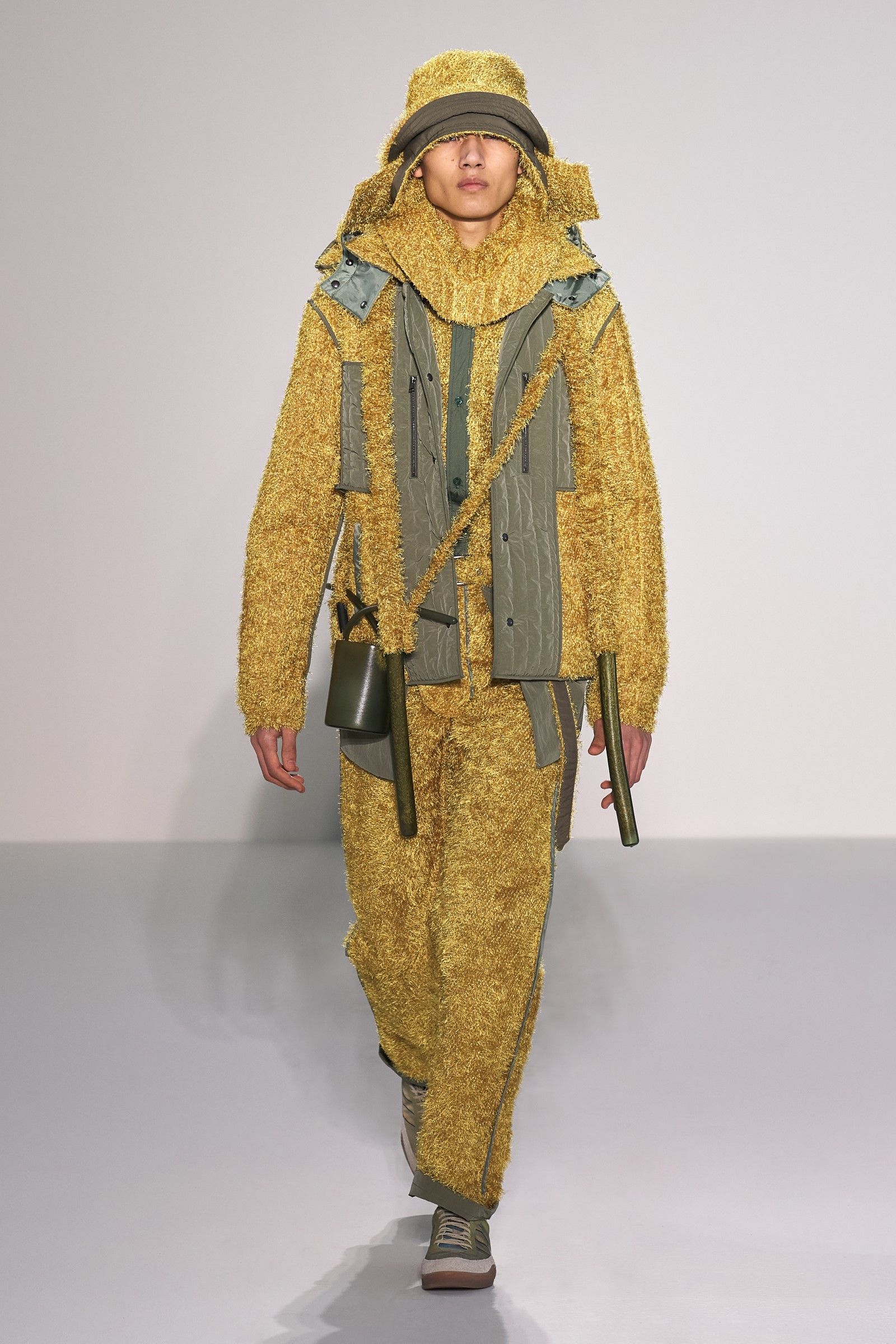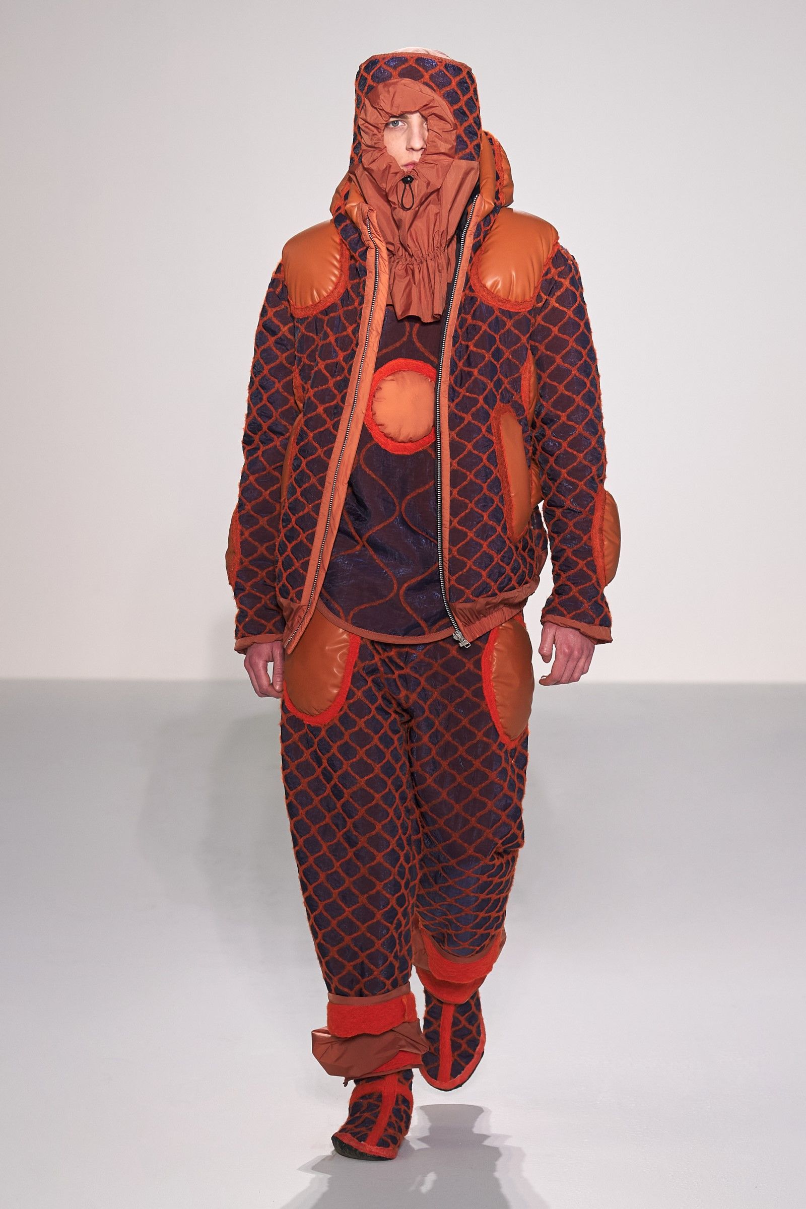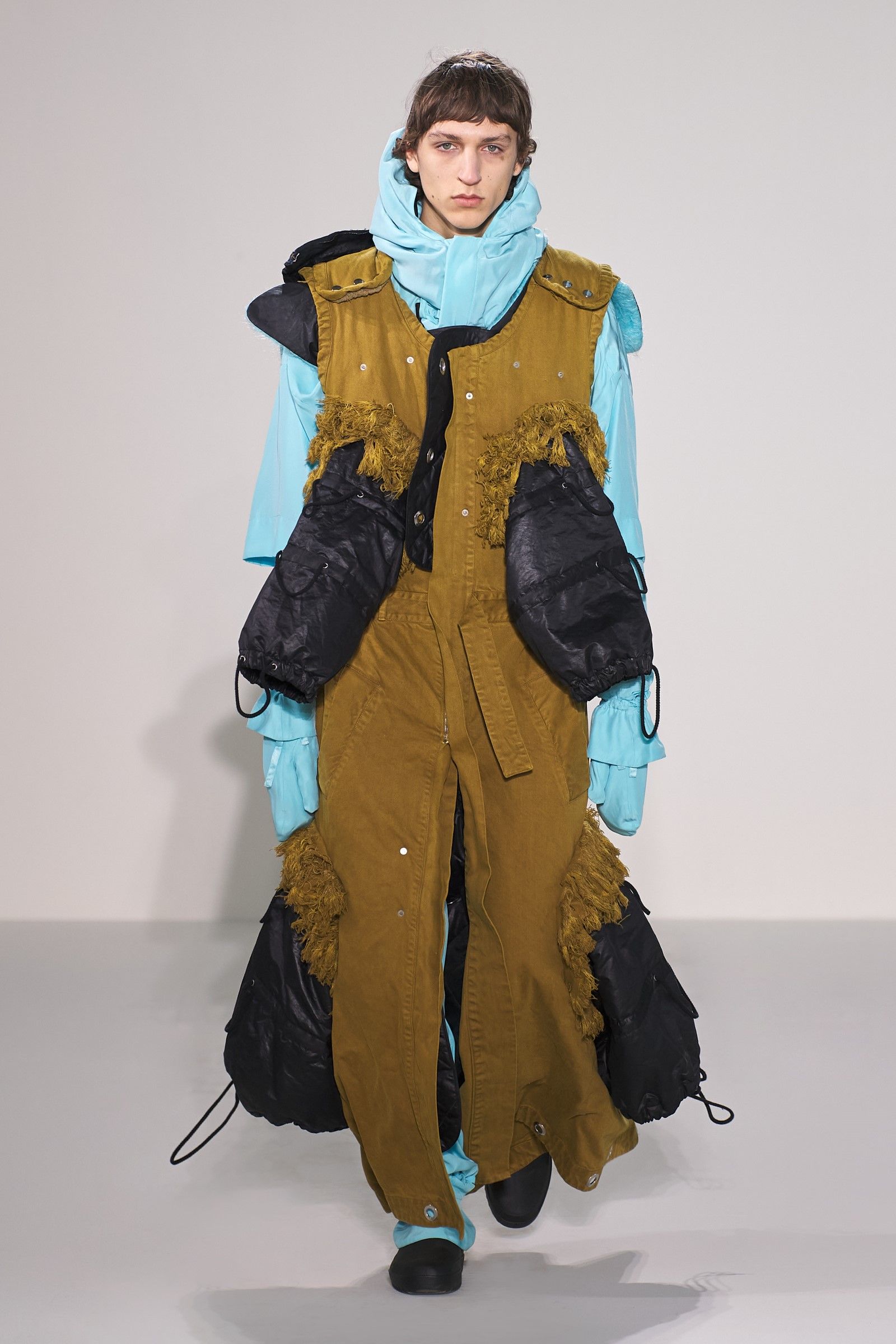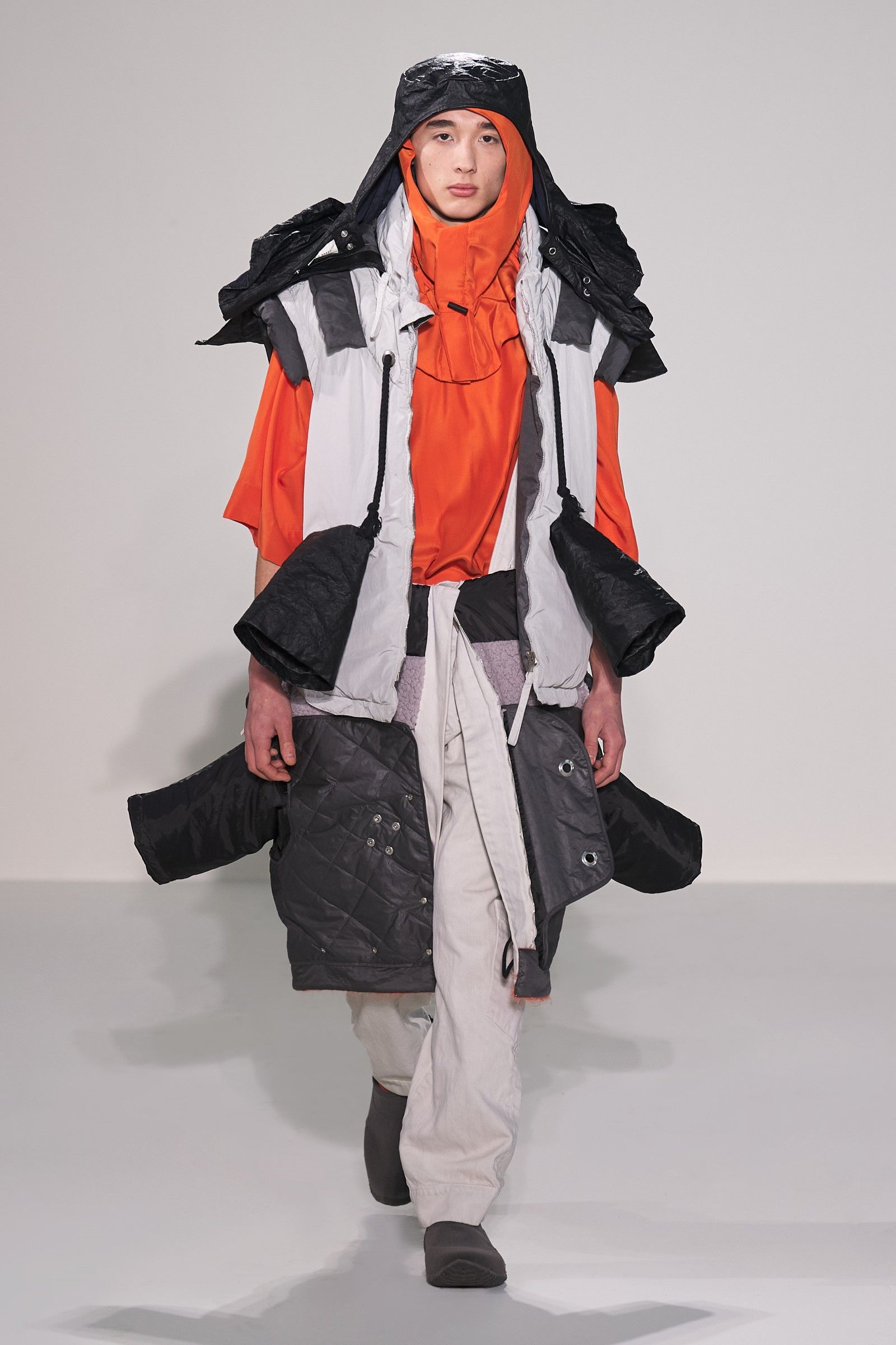 L’intera collezione ha meditato, nei termini della surreale e utilitaristica architettura tessile che è diventata la firma di Green, sull’isolamento e sugli strati isolanti, non rivelando l’interno tramite aperture dell’esterno (pensate a una giacca che rivela una camicia) ma rivelando interno tramite aperture dell’esterno. In alcuni look, la struttura del classico puffer jacket è usata come strato interno al cappotto di lana, trasformando ciò che si associerebbe normalmente a un cappotto a uno strato interno quasi da nascondere. I richiami possibili a forme e fenomeni naturali che vengono in mente sono quelli alle forme di vita subacquee e alle colate laviche dei vulcani – una specie di fotografia di uno stato di metamorfosi in cui ciò che è liquido pare sul punto di solidificarsi, ciò che ha una struttura pare non possederne alcuna.