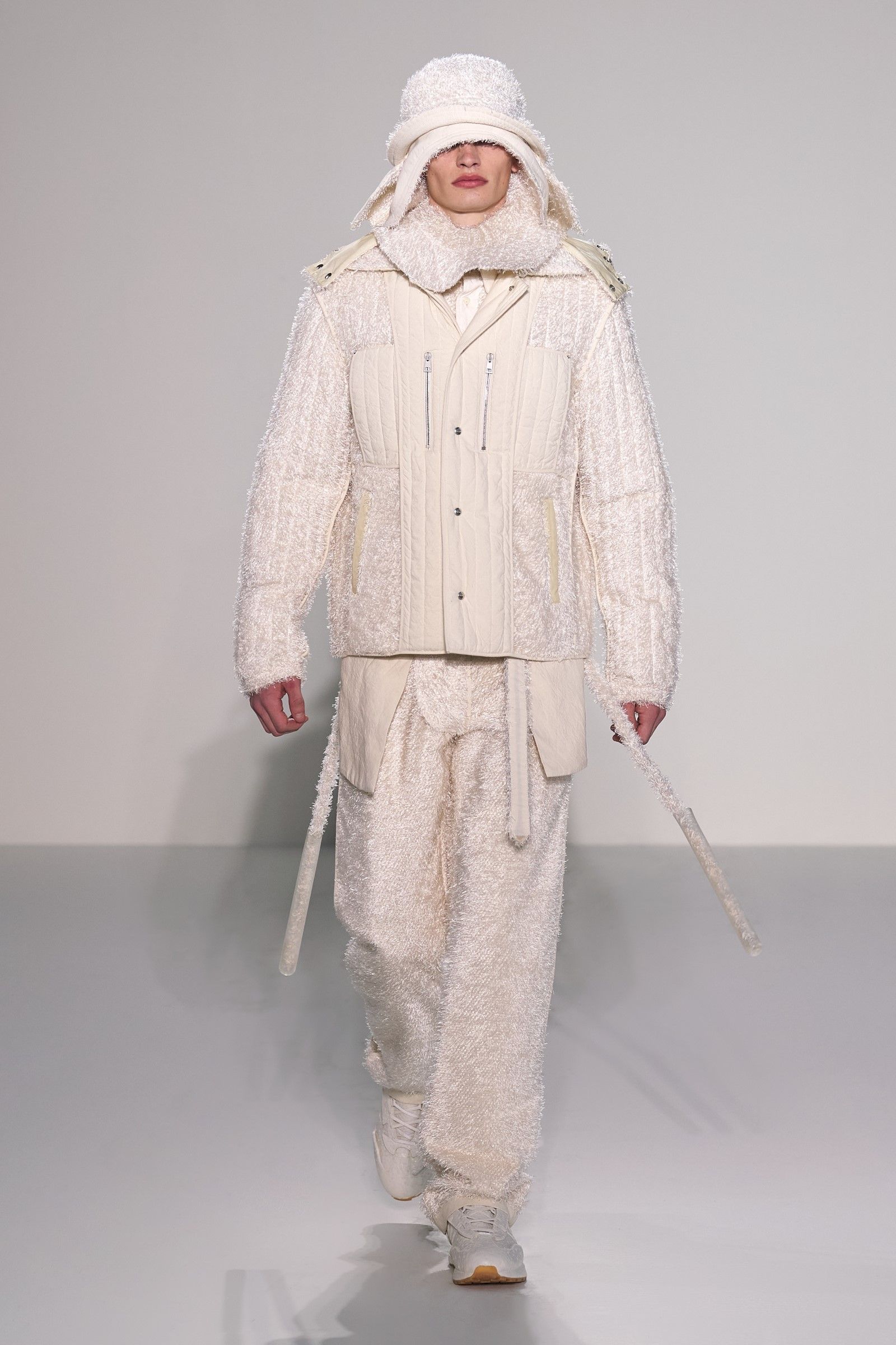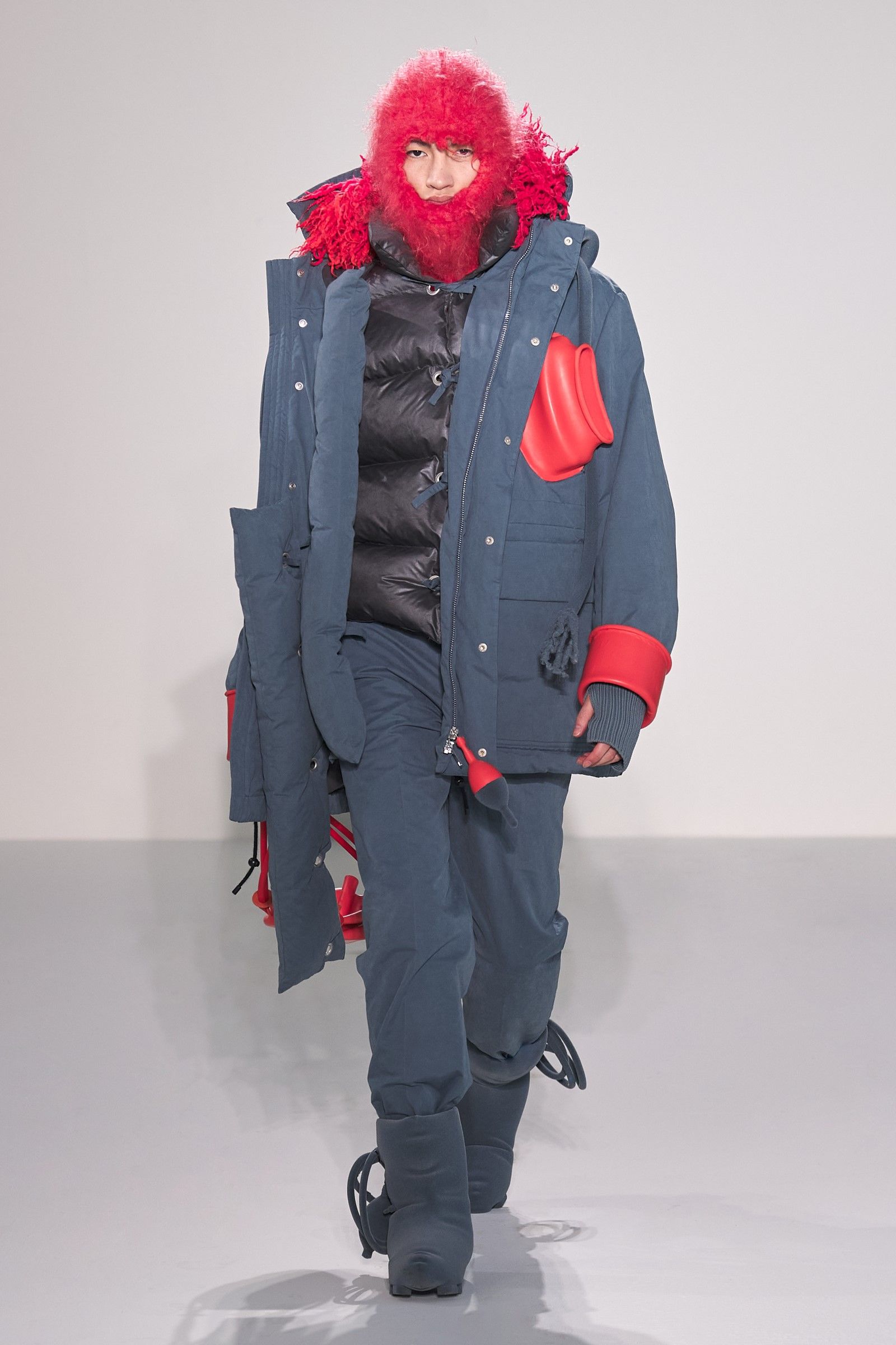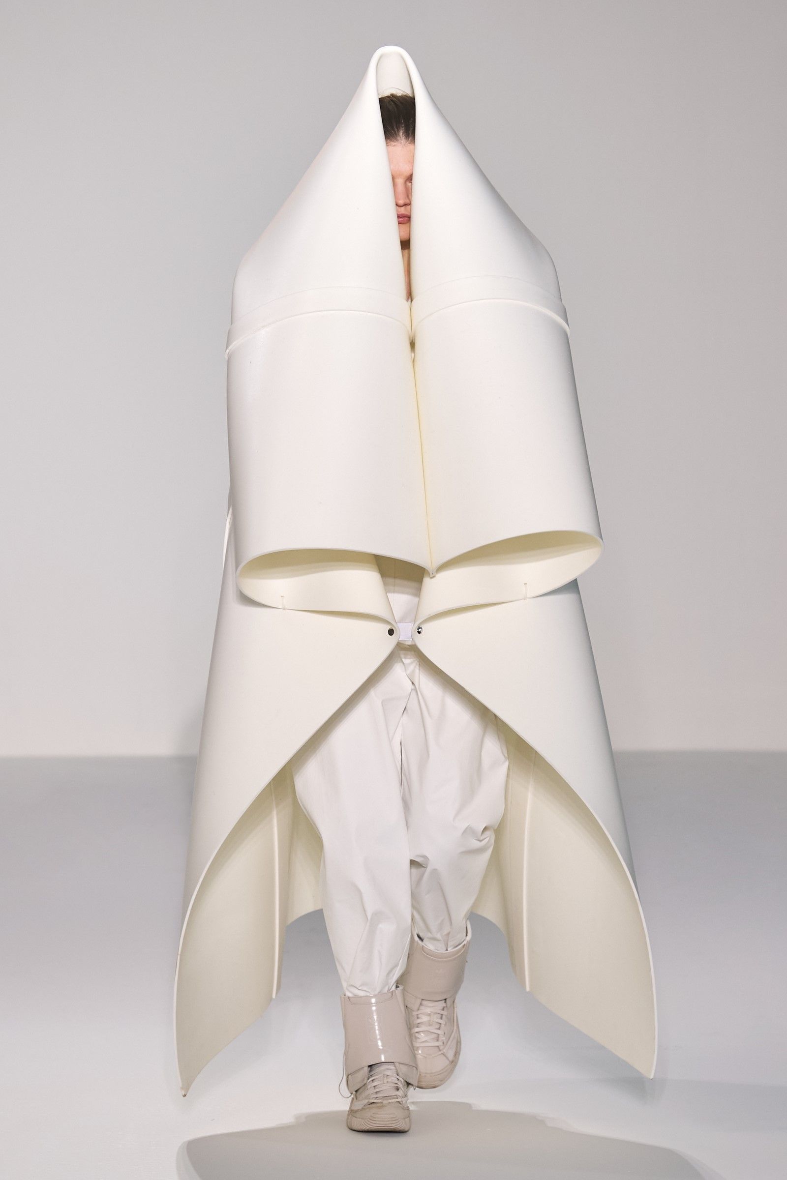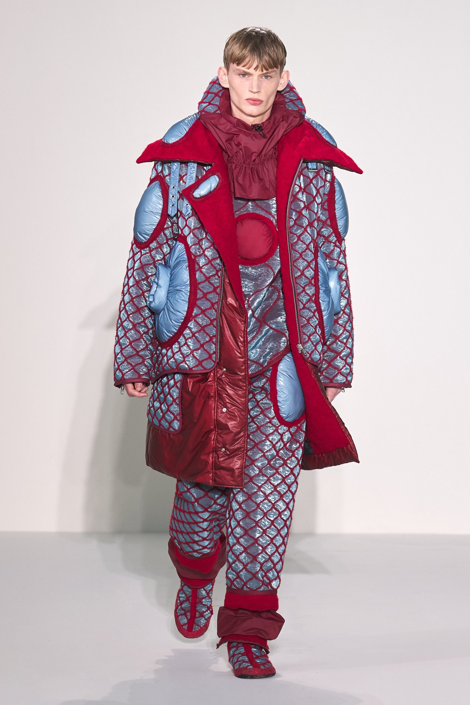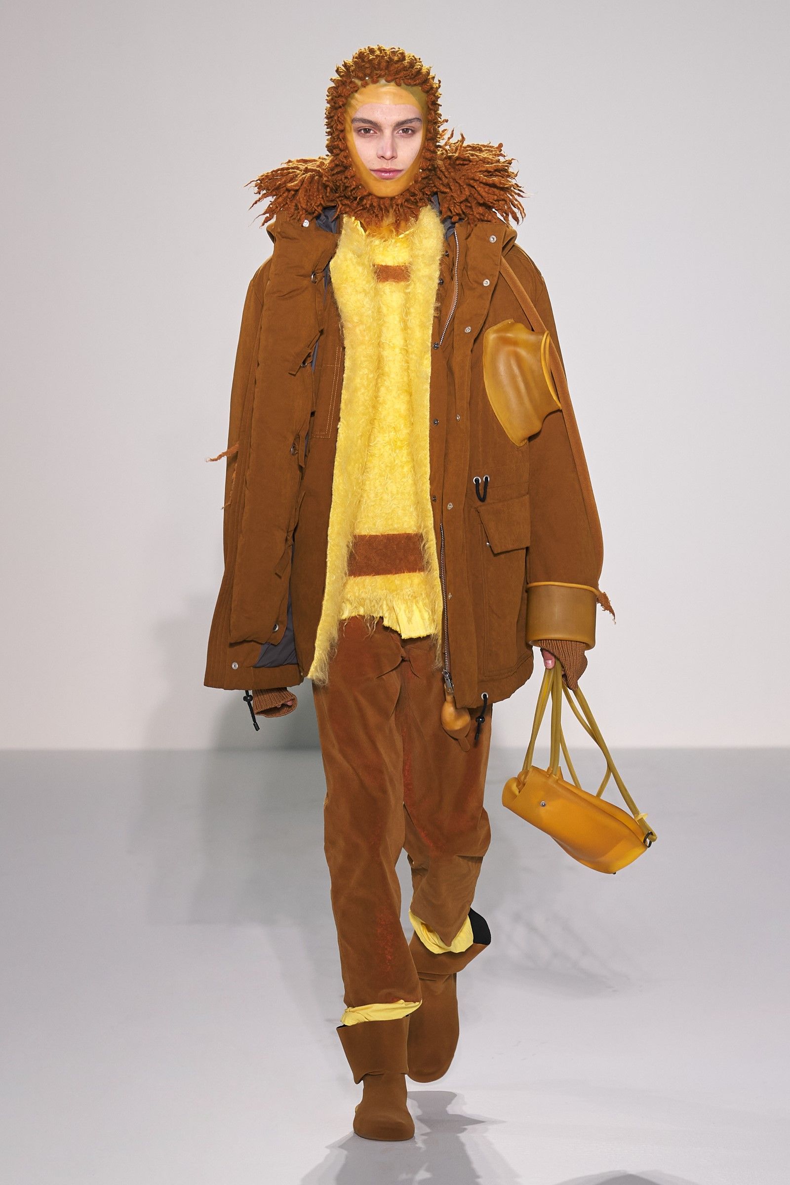L’intera collezione ha meditato, nei termini della surreale e utilitaristica architettura tessile che è diventata la firma di Green, sull’isolamento e sugli strati isolanti, non rivelando l’interno tramite aperture dell’esterno (pensate a una giacca che rivela una camicia) ma rivelando interno tramite aperture dell’esterno. In alcuni look, la struttura del classico puffer jacket è usata come strato interno al cappotto di lana, trasformando ciò che si associerebbe normalmente a un cappotto a uno strato interno quasi da nascondere. I richiami possibili a forme e fenomeni naturali che vengono in mente sono quelli alle forme di vita subacquee e alle colate laviche dei vulcani – una specie di fotografia di uno stato di metamorfosi in cui ciò che è liquido pare sul punto di solidificarsi, ciò che ha una struttura pare non possederne alcuna.