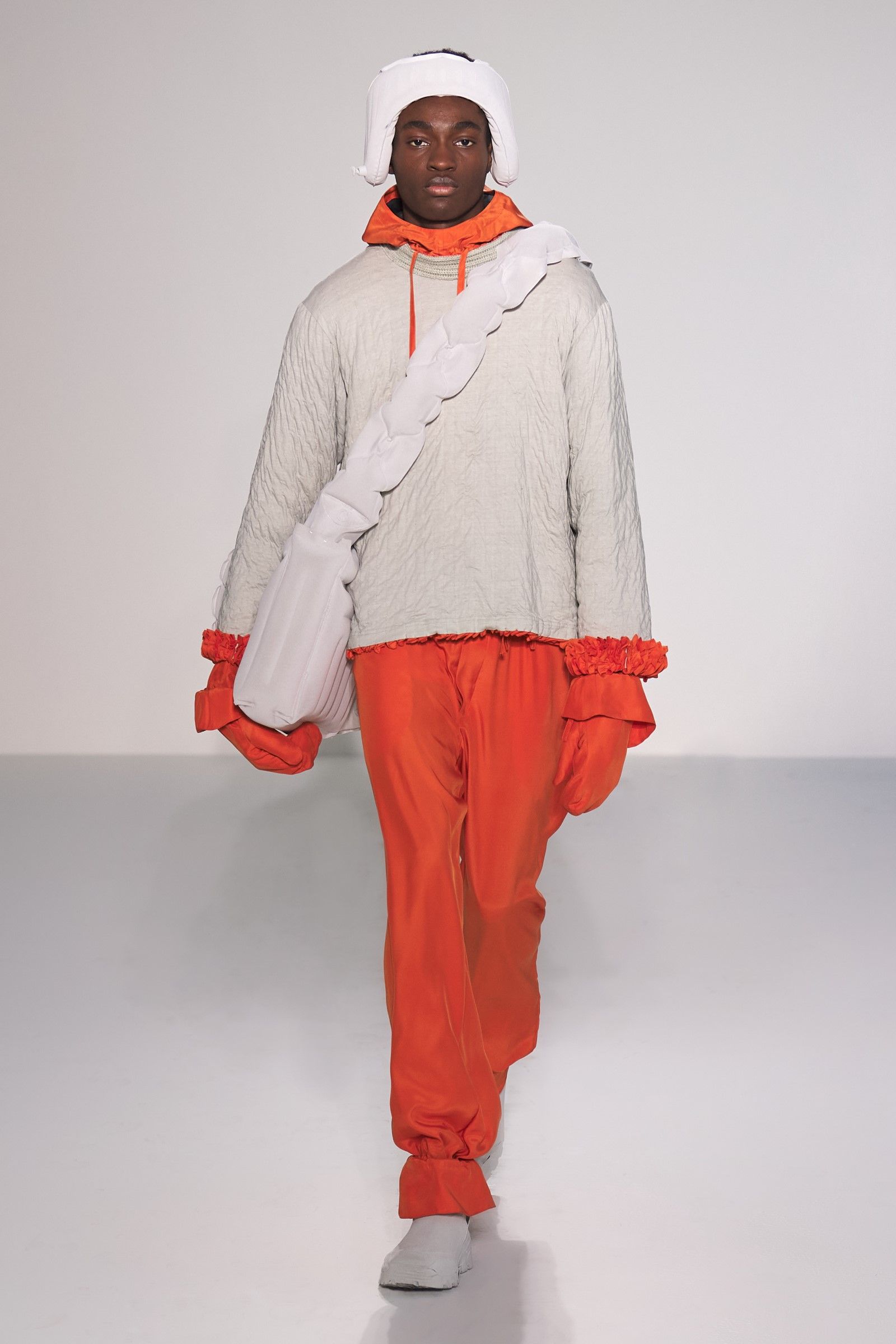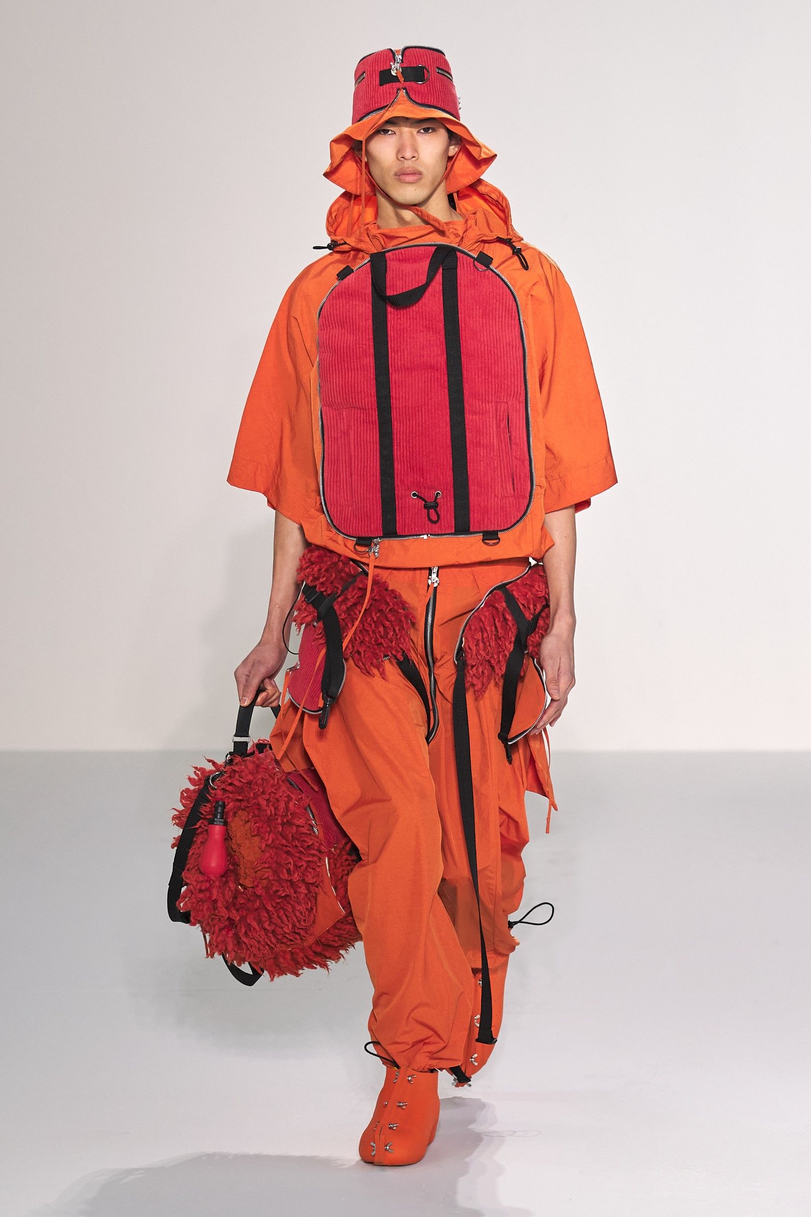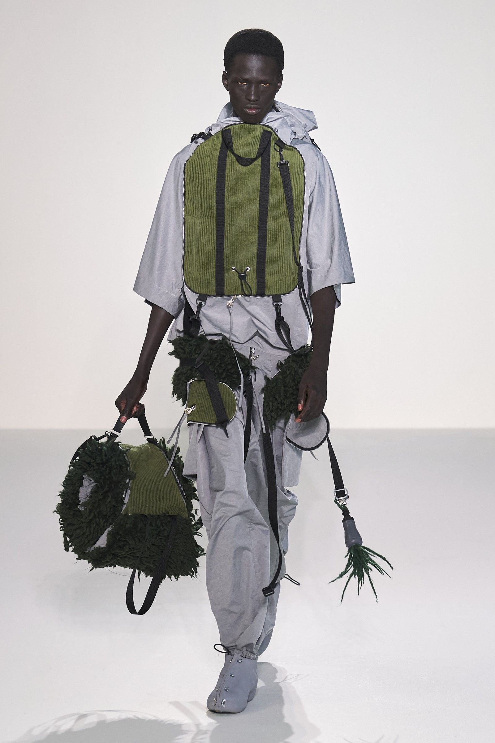 Lo show FW22 di Craig Green tenutosi a Londra ieri è stato, sotto i letterali e metaforici layer del design concettuale, una «lenta processione di arcobaleni che illumina la strada verso nuovi orizzonti». Erano due anni che il designer mancava dalle passerelle fisiche – due anni dopo i quali i look firmato da Green hanno unito in una maniera quasi mai vista prima funzionalità e astrazione, trasformando questa dinamica degli opposti in un simbolo dello sforzo di uscire più forti dall’isolamento. È il dentro che si riversa fuori, l’intangibile che si condensa in «forme solide e durevoli» e che, infine, porta a «forgiare involucri più forti su basi più sincere».