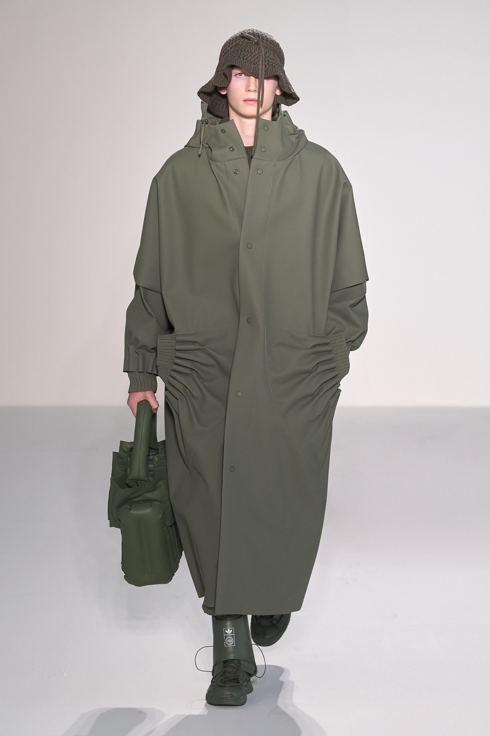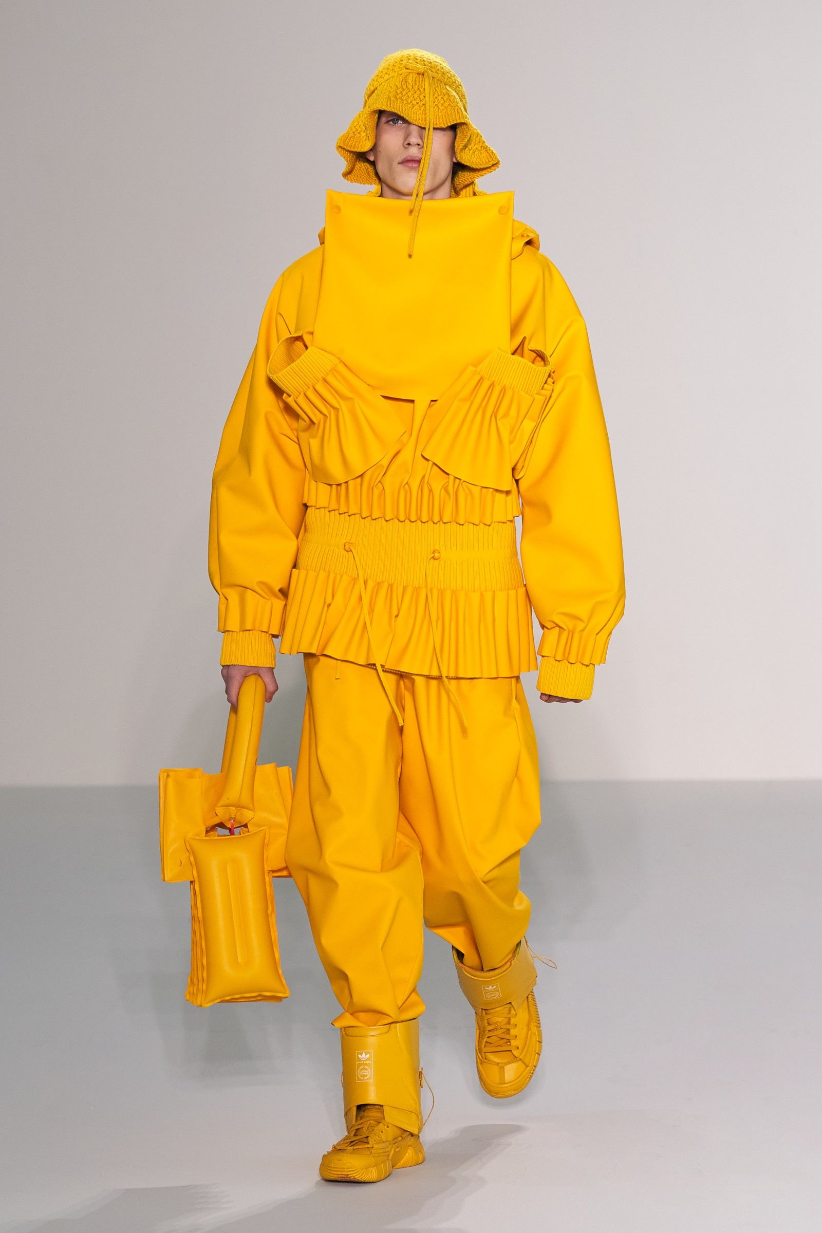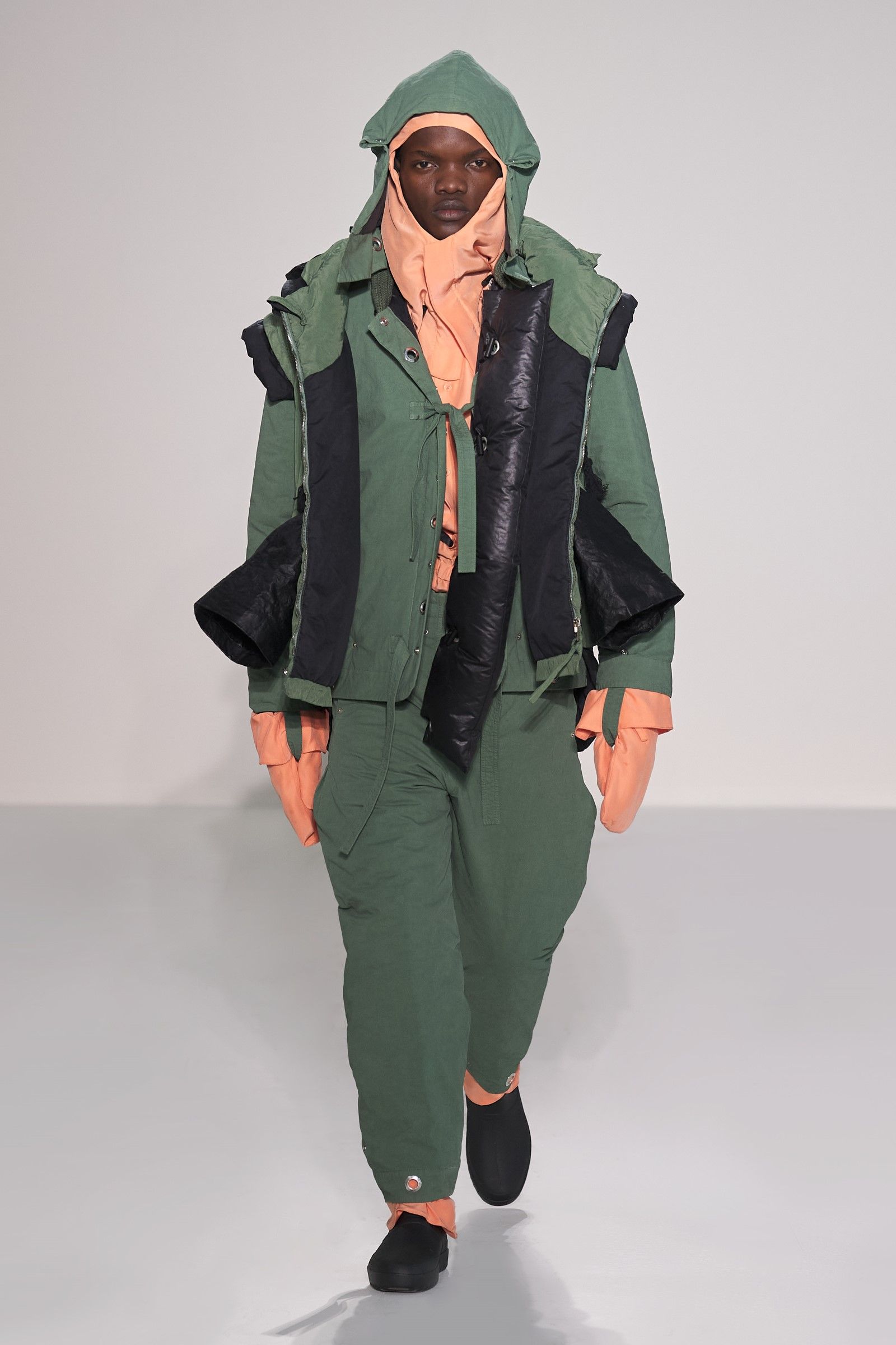 Tutto talento visivo e cromatico che però ha il pregio di condensarsi in capi funzionali, comprensibili ma sorprendenti che mette sullo stesso piano (e in modo del tutto plausibile) design presi in prestito dal mondo dell'hiking, dall'ambito medico e da quello dello snorkeling – come ad esempio la collaborazione con adidas che ha visto le Stan Smith collaborative di Green chiuse dentro guaine monocrome abbottonate longitudinalmente con chiusure dall’aspetto industriale, una collaborazione “nascosta” in cui chi indossa sa cosa sta indossando senza che la scarpa sia visibile all’esterno, mentre altre sneaker si caricano di gambali rigidi che le fanno assomigliare a Wellington Boot monumentali oppure sono ricoperte da elementi gonfiabili che ricordano le pompe di gonfiaggio degli sfigmomanometri.