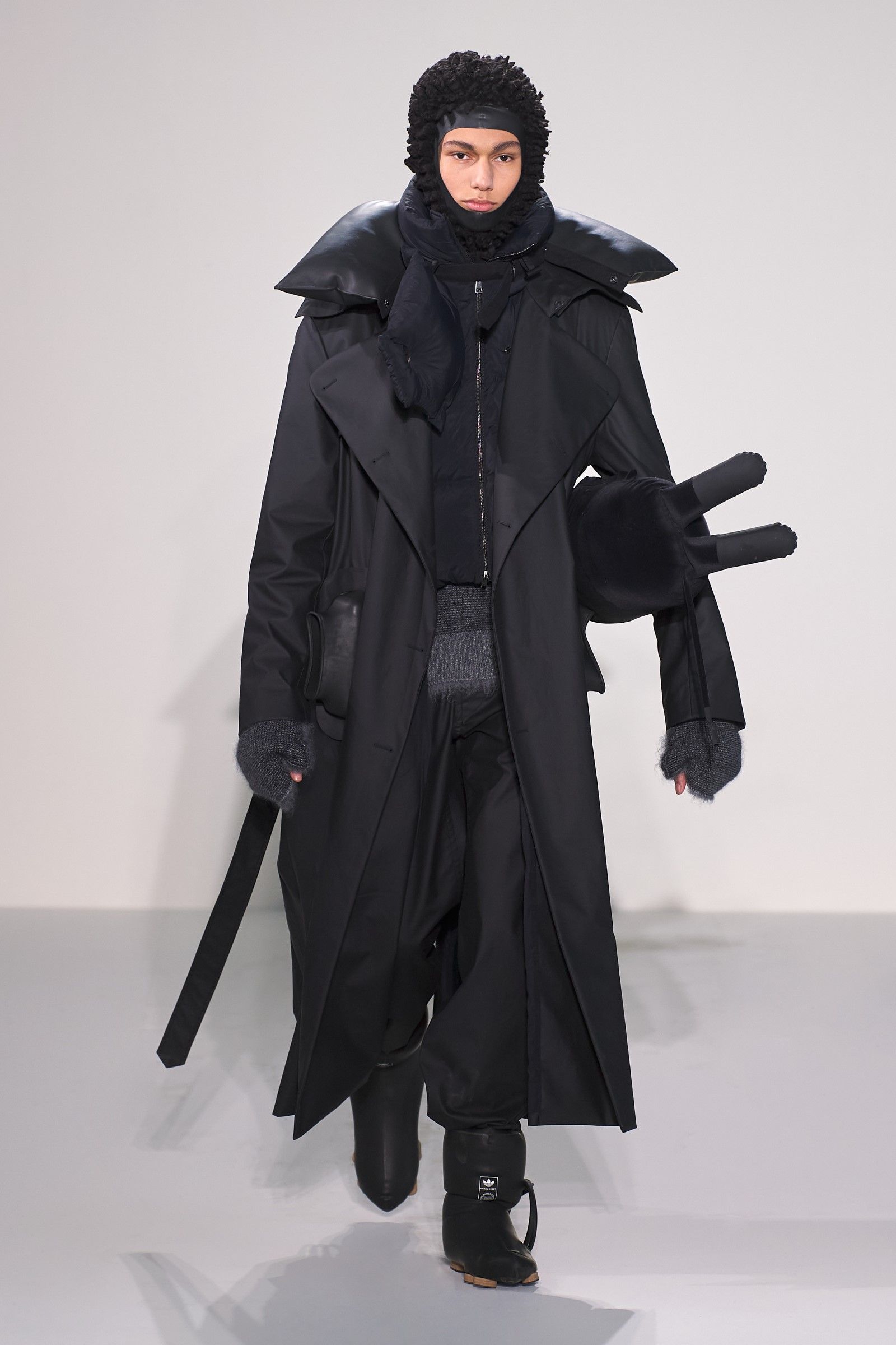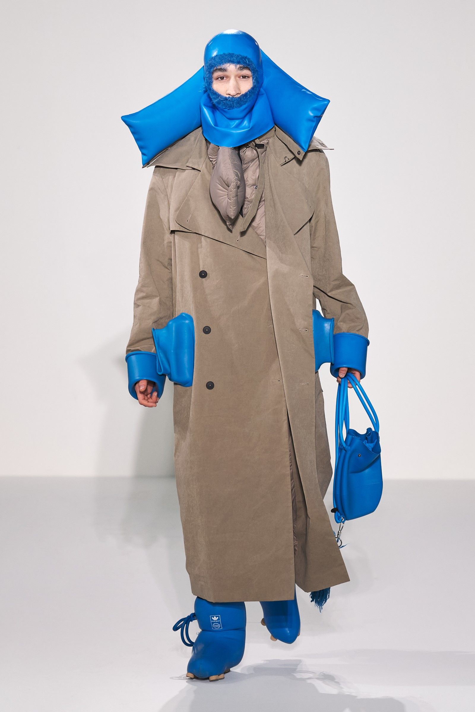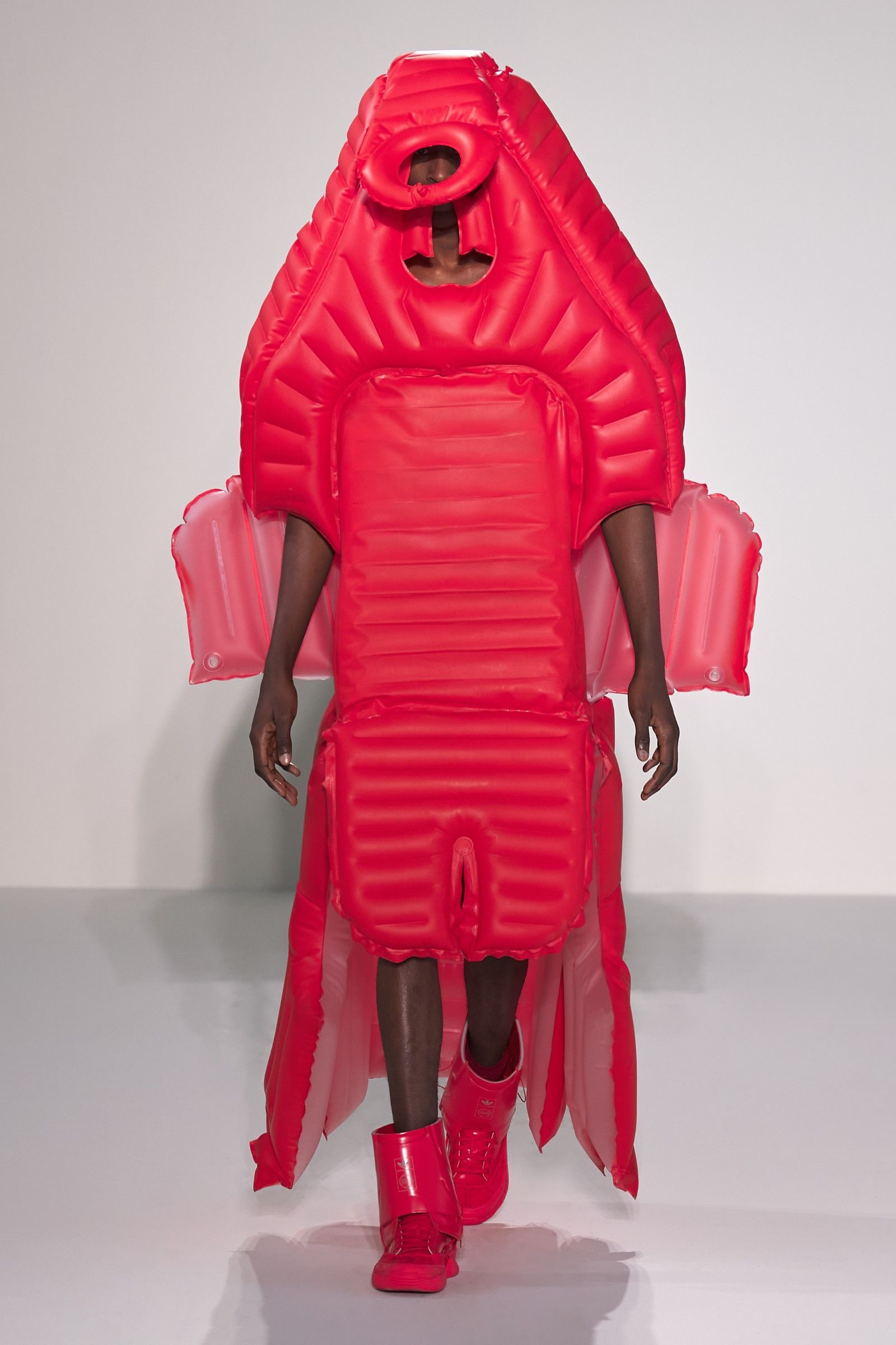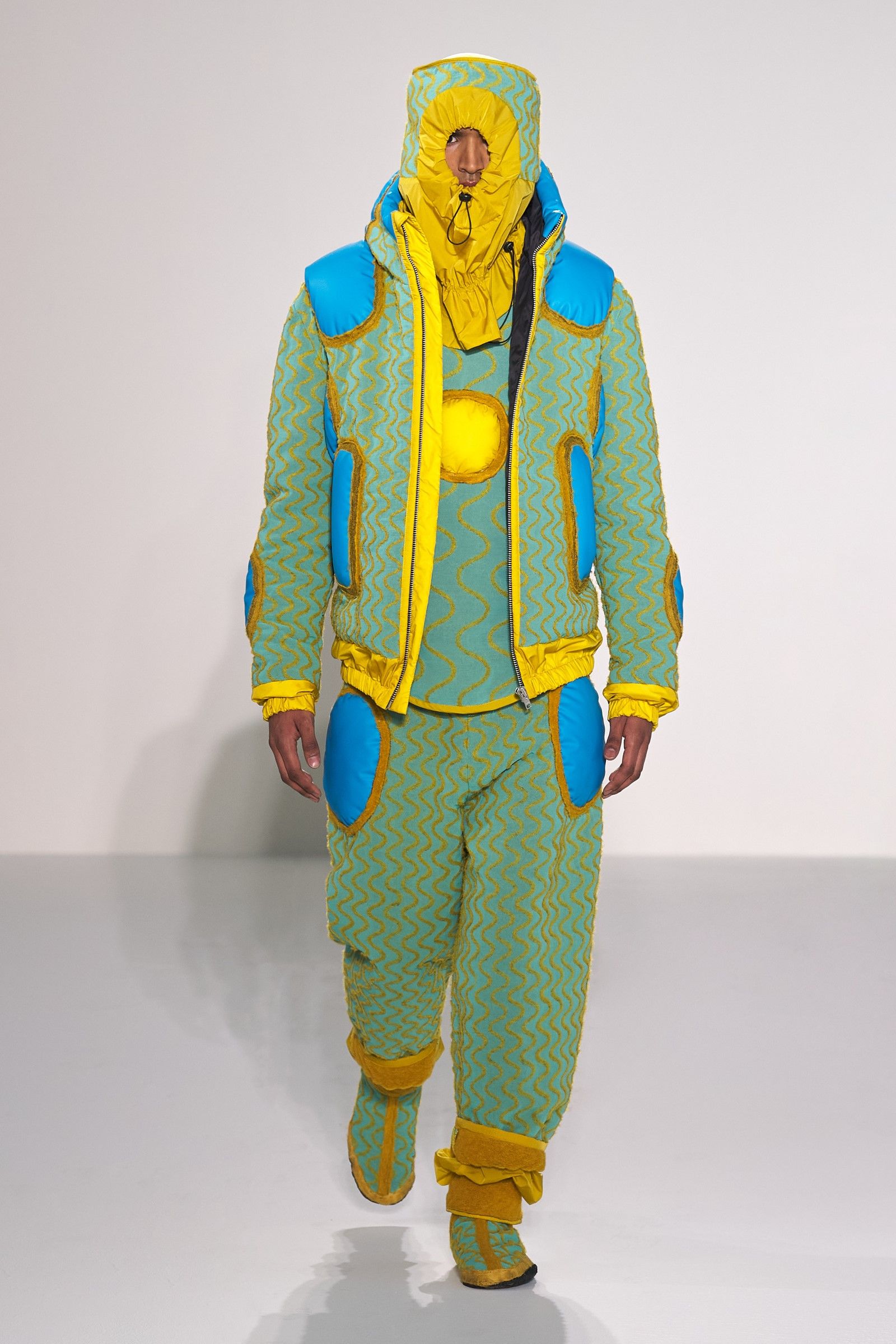 Tutto talento visivo e cromatico che però ha il pregio di condensarsi in capi funzionali, comprensibili ma sorprendenti che mette sullo stesso piano (e in modo del tutto plausibile) design presi in prestito dal mondo dell'hiking, dall'ambito medico e da quello dello snorkeling – come ad esempio la collaborazione con adidas che ha visto le Stan Smith collaborative di Green chiuse dentro guaine monocrome abbottonate longitudinalmente con chiusure dall’aspetto industriale, una collaborazione “nascosta” in cui chi indossa sa cosa sta indossando senza che la scarpa sia visibile all’esterno, mentre altre sneaker si caricano di gambali rigidi che le fanno assomigliare a Wellington Boot monumentali oppure sono ricoperte da elementi gonfiabili che ricordano le pompe di gonfiaggio degli sfigmomanometri.