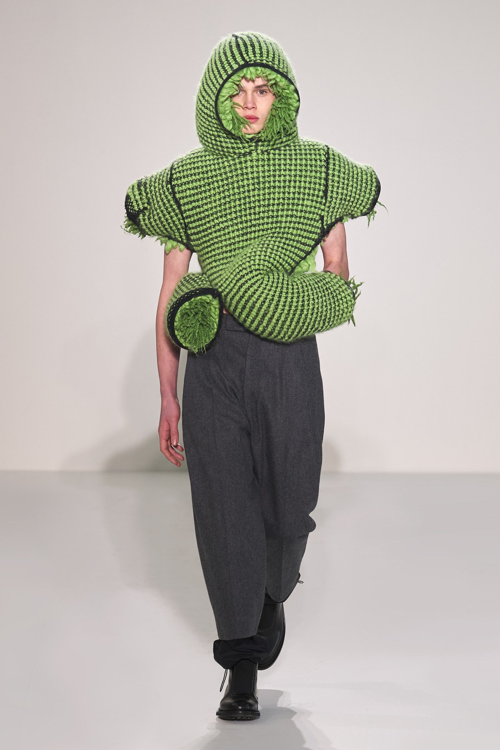 Ancora una volta si organizza, si razionalizza e si misura ciò che sembra illogico dall’esterno – l’elemento razionale testimoniato dall’armonia dei colori e dei materiali, anche se apparentemente idiosincratici,che si mantiene anche quando una manica esce dal petto di una giacca o patch gonfie interrompono i pattern reticolati di una serie di completi sportivi in velour. Il risultato finale, nelle parole stesse di Green, è una serie di «forme morbide, monumenti mobili innalzati a percorsi personali, foderati di memento ai sensi e inchiodati con un nuovo e determinato ottimismo».