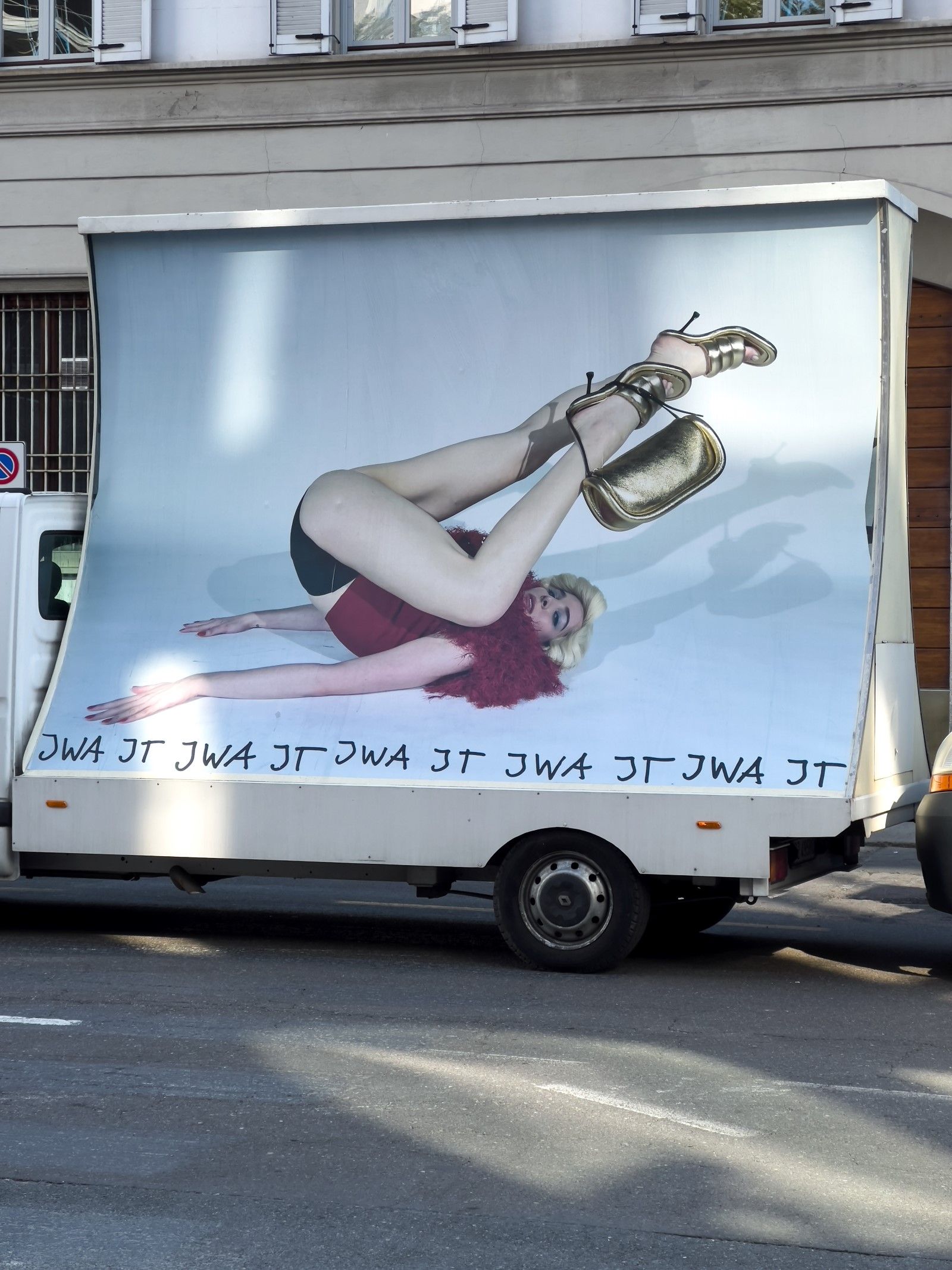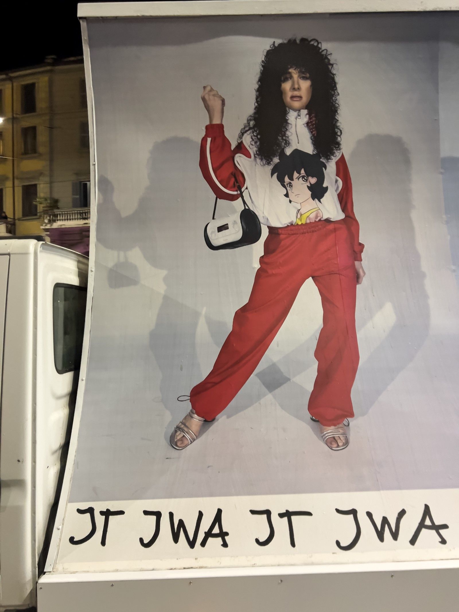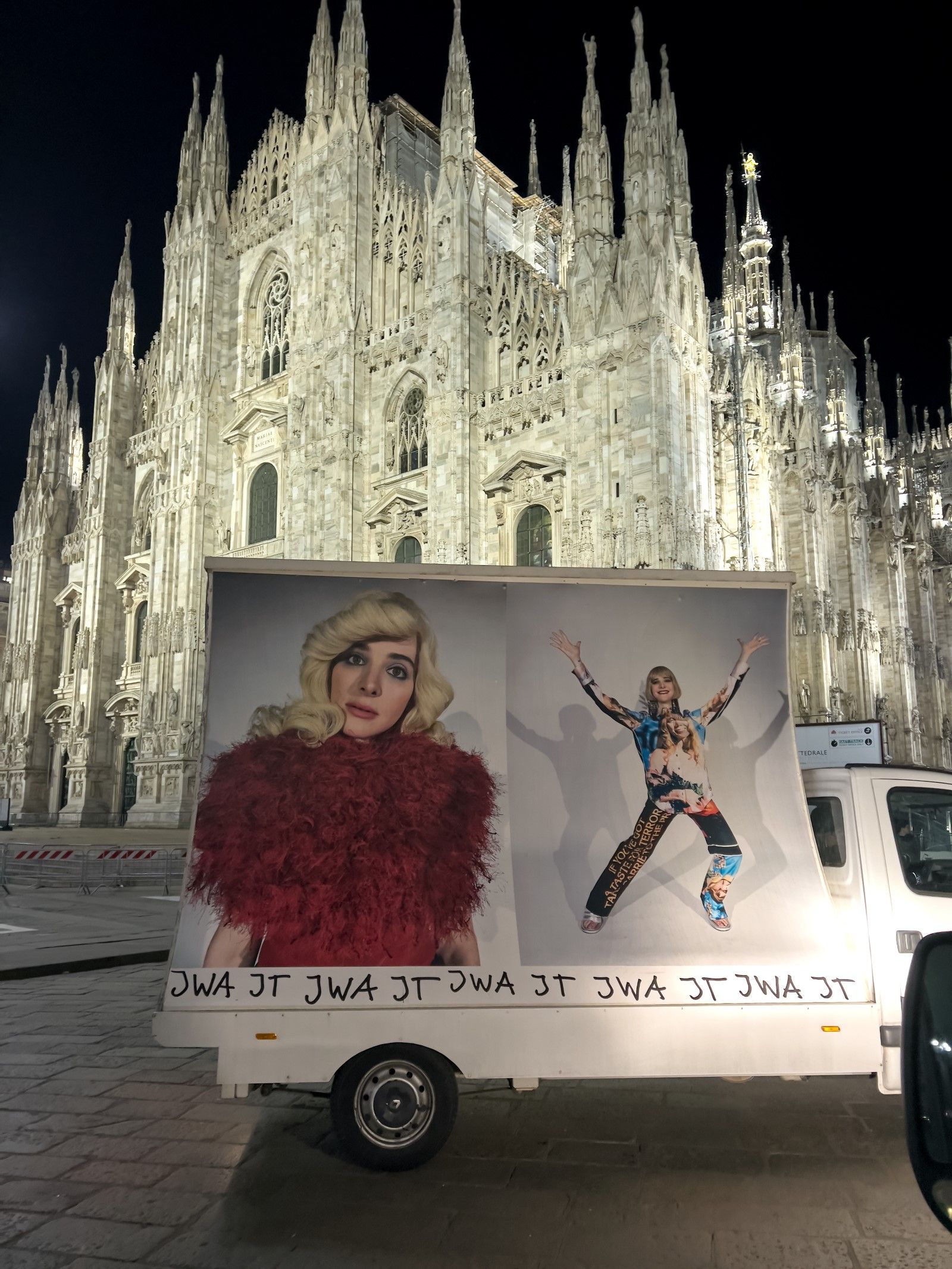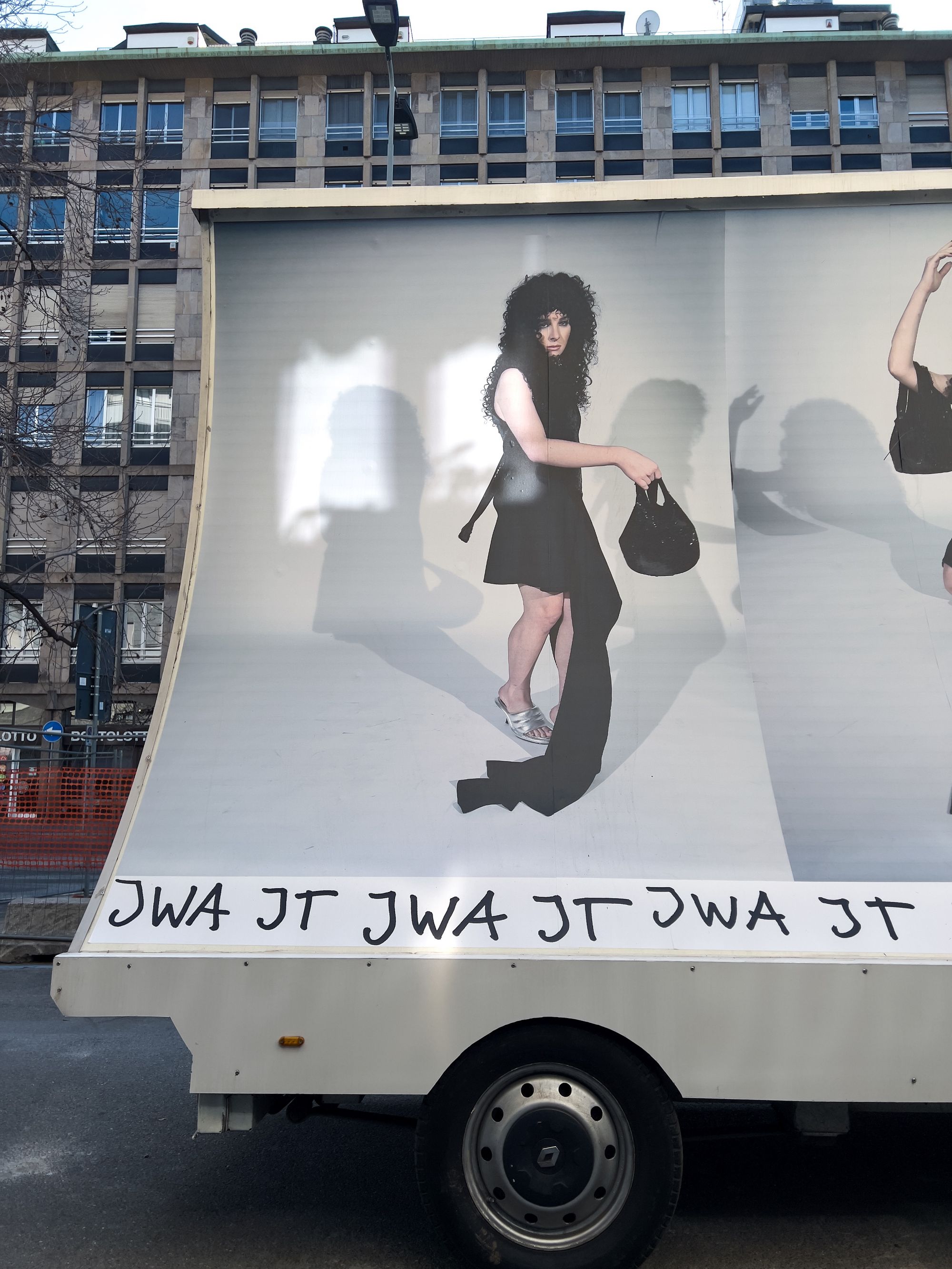 «Stampate come cartelloni pubblicitari e montate su furgoni, le immagini vengono poi riprese da Juergen Teller per le strade di Milano, nella terza e ultima azione che rende le immagini parti effimere ma ben visibili del paesaggio urbano. La moda che ha raccolto elementi dalla cultura popolare diventa essa stessa parte della cultura popolare. Il cerchio è chiuso e tuttavia lasciato aperto, in una fusione contorta di perversa ovvietà, perfettamente casuale».