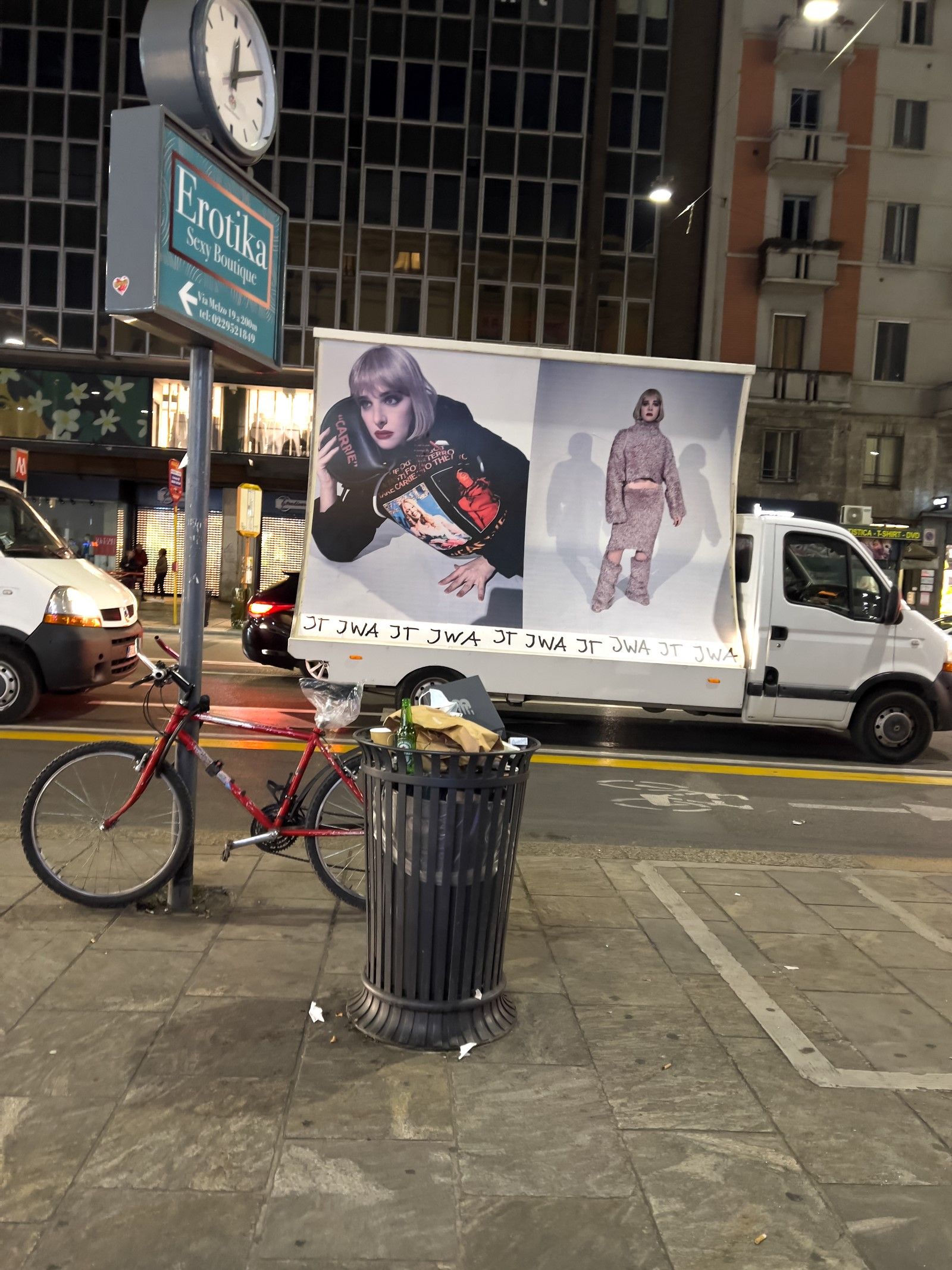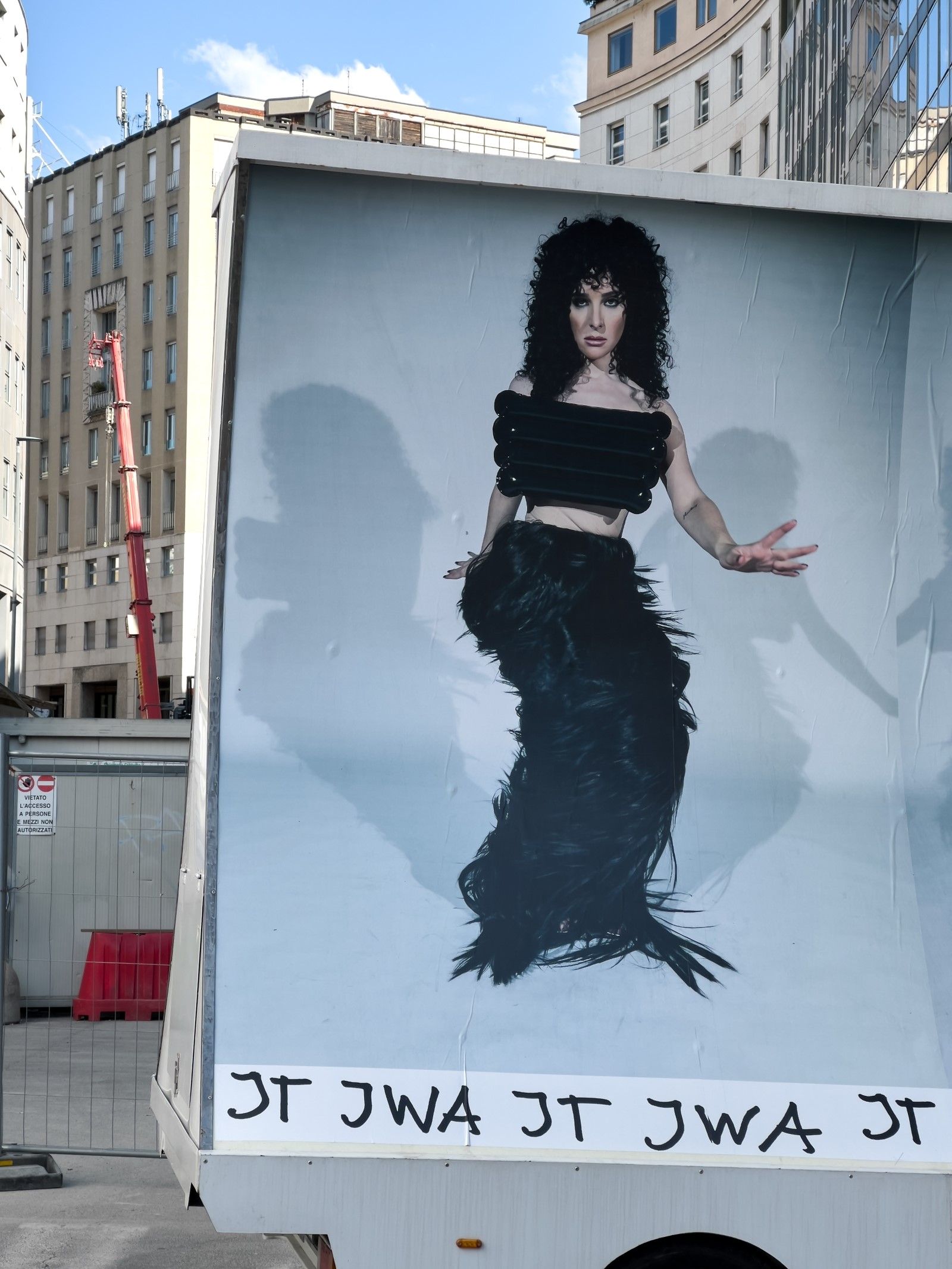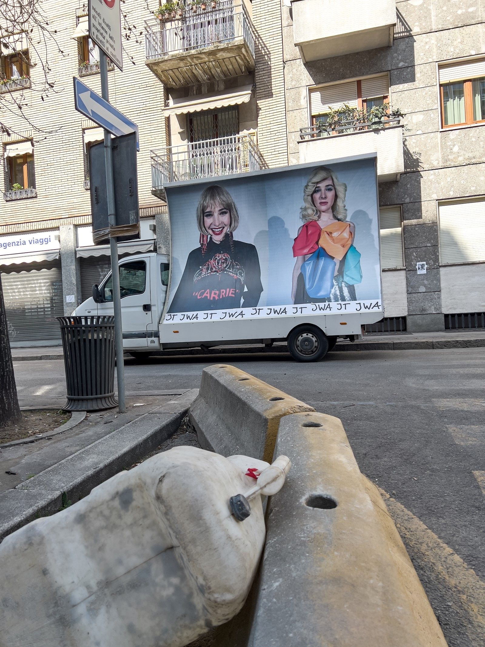 «Stampate come cartelloni pubblicitari e montate su furgoni, le immagini vengono poi riprese da Juergen Teller per le strade di Milano, nella terza e ultima azione che rende le immagini parti effimere ma ben visibili del paesaggio urbano. La moda che ha raccolto elementi dalla cultura popolare diventa essa stessa parte della cultura popolare. Il cerchio è chiuso e tuttavia lasciato aperto, in una fusione contorta di perversa ovvietà, perfettamente casuale».